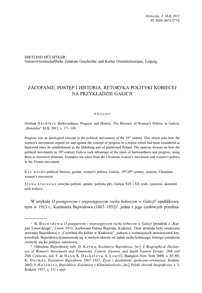 Historyka, T. XLII, 2012 PL ISSN 0073-277X DIETLIND HÜCHTKER Geisteswissenschaftliche Zentrum Geschichte und Kultur Ostmitteleuropas, Leipzig ZACOFANIE, POSTĘP I HISTORIA. RETORYKA POLITYKI KOBIECEJ NA PRZYKŁADZIE GALICJI Abstract Dietlind H ü c h t k e r, Backwardness, Progress and History. The Rhetoric of Women’s Politics in Galicia, „Historyka” XLII, 2012, s. 171–189 Progress was an ideological concept in the political movements of the 19th century. This article asks how the women’s movements argued for and against the concept of progress in a region which had been considered as backward since its establishment as the Habsburg part of partitioned Poland. The analysis focuses on how the political movements in 19th-century Galicia took advantage of the topoi of backwardness and progress, using them as rhetorical elements. Examples are taken from the Ukrainian women’s movement and women’s politics in the Zionist movement. K e y w o r d s: political rhetoric, gender, women’s politics, Galicia, 19th/20th century, zionism, Ukrainian women’s movement S ł o w a k l u c z o w e: retoryka polityki, gender, polityka płci, Galicja XIX i XX wiek, syjonizm, ukraiński ruch kobiecy W artykule O postępowym i niepostępowym ruchu kobiecym w Galicji1 opublikowanym w 1913 r., Kazimiera Bujwidowa (1867–1932)2, jedna z jego czołowych przedsta- 1 K. B u j w i d o w a, O postępowym i niepostępowym ruchu kobiecym w Galicji [przedruk z „Kurjera Lwowskiego”, Lwów 1913, Archiwum Odona Bujwida, Kraków]. Tłem artykułu było ostateczne zerwanie Bujwidowej z „Czytelnią dla kobiet w Krakowie”, jednym z ważniejszych stowarzyszeń krakowskich. Bujwidowa dystansowała się w tamtym okresie od żądań ruchu kobiecego, którego członkinie zwróciły się ku polityce narodowej. 2 Odnośnie Bujwidowej zob. D. K a ł w a, Kazimiera Bujwidowa, [w:] A Biographical Dictionary of Women′s Movements and Feminisms. Central, Eastern, and South Eastern Europe, 19th and 20th Centuries, red. F. de H a a n, K. D a s k a l o v a, A. L o u t f i, Budapest–New York 2008, s. 85–88; K. D o r m u s, Kazimiera Bujwidowa 1867–1932. Życie i działalność społeczno-oświatowa, Kraków 2002; J. H u l e w i c z, Bujwidowa, Kazimiera z Klimontowiczów, [w:] Polski słownik biograficzny, t. 3, Kraków 1937, s. 111 i nast. 172 Dietlind Hüchtker wicielek, pisała: „Ciemni, strasznie ciemni a zwłaszcza ciaśni jesteśmy”3. Stwierdzenie Bujwidowej w pierwszej chwili nie zaskakuje: zacofanie, zjawisko wsteczności w odniesieniu do Galicji było i jest powszechnie spotykanym motywem w literaturze przedmiotu, żeby nie powiedzieć swoistym toposem narracji historycznej o Galicji4. Bardzo często trudności związane z realizacją celów politycznych i przeprowadzaniem reform społecznych w ówczesnym dyskursie tłumaczono właśnie, różnie rozumianym i definiowanym, zacofaniem. Tradycję, konserwatyzm oraz przeciwstawianie się postępowi przypisywano często Kościołowi i szlachcie. Przede wszystkim w kontekście rusińskim5 używano w argumentacji pojęcia „niepełnego społeczeństwa”, mając na myśli to, że ludności mówiącej po rusińsku brakuje (własnej) elity. Dowodzono także, że monarchia Habsburgów traktuje region jak dostawcę surowców i utrudnia rozwój przemysłowy6. Tym, co wypowiedzi Bujwidowej czyni interesującym, jest w mniejszym stopniu jej opinia o galicyjskim ruchu kobiecym, a znacznie bardziej kontekst, w którym ją sformułowała. Autorce wspomnianej broszury chodziło o definicję postępowej polityki kobiecej. Za postępowe uważała ona żądanie powszechnych praw politycznych dla kobiet. Dopóki odmawiano im tych praw, wszyscy, którzy popierali to żądanie, byli postępowi, niezależnie od tego, czy uważali siebie za konserwatywnych czy postępowych i czy byli świadomi skali swoich roszczeń. I na odwrót, organizacje postrzegane jako postępowe, generalnie opowiadające się za równouprawieniem kobiet, odrzucając żądania prawa wyborczego dla kobiet, czy to z przyczyn taktycznych, czy też ponieważ wysuwane one były przez środowiska konserwatywne bądź klerykalne, reprezentowały według autorki „stanowisko wprost wsteczne”7 — tak na przykład socjaliści belgijscy i austriaccy. W Belgji obawiano się — pisze Bujwidowa — sklerykalizowania parlamentu przez głosy kobiet — dewotek, narzędzi w rękach księży, w Austrji obawiano się rzekomo, że gdyby socjaliści postawili żądanie czteroprzymiotnikowego prawa głosowania bez różnicy płci, to nawet samo czteroprzymiotnikowe prawo (bez owego przerażającego dodatku) mogło było nie przejść8. Zdaniem Bujwidowej postępowość nie była cechą żadnej partii, frakcji czy ruchu politycznego, lecz zależała od specyficznych treści i odpowiedniego zaangażowania, a zatem była możliwa do osiągnięcia także w Galicji. 3 K. B u j w i d o w a, dz. cyt., s. 11. D. H ü c h t k e r, Der „Mythos Galizien”. Versuch einer Historisierung, [w:] Die Nationalisierung von Grenzen. Zur Konstruktion nationaler Identität in sprachlich gemischten Grenzregionen, red. M. G. M ü l l e r, R. P e t r i, Marburg 2002, s. 81–107. 5 Używam pojęcia rusiński, ponieważ czyniła to także Natalja Kobryns’ka, na którą powołuję się w tym artykule. Ukraiński nie był w XIX w. jeszcze szeroko rozpowszechnionym pojęciem określającym narodowość ludności mówiącej po rusińsku, lecz było używane początkowo przez specyficzne ugrupowanie lub ruch, tzw. narodovci albo Młodorusinów wzorujących się na samookreśleniu Ukrainy wchodzącej w skład Imperium Rosyjskiego. Pojęcie upowszechniało się jako określenie narodowości do lat 20-tych XX w. Zob. K. J o b s t, Die ukrainische Nationalbewegung bis 1917, [w:] Geschichte der Ukraine, red. F. G o l c z e w s k i, Göttingen 1993, s. 158–171, O. S u b t e l n y, Ukraine. A History, Toronto 1994, s. 305. 6 Jednym z najbardziej 