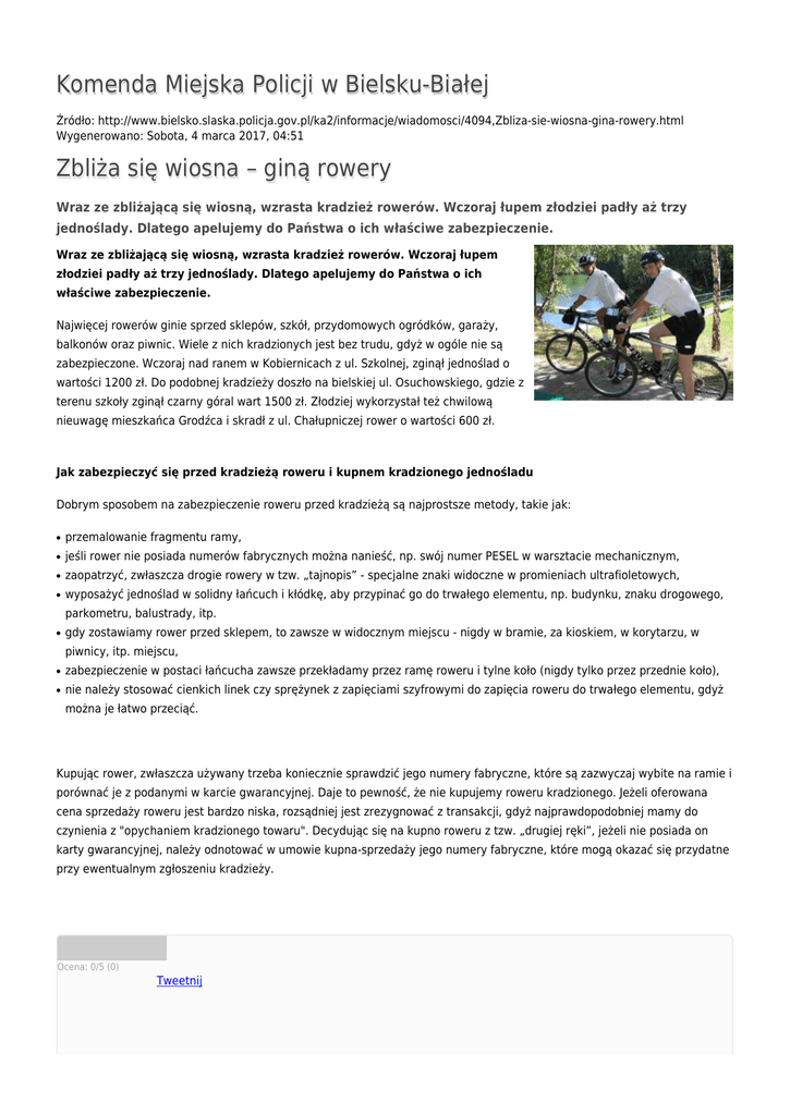 Komenda Miejska Policji w Bielsku-Białej Źródło: http://www.bielsko.slaska.policja.gov.pl/ka2/informacje/wiadomosci/4094,Zbliza-sie-wiosna-gina-rowery.html Wygenerowano: Sobota, 4 marca 2017, 04:51 Zbliża się wiosna – giną rowery Wraz ze zbliżającą się wiosną, wzrasta kradzież rowerów. Wczoraj łupem złodziei padły aż trzy jednoślady. Dlatego apelujemy do Państwa o ich właściwe zabezpieczenie. Wraz ze zbliżającą się wiosną, wzrasta kradzież rowerów. Wczoraj łupem złodziei padły aż trzy jednoślady. Dlatego apelujemy do Państwa o ich właściwe zabezpieczenie. Najwięcej rowerów ginie sprzed sklepów, szkół, przydomowych ogródków, garaży, balkonów oraz piwnic. Wiele z nich kradzionych jest bez trudu, gdyż w ogóle nie są zabezpieczone. Wczoraj nad ranem w Kobiernicach z ul. Szkolnej, zginął jednoślad o wartości 1200 zł. Do podobnej kradzieży doszło na bielskiej ul. Osuchowskiego, gdzie z terenu szkoły zginął czarny góral wart 1500 zł. Złodziej wykorzystał też chwilową nieuwagę mieszkańca Grodźca i skradł z ul. Chałupniczej rower o wartości 600 zł. Jak zabezpieczyć się przed kradzieżą roweru i kupnem kradzionego jednośladu Dobrym sposobem na zabezpieczenie roweru przed kradzieżą są najprostsze metody, takie jak: ● przemalowanie fragmentu ramy, ● jeśli rower nie posiada numerów fabrycznych można nanieść, np. swój numer PESEL w warsztacie mechanicznym, ● zaopatrzyć, zwłaszcza drogie rowery w tzw. „tajnopis” - specjalne znaki widoczne w promieniach ultrafioletowych, ● wyposażyć jednoślad w solidny łańcuch i kłódkę, aby przypinać go do trwałego elementu, np. budynku, znaku drogowego, parkometru, balustrady, itp. ● gdy zostawiamy rower przed sklepem, to zawsze w widocznym miejscu - nigdy w bramie, za kioskiem, w korytarzu, w piwnicy, itp. miejscu, ● zabezpieczenie w postaci łańcucha zawsze przekładamy przez ramę roweru i tylne koło (nigdy tylko przez przednie koło), ● nie należy stosować cienkich linek czy sprężynek z zapięciami szyfrowymi do zapięcia roweru do trwałego elementu, gdyż można je łatwo przeciąć. Kupując rower, zwłaszcza używany trzeba koniecznie sprawdzić jego numery fabryczne, które są zazwyczaj wybite na ramie i porównać je z podanymi w karcie gwarancyjnej. Daje to pewność, że nie kupujemy roweru kradzionego. Jeżeli oferowana cena sprzedaży roweru jest bardzo niska, rozsądniej jest zrezygnować z transakcji, gdyż najprawdopodobniej mamy do czynienia z "opychaniem kradzionego towaru". Decydując się na kupno roweru z tzw. „drugiej ręki”, jeżeli nie posiada on karty gwarancyjnej, należy odnotować w umowie kupna-sprzedaży jego numery fabryczne, które mogą okazać się przydatne przy ewentualnym zgłoszeniu kradzieży. Ocena: 0/5 (0) Tweetnij