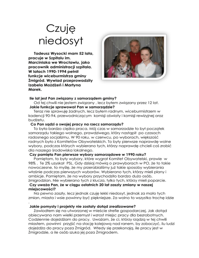 Czuję niedosyt Tadeusz Wysocki mam 52 lata, pracuje w Szpitalu im. Marciniaka we Wrocławiu, jako pracownik administracji szpitala. W latach 1990-1994 pełnił funkcje wiceburmistrza gminy Żmigród. Wywiad przeprowadziły Izabela Możdżeń i Martyna Marek. Ile lat jest Pan związany z samorządem gminy? Od tej chwili nie jestem związany , lecz byłem związany przez 12 lat. Jakie funkcje sprawował Pan w samorządzie? Teraz nie sprawuję żadnych, lecz byłem radnym, wiceburmistrzem w kadencji 90-94, przewodniczącym komisji oświaty i komisji rewizyjnej oraz budżetu. Co Pan sądzi o swojej pracy na rzecz samorządu? To była bardzo ciężka praca. Mój czas w samorzadzie to był początek samorządu takiego wolnego, prawdziwego, który nastąpił po czasach radosnego socjalizmu. W 90 roku, w czerwcu, po wyborach, większość radnych było z Komitetów Obywatelskich. To były pierwsze naprawdę wolne wybory, podczas których wybierano tych, którzy naprawdę chcieli coś zrobić dla naszego środowiska lokalnego. Czy pamięta Pan pierwsze wybory samorządowe w 1990 roku? Pamiętam, to były wybory, które wygrał Komitet Obywatelski, prawie w 98% . Te 2% uzyskał PSL. Gdy dzisiaj mówią o prawyborach w PO, że to takie nowoczesne, to myślę, że my przerabialiśmy już takie sposoby wybierania właśnie podczas pierwszych wyborów. Wybierano tych, którzy mieli plany i ambicje. Pamiętam, że na wybory przychodziło bardzo dużo osób, żmigrodzian. Nie wybierano tych z klucza, tylko tych, którzy mieli poparcie. Czy uważa Pan, że w ciągu ostatnich 20 lat zaszły zmiany w naszej miejscowości? Na pewno zaszły, lecz jednak czuję lekki niedosyt, jednak za mało tych zmian, miasta i wsie powinny być piękniejsze. Za wolno to wszystko trochę idzie . Jakie pomysły i projekty nie zostały dotąd zrealizowane? Zawiodłem się na utworzonej w mieście strefie gospodarczej, Jak dotąd obiecywano nam wielki przemysł i wzrost miejsc pracy dla bezrobotnych. Codziennie dojeżdżam do pracy. Uważam, że ci, którzy rządzą w tej chwili miastem, powinni przyjść na stację kolejową nad ranem, by zobaczyć, ilu ludzi dojeżdża do pracy poza Żmigród. Wtedy się przekonają, ile pracy jest w Żmigrodzie, a ile osób szuka jej poza Żmigrodem. Którą z inwestycji gminnych uważa Pan za najważniejszą w ostatnich latach? Ja uważam, że najważniejszą inwestycją było wybudowanie oczyszczalni ścieków w latach 93/94. Ta inwestycja pozwoliła na to, by w mieście zaczęto budować mieszkania, miasto wtedy stało się miastem otwartym. Jak decyzja, którą podejmowała Pan jako burmistrz była najtrudniejsza? Myślę, że te, które dotyczyły ludzi. Czyli tam, gdzie trzeba było zmieniać mentalność ludzi, struktury. Każda dotyczyła indywidualnie osób, które pracowały w danym zakładzie pracy, który stał się nieopłacalny. Na przykład dużym wyzwaniem była likwidacja POM-u, na czym wiele osób ucierpiało, tracąc pracę, lecz wtedy POM zagrażał budżetowi gminy. Co, Pana zdaniem, jest aktualnie największą potrzebą miasta i gminy? Moim zdaniem ogólny rozwój miasta i okolic. Należy się rozwijać jak najszybciej, trzeba korzystać z pieniędzy unijnych, bo kryzys i nas dosięga. Myślę, że trzeba rozwijać miasto, tworzyć miejsca pracy dla ludzi, by to napędzało koniunkturę miasta i gminy. A jakie cechy powinien posiadać człowiek, który udziela się w pracy samorządowej? Przede wszystkim musi być uczciwy i bezinteresowny, a takich jest mało. Co najbardziej utrudniało Panu pracę jako radnej/radnemu? Teraz mnie to nie dotyczy, lecz to, co mi utrudniało dawniej tę pracę, to rozgrywki polityczne . Nie liczył się interes ogółu, tylko partyjne rozgrywki. Każdy ciągnął w stronę tego, co dana grupa sobie wymyśliła i co chciała ugrać dla swoich. Jakie przyjemne strony ma praca na rzecz środowiska lokalnego? Po latach mogę powiedzieć, że największą wartością jest zwykła wdzięczność ludzka. Ktoś zaczepia mnie na ulicy i dziękuje mi za to wszystko, co zrobiłem. Pamięta, że byłem uczciwy. To takie zwykłe, ale bardzo ważne dla mnie ludzkie sprawy. Czy Pana zdaniem Polacy zbudowali już społeczeństwo obywatelskie? Nie, jeszcze nie. Jeszcze nam sporo brakuje. Myślę, że jeszcze jakieś 10, 15 lat trzeba nam, by osiągnąć taki poziom jak na zachodzie. Na zakończenie: jakie ma Pan marzenia, hobby? Co Pan lubi robić w wolnym czasie? Uwielbiam odpoczywać (śmiech), spacerować, turystykę, przede wszystkim uwielbiam spędzać czas w górach z rodziną i znajomymi. Dziękujemy bardzo za wywiad. Również dziękuję .