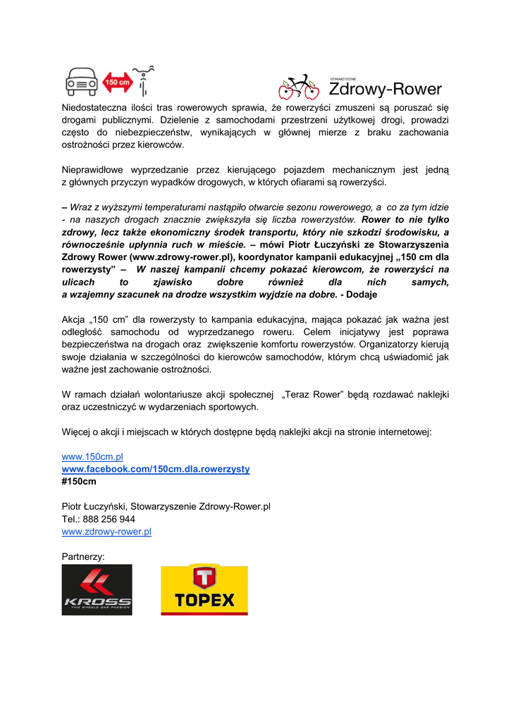 Niedostateczna ilości tras rowerowych sprawia, że rowerzyści zmuszeni są poruszać się drogami publicznymi. Dzielenie z samochodami przestrzeni użytkowej drogi, prowadzi często do niebezpieczeństw, wynikających w głównej mierze z braku zachowania ostrożności przez kierowców. Nieprawidłowe wyprzedzanie przez kierującego pojazdem mechanicznym jest jedną z głównych przyczyn wypadków drogowych, w których ofiarami są rowerzyści. – Wraz z wyższymi temperaturami nastąpiło otwarcie sezonu rowerowego, a co za tym idzie - na naszych drogach znacznie zwiększyła się liczba rowerzystów. Rower to nie tylko zdrowy, lecz także ekonomiczny środek transportu, który nie szkodzi środowisku, a równocześnie upłynnia ruch w mieście. – mówi Piotr Łuczyński ze Stowarzyszenia Zdrowy Rower (www.zdrowy-rower.pl), koordynator kampanii edukacyjnej „150 cm dla rowerzysty” – W naszej kampanii chcemy pokazać kierowcom, że rowerzyści na ulicach to zjawisko dobre również dla nich samych, a wzajemny szacunek na drodze wszystkim wyjdzie na dobre. - Dodaje Akcja „150 cm” dla rowerzysty to kampania edukacyjna, mająca pokazać jak ważna jest odległość samochodu od wyprzedzanego roweru. Celem inicjatywy jest poprawa bezpieczeństwa na drogach oraz zwiększenie komfortu rowerzystów. Organizatorzy kierują swoje działania w szczególności do kierowców samochodów, którym chcą uświadomić jak ważne jest zachowanie ostrożności. W ramach działań wolontariusze akcji społecznej „Teraz Rower” będą rozdawać naklejki oraz uczestniczyć w wydarzeniach sportowych. Więcej o akcji i miejscach w których dostępne będą naklejki akcji na stronie internetowej: www.150cm.pl www.facebook.com/150cm.dla.rowerzysty #150cm Piotr Łuczyński, Stowarzyszenie Zdrowy-Rower.pl Tel.: 888 256 944 www.zdrowy-rower.pl Partnerzy: