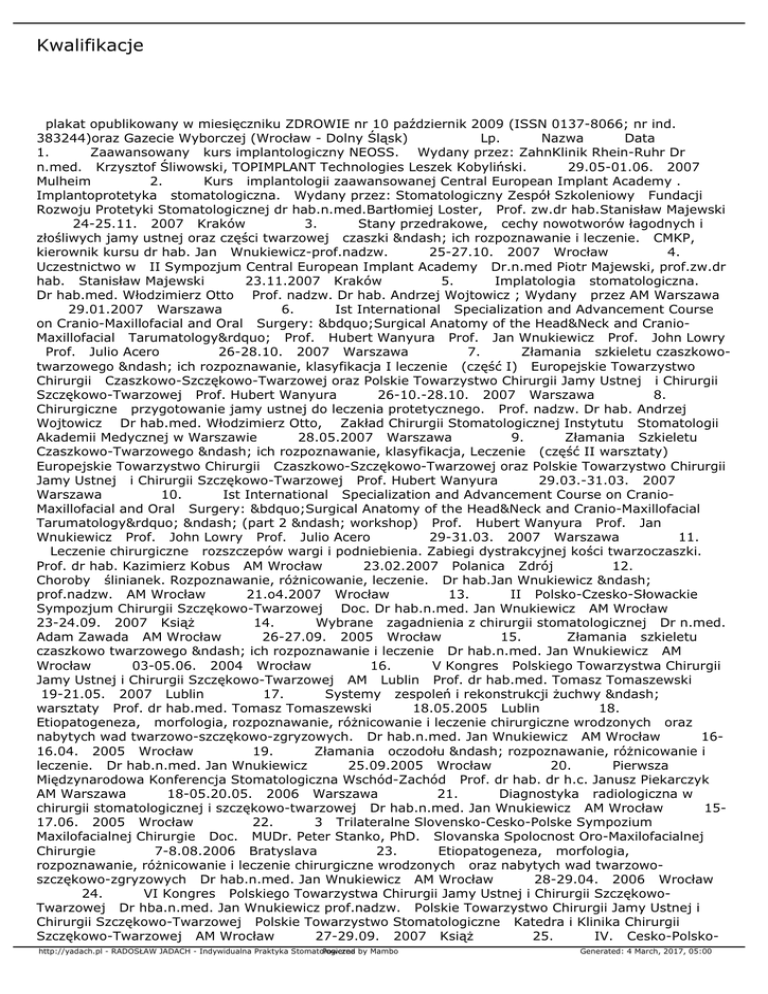 Kwalifikacje plakat opublikowany w miesięczniku ZDROWIE nr 10 październik 2009 (ISSN 0137-8066; nr ind. 383244)oraz Gazecie Wyborczej (Wrocław - Dolny Śląsk) Lp. Nazwa Data 1. Zaawansowany kurs implantologiczny NEOSS. Wydany przez: ZahnKlinik Rhein-Ruhr Dr n.med. Krzysztof Śliwowski, TOPIMPLANT Technologies Leszek Kobyliński. 29.05-01.06. 2007 Mulheim 2. Kurs implantologii zaawansowanej Central European Implant Academy . Implantoprotetyka stomatologiczna. Wydany przez: Stomatologiczny Zespół Szkoleniowy Fundacji Rozwoju Protetyki Stomatologicznej dr hab.n.med.Bartłomiej Loster, Prof. zw.dr hab.Stanisław Majewski 24-25.11. 2007 Kraków 3. Stany przedrakowe, cechy nowotworów łagodnych i złośliwych jamy ustnej oraz części twarzowej czaszki – ich rozpoznawanie i leczenie. CMKP, kierownik kursu dr hab. Jan Wnukiewicz-prof.nadzw. 25-27.10. 2007 Wrocław 4. Uczestnictwo w II Sympozjum Central European Implant Academy Dr.n.med Piotr Majewski, prof.zw.dr hab. Stanisław Majewski 23.11.2007 Kraków 5. Implatologia stomatologiczna. Dr hab.med. Włodzimierz Otto Prof. nadzw. Dr hab. Andrzej Wojtowicz ; Wydany przez AM Warszawa 29.01.2007 Warszawa 6. Ist International Specialization and Advancement Course on Cranio-Maxillofacial and Oral Surgery: „Surgical Anatomy of the Head&Neck and CranioMaxillofacial Tarumatology” Prof. Hubert Wanyura Prof. Jan Wnukiewicz Prof. John Lowry Prof. Julio Acero 26-28.10. 2007 Warszawa 7. Złamania szkieletu czaszkowotwarzowego – ich rozpoznawanie, klasyfikacja I leczenie (część I) Europejskie Towarzystwo Chirurgii Czaszkowo-Szczękowo-Twarzowej oraz Polskie Towarzystwo Chirurgii Jamy Ustnej i Chirurgii Szczękowo-Twarzowej Prof. Hubert Wanyura 26-10.-28.10. 2007 Warszawa 8. Chirurgiczne przygotowanie jamy ustnej do leczenia protetycznego. Prof. nadzw. Dr hab. Andrzej Wojtowicz Dr hab.med. Włodzimierz Otto, Zakład Chirurgii Stomatologicznej Instytutu Stomatologii Akademii Medycznej w Warszawie 28.05.2007 Warszawa 9. Złamania Szkieletu Czaszkowo-Twarzowego – ich rozpoznawanie, klasyfikacja, Leczenie (część II warsztaty) Europejskie Towarzystwo Chirurgii Czaszkowo-Szczękowo-Twarzowej oraz Polskie Towarzystwo Chirurgii Jamy Ustnej i Chirurgii Szczękowo-Twarzowej Prof. Hubert Wanyura 29.03.-31.03. 2007 Warszawa 10. Ist International Specialization and Advancement Course on CranioMaxillofacial and Oral Surgery: „Surgical Anatomy of the Head&Neck and Cranio-Maxillofacial Tarumatology” – (part 2 – workshop) Prof. Hubert Wanyura Prof. Jan Wnukiewicz Prof. John Lowry Prof. Julio Acero 29-31.03. 2007 Warszawa 11. Leczenie chirurgiczne rozszczepów wargi i podniebienia. Zabiegi dystrakcyjnej kości twarzoczaszki. Prof. dr hab. Kazimierz Kobus AM Wrocław 23.02.2007 Polanica Zdrój 12. Choroby ślinianek. Rozpoznawanie, różnicowanie, leczenie. Dr hab.Jan Wnukiewicz – prof.nadzw. AM Wrocław 21.o4.2007 Wrocław 13. II Polsko-Czesko-Słowackie Sympozjum Chirurgii Szczękowo-Twarzowej Doc. Dr hab.n.med. Jan Wnukiewicz AM Wrocław 23-24.09. 2007 Książ 14. Wybrane zagadnienia z chirurgii stomatologicznej Dr n.med. Adam Zawada AM Wrocław 26-27.09. 2005 Wrocław 15. Złamania szkieletu czaszkowo twarzowego – ich rozpoznawanie i leczenie Dr hab.n.med. Jan Wnukiewicz AM Wrocław 03-05.06. 2004 Wrocław 16. V Kongres Polskiego Towarzystwa Chirurgii Jamy Ustnej i Chirurgii Szczękowo-Twarzowej AM Lublin Prof. dr hab.med. Tomasz Tomaszewski 19-21.05. 2007 Lublin 17. Systemy zespoleń i rekonstrukcji żuchwy – warsztaty Prof. dr hab.med. Tomasz Tomaszewski 18.05.2005 Lublin 18. Etiopatogeneza, morfologia, rozpoznawanie, różnicowanie i leczenie chirurgiczne wrodzonych oraz nabytych wad twarzowo-szczękowo-zgryzowych. Dr hab.n.med. Jan Wnukiewicz AM Wrocław 1616.04. 2005 Wrocław 19. Złamania oczodołu – rozpoznawanie, różnicowanie i leczenie. Dr hab.n.med. Jan Wnukiewicz 25.09.2005 Wrocław 20. Pierwsza Międzynarodowa Konferencja Stomatologiczna Wschód-Zachód Prof. dr hab. dr h.c. Janusz Piekarczyk AM Warszawa 18-05.20.05. 2006 Warszawa 21. Diagnostyka radiologiczna w chirurgii stomatologicznej i szczękowo-twarzowej Dr hab.n.med. Jan Wnukiewicz AM Wrocław 1517.06. 2005 Wrocław 22. 3 Trilateralne Slovensko-Cesko-Polske Sympozium Maxilofacialnej Chirurgie Doc. MUDr. Peter Stanko, PhD. Slovanska Spolocnost Oro-Maxilofacialnej Chirurgie 7-8.08.2006 Bratyslava 23. Etiopatogeneza, morfologia, rozpoznawanie, różnicowanie i leczenie chirurgiczne wrodzonych oraz nabytych wad twarzowoszczękowo-zgryzowych Dr hab.n.med. Jan Wnukiewicz AM Wrocław 28-29.04. 2006 Wrocław 24. VI Kongres Polskiego Towarzystwa Chirurgii Jamy Ustnej i Chirurgii SzczękowoTwarzowej Dr hba.n.med. Jan Wnukiewicz prof.nadzw. Polskie Towarzystwo Chirurgii Jamy Ustnej i Chirurgii Szczękowo-Twarzowej Polskie Towarzystwo Stomatologiczne Katedra i Klinika Chirurgii Szczękowo-Twarzowej AM Wrocław 27-29.09. 2007 Książ 25. IV. Cesko-Polskohttp://yadach.pl - RADOSŁAW JADACH - Indywidualna Praktyka Stomatologiczna Powered by Mambo Generated: 4 March, 2017, 05:00 Slovenskeho Trilateralniho Sympozia Maxilofacialni Chirurgie MUDr. Jan Syrovatka 20-22.09. 2007 Ostrava 26. Zagrożenia cywilizacyjne i profilaktyka chorób jamy ustnej. Prof. dr hab. Marek Ziętek PTS Wrocław 18-20.01. 2006 Wrocław 27. Podnoszenie dna zatoki szczękowej – procedury zabiegowe i decyzje w oparciu o praktyczne doświadczenie kliniczne oraz udokumentowane przypadki. Prof. Stephen Wallace ; USA 18.04.2008 28. Nowoczesne koncepcje leczenia i zarządzanie komplikacjami przy użyciu technik sterowanej regeneracji kości i tkanek Prof. Massimo Simion; Italy 19.04.2008 29. Współczesne metody diagnostyczno-terapeutyczne w implantologii Dr n.med. Beata Ostrowska-Suliborska Dr n.med. Rafał Koszowski Dr n.med. Tadeusz Morawiec Dr n.med. Krzysztof Awiłło 18.04.2008 30. Zaawansowany kurs implantologiczny CEIA Dr n.med. Piotr Majewski Prof. zw. Dr hab. Stanisław Majewski 22-23.11. 2008 31. Nowa
