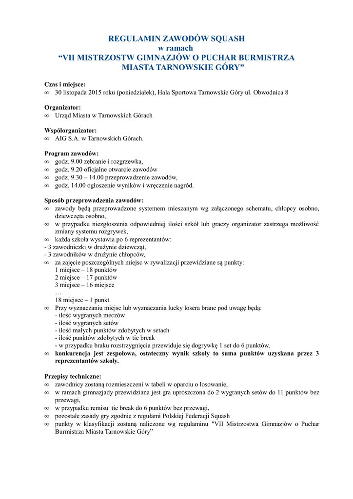 REGULAMIN ZAWODÓW SQUASH w ramach “VII MISTRZOSTW GIMNAZJÓW O PUCHAR BURMISTRZA MIASTA TARNOWSKIE GÓRY” Czas i miejsce: • 30 listopada 2015 roku (poniedziałek), Hala Sportowa Tarnowskie Góry ul. Obwodnica 8 Organizator: • Urząd Miasta w Tarnowskich Górach Współorganizator: • AIG S.A. w Tarnowskich Górach. Program zawodów: • godz. 9.00 zebranie i rozgrzewka, • godz. 9.20 oficjalne otwarcie zawodów • godz. 9.30 – 14.00 przeprowadzenie zawodów, • godz. 14.00 ogłoszenie wyników i wręczenie nagród. Sposób przeprowadzenia zawodów: • zawody będą przeprowadzone systemem mieszanym wg załączonego schematu, chłopcy osobno, dziewczęta osobno, • w przypadku niezgłoszenia odpowiedniej ilości szkół lub graczy organizator zastrzega możliwość zmiany systemu rozgrywek, • każda szkoła wystawia po 6 reprezentantów: - 3 zawodniczki w drużynie dziewcząt, - 3 zawodników w drużynie chłopców, • za zajęcie poszczególnych miejsc w rywalizacji przewidziane są punkty: 1 miejsce – 18 punktów 2 miejsce – 17 punktów 3 miejsce – 16 miejsce … 18 miejsce – 1 punkt • Przy wyznaczaniu miejsc lub wyznaczania lucky losera brane pod uwagę będą: - ilość wygranych meczów - ilość wygranych setów - ilość małych punktów zdobytych w setach - ilość punktów zdobytych w tie break - w przypadku braku rozstrzygnięcia przewiduje się dogrywkę 1 set do 6 punktów. • konkurencja jest zespołowa, ostateczny wynik szkoły to suma punktów uzyskana przez 3 reprezentantów szkoły. Przepisy techniczne: • zawodnicy zostaną rozmieszczeni w tabeli w oparciu o losowanie, • w ramach gimnazjady przewidziana jest gra uproszczona do 2 wygranych setów do 11 punktów bez przewagi, • w przypadku remisu tie break do 6 punktów bez przewagi, • pozostałe zasady gry zgodnie z regułami Polskiej Federacji Squash • punkty w klasyfikacji zostaną naliczone wg regulaminu "VII Mistrzostwa Gimnazjów o Puchar Burmistrza Miasta Tarnowskie Góry” Sprawy organizacyjne: • każdy zawodnik musi posiadać zaświadczenie lekarskie o braku przeciwwskazań do udziału w zawodach lub pisemną zgodę rodziców na udział w gimnazjadzie, a także ważną legitymację szkolną, • za reprezentację szkoły odpowiedzialni są opiekunowie, • reprezentację szkoły obowiązuje strój sportowy (koszulka, spodenki, obuwie sportowe o białej podeszwie), • kibice mogą oglądać zawody na terenie holu przy kortach squash, • dodatkowe informacje można uzyskać pod numerem telefonu 505-980-268, Pan Tomasz Pąchalski, • do interpretacji Regulaminu Zawodów ma prawo organizator. Nagrody: • za przystąpienie do rywalizacji dla każdej szkoły przewidziany jest dyplom, • dla pierwszego miejsca dla szkoły przewidziany jest puchar oraz po 3 medale, osobno w kategorii dziewcząt i chłopców , • dla drugiego i trzeciego miejsca przewidziane są po 3 medale, osobno w kategorii dziewcząt i chłopców , • puchar i medale ufundowane przez Burmistrza Miasta Tarnowskie Góry. Zgłoszenie do zawodów: • Wykaz zawodników prosimy przesyłać na załączonym formularzu zgłoszeniowym, do dnia 26.11.2015 r. do godziny 9:00 na adres: Agencja Inicjatyw Gospodarczych S.A. 42-600 Tarnowskie Góry, ul. Obwodnica 8 z dopiskiem „ GIMNAZJADA- Squash ”, lub fax 32/285-80-30 e-mail: [email protected] Załącznik: − − karty zgłoszeniowe tabela rozgrywek SERDECZNIE ZAPRASZAMY Hala Sportowa w Tarnowskich Górach KARTA ZGŁOSZENIOWA- GIMNAZJADA ZAWODY SQUASH – Hala Sportowa, ul. Obwodnica 8, Tarnowskie Góry Pełna nazwa szkoły DATA Pieczątka szkoły Podpis dyrektora DZIEWCZĘTA IMIĘ NAZWISKO 1. 2. 3. CHŁOPCY 1. 2. 3. Podpis nauczyciela WF IMIĘ NAZWISKO