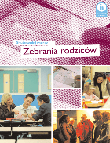 ii Poradnik dla rodziców Skuteczniej razem Zebrania rodziców Zebrania rodziców to ważne spotkania, podczas których rodzice mają okazję do porozmawiania na temat postępów dziecka w nauce. Rodzice mogą porozmawiać na temat wszystkich spraw dotyczących dziecka z jego wychowawcą lub z nauczycielami poszczególnych przedmiotów (w przypadku szkoły średniej). Udział w zebraniach rodziców umożliwia zatem większe zaangażowanie w edukację dziecka. Rodzice uczą się, jak zapewniać dziecku praktyczne wsparcie i jak dokonywać wyborów. Dzieci osiągają lepsze wyniki w nauce, gdy rodzice angażują się w ich edukację i współpracują ze szkołą. W jaki sposób udział w zebraniach rodzicielskich zwiększa zaangażowanie rodziców w edukację dziecka Zebrania rodziców to okazja do zadawania pytań i dzielenia się informacjami na temat dziecka i jego uczenia się. Spotkania takie to również okazja do umocnienia partnerskiej współpracy z nauczycielem dziecka.To z kolei ułatwia nauczycielowi pracę z uczniem. Czasami rodzicom trudno jest uczestniczyć w zebraniach z różnych powodów. Zdarza się, że rodzice uważają, że nauczyciel dziecka poświęca im zbyt mało czasu. Wiele szkół jest tego świadome i stara się tak organizować zebrania, aby każdy rodzic jak najbardziej z nich skorzystał. Aby umożliwić rodzicom udział w zebraniach, szkoły proponują różne udogodnienia: > żłobek dla małych dzieci; > obecność osoby towarzyszącej (np. znajomego, krewnego) lub tłumacza; > umawianie rodziców na rozmowę z wybranym nauczycielem na konkretną godzinę; > możliwość spotkania z nauczycielem w innym terminie, jeżeli termin zebrania jest dla rodziców niedogodny; > obecność dziecka na zebraniu, aby wszyscy zainteresowani mogli uczestniczyć w rozmowie; > umożliwienie rodzicom rozmowy z innymi przedstawicielami kadry pedagogicznej, którzy znają dziecko; > umożliwienie rodzicom przeglądania przykładów pracy ucznia podczas oczekiwania na rozmowę. Osoby zainteresowane powyższymi udogodnieniami powinny zwrócić się w tej sprawie do szkoły. Jak przygotować się do zebrania Tuż przed zebraniem rodzice otrzymują zwykle raport na temat postępów dziecka w nauce. Warto taki raport dokładnie przeczytać i porozmawiać o nim z dzieckiem, a następnie przygotować sobie pytania, jakie chciałoby się zadać nauczycielowi. W części zatytułowanej Next Steps raportu zawarte są zwykle zalecenia nauczyciela dotyczące dalszej nauki dziecka. Od tego można zacząć rozmowę z nauczycielem na temat postępów i osiągnięć dziecka w nauce. Na zebraniu warto także skorzystać z okazji i poprosić nauczyciela o wyjaśnienie wszystkich niejasnych rzeczy w raporcie. Oto przykładowe pytania, jakie warto zadać na zebraniu: > Czy moje dziecko dobrze się czuje w szkole? > Czy moje dziecko jest aktywne na lekcjach? > Co jeszcze można by powiedzieć na temat mocnych stron dziecka i jak dałoby się je jeszcze bardziej wzmocnić? > Czego teraz moje dziecko będzie się uczyło? > W jaki sposób mogę pomóc dziecku w nauce w domu? Rozmowa na te tematy umożliwia rodzicom i nauczycielom lepsze zrozumienie i zdefiniowanie ich poszczególnych ról. Dzieci uczą się lepiej, gdy wszystkie osoby zaangażowane w ich edukację dzielą się informacjami na ich temat. Nauczyciel, który wie, czym dany uczeń zajmuje się po lekcjach, może wykorzystać to do usprawnienia procesu uczenia się w szkole. O czym warto powiedzieć nauczycielom: > o zainteresowaniach i zajęciach pozaszkolnych dziecka; > o tym, jak zdaniem rodziców dziecko radzi sobie z nauką; > o zmartwieniach i kłopotach dziecka; > o wszelkich zmianach w sytuacji rodzinnej dziecka. Informacje na temat spraw nie związanych bezpośrednio ze szkołą mogą się przydać nauczycielowi, ale rodzice nie muszą o nich mówić, jeżeli sobie tego nie życzą. Udział w zebraniach rodziców może zatem w dużym stopniu przyczynić się do usprawnienia procesu uczenia się dziecka. Spotkania takie umożliwiają rodzicom aktywne śledzenie postępów dziecka. Szkoły cenią sobie poglądy rodziców i chętnie udzielają praktycznych wskazówek, jak pomagać dziecku w nauce w domu. Co na temat zebrań mówią rodzice... „To okazja, żeby poznać nauczycieli.” „Chcemy dowiedzieć się, jak mu idzie nauka i w jaki sposób możemy mu pomóc.” „To najlepsza okazja, żeby się dowiedzieć, co tak naprawdę dzieje się w szkole.” Co na temat zebrań mówią nauczyciele... „Dobrze jest zobaczyć uczniów w kontekście – jacy są poza szkołą.” „To, czego dowiadujemy się o naszych uczniach, bardzo przydaje się nam później podczas lekcji” „Współpraca rodziców i nauczycieli stanowi gwarancję lepszych wyników w nauce.” Zebrania rodziców - krok po kroku Przeczytaj raport ze szkoły i porozmawiaj o nim z dzieckiem. Zapisz sobie pytania, jakie chciałbyś zadać nauczycielowi. Na zebraniu zadawaj nauczycielowi pytania i dziel się z nim ważnymi informacjami o swoim dziecku. Dowiedz się, w jaki sposób możesz wspierać dziecko w uczeniu się. Porozmawiaj z dzieckiem na temat uwag nauczyciela. Porozmawiaj z nim o tym, co każde z was będzie robić, kiedy i jak. Jeżeli chcesz bardziej szczegółowo omówić dany problem z nauczycielem, umów się z nim na rozmowę. Więcej informacji na temat zebrań rodziców, a także na inne tematy związane z systemem oświaty w Szkocji, znaleźć można na stronie Parentzone. www.parentzonescotland.gov.uk Przydatne adresy internetowe i dane kontaktowe Parentzone – www.parentzonescotland.gov.uk BBC Parents – www.bbc.co.uk/schools/parents Parents Online – www.parentsonline.gov.uk ParentLine Scotland Tel: 0808 800 2222 www.parentlinescotland.org.uk One Parent Families Scotland 13 Gayfield Square, Edinburgh EH1 3NX Tel: 0808 801 0323 www.opfs.org.uk Parent Network Scotland Tel: 0131 555 6780 www.parentnetworkscotland.org.uk Enquire (szkocki 