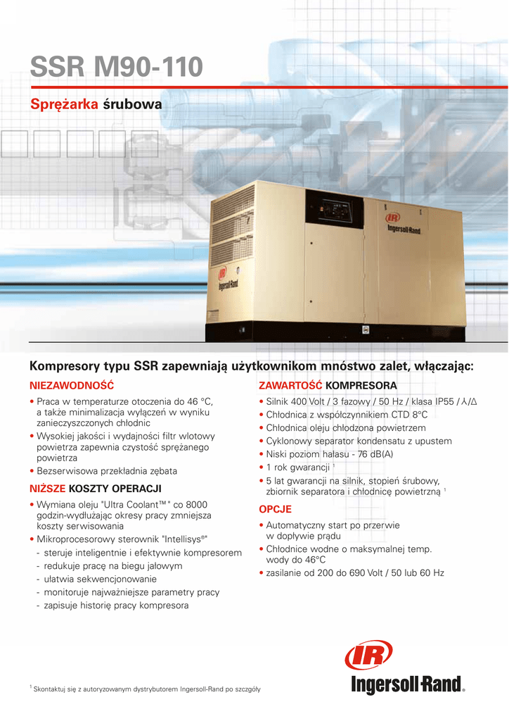 SSR M90-110 Sprężarka śrubowa Kompresory typu SSR zapewniają użytkownikom mnóstwo zalet, włączając: NIEZAWODNOŚĆ ZAWARTOŚĆ KOMPRESORA • Praca w temperaturze otoczenia do 46 °C, a także minimalizacja wyłączeń w wyniku zanieczyszczonych chłodnic • Wysokiej jakości i wydajności filtr wlotowy powietrza zapewnia czystość sprężanego powietrza • Bezserwisowa przekładnia zębata • Silnik 400 Volt / 3 fazowy / 50 Hz / klasa IP55 / /∆ • Chłodnica z współczynnikiem CTD 8°C • Chłodnica oleju chłodzona powietrzem • Cyklonowy separator kondensatu z upustem • Niski poziom hałasu - 76 dB(A) • 1 rok gwarancji 1 • 5 lat gwarancji na silnik, stopień śrubowy, zbiornik separatora i chłodnicę powietrzną 1 • Wymiana oleju "Ultra Coolant™" co 8000 godzin-wydłużając okresy pracy zmniejsza koszty serwisowania • Mikroprocesorowy sterownik "Intellisys®" - steruje inteligentnie i efektywnie kompresorem - redukuje pracę na biegu jałowym - ułatwia sekwencjonowanie - monitoruje najważniejsze parametry pracy - zapisuje historię pracy kompresora 1 Y NIŻSZE KOSZTY OPERACJI OPCJE • Automatyczny start po przerwie w dopływie prądu • Chłodnice wodne o maksymalnej temp. wody do 46°C • zasilanie od 200 do 690 Volt / 50 lub 60 Hz Skontaktuj się z autoryzowanym dystrybutorem Ingersoll-Rand po szczgóły SSR M90-110 Sprężarka śrubowa Model Ciśnienie Moc nominalna Wydajność Waga bar(g) psi(g) kW hp m3/min cfm kg ML90 MM90 MH90 MU90 7.5 8.5 10 13 109 123 145 189 90 90 90 90 125 125 125 125 16.7 15.3 14.0 11.5 590 540 494 406 2700 2700 2700 2700 ML110 MM110 MH110 MU110 7.5 8.5 10 13 109 123 145 189 110 110 110 110 150 150 150 150 20.0 19.2 17.5 14.5 706 678 618 512 2820 2820 2820 2820 Wymiary dotyczą kompresorów chłodzonych powietrzem: A - Wylot powietrza 2” B - Drenaż kondensatu C - Wlot powietrza chłodzącego kompresor D - Wejście na kabel E - Wylot powietrza chłodzącego kompresor F - Sterownik Kompresory firmy Ingersoll-Rand nie są przystosowane dla sprężania powietrza do oddychania. Ingersoll-Rand nie zezwala na używanie kompresorów do sprężania powietrza do oddychania i nie ponosi odpowiedzialności za używanie ich do tego celu. Informacje zawarte na powyższej karcie nie uprawniają do przedłużenia gwarancji na kompresor. Ingersoll-Rand stale ulepsza swje produkty i stąd zastrzega sobie prawo zmian bez uprzedniej informacji. www.air.irco.com/uk Industrial Air Solutions © 2004 by Ingersoll-Rand Company Limited. Printed in the UK CPN 22511398 Ingersoll-Rand European Sales Limited Swan Lane Hindley Green Wigan WN2 4EZ, UK Tel: +44 (0) 1942 257171 Fax: +44 (0) 1942 254162