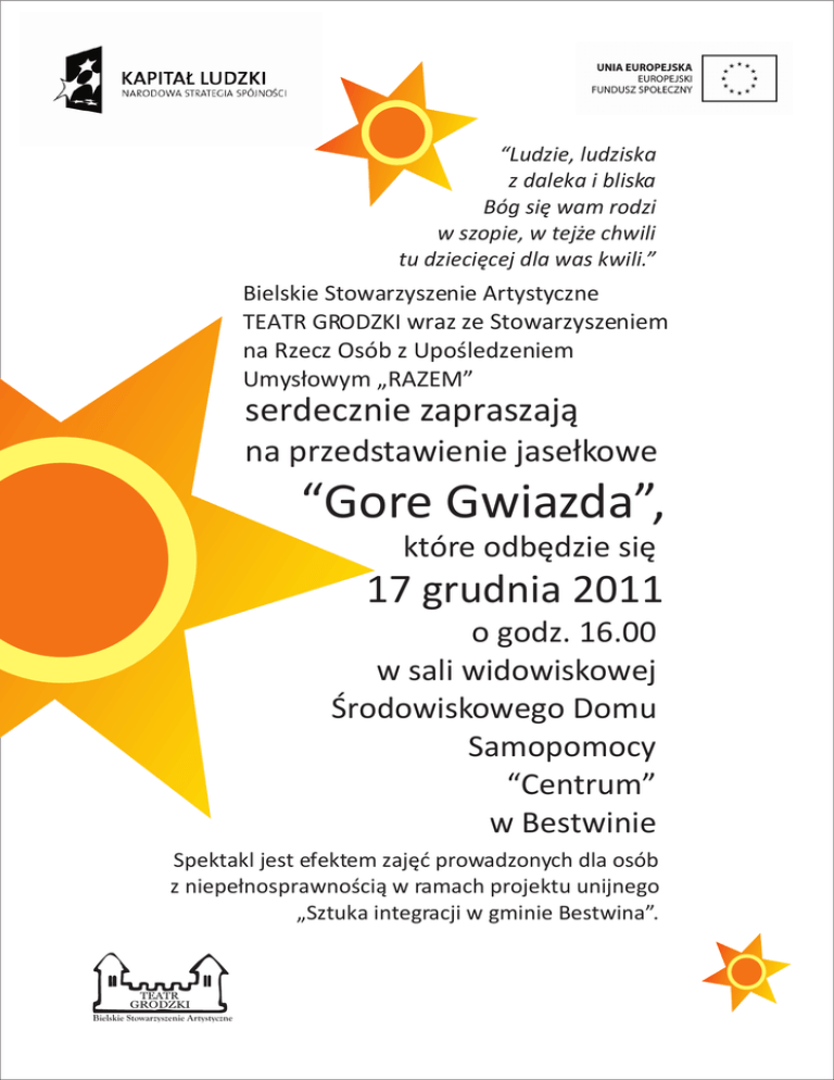 “Ludzie, ludziska z daleka i bliska Bóg siê wam rodzi w szopie, w tej¿e chwili tu dzieciêcej dla was kwili.” Bielskie Stowarzyszenie Artystyczne TEATR GRODZKI wraz ze Stowarzyszeniem na Rzecz Osób z Upoœledzeniem Umys³owym „RAZEM” serdecznie zapraszaj¹ na przedstawienie jase³kowe “Gore Gwiazda”, które odbêdzie siê 17 grudnia 2011 o godz. 16.00 w sali widowiskowej Œrodowiskowego Domu Samopomocy “Centrum” w Bestwinie Spektakl jest efektem zajêæ prowadzonych dla osób z niepe³nosprawnoœci¹ w ramach projektu unijnego „Sztuka integracji w gminie Bestwina”. Bielskie Stowarzyszenie Artystyczne