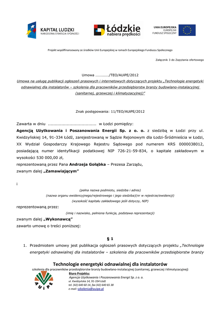 Projekt współfinansowany ze środków Unii Europejskiej w ramach Europejskiego Funduszu Społecznego Załącznik 3 do Zapytania ofertowego Umowa ……………/TEO/AUiPE/2012 Umowa na usługę publikacji ogłoszeń prasowych i internetowych dotyczących projektu „Technologie energetyki odnawialnej dla instalatorów – szkolenia dla pracowników przedsiębiorstw branży budowlano-instalacyjnej (sanitarnej, grzewczej i klimatyzacyjnej)” Znak postępowania: 11/TEO/AUiPE/2012 Zawarta w dniu .................................... w Łodzi pomiędzy: Agencją Użytkowania i Poszanowania Energii Sp. z o. o. z siedzibą w Łodzi przy ul. Kwidzyńskiej 14, 91-334 Łódź, zarejestrowaną w Sądzie Rejonowym dla Łodzi-Śródmieścia w Łodzi, XX Wydział Gospodarczy Krajowego Rejestru Sądowego pod numerem KRS 0000038012, posiadającą numer identyfikacji podatkowej NIP 726-21-59-834, o kapitale zakładowym w wysokości 530 000,00 zł, reprezentowaną przez Pana Andrzeja Gołąbka – Prezesa Zarządu, zwanym dalej „Zamawiającym” i (pełna nazwa podmiotu, siedziba i adres) (nazwa organu ewidencyjnego/rejestrowego i jego siedziba)(nr w rejestrze/ewidencji) (wysokość kapitału zakładowego jeśli dotyczy, NIP) reprezentowaną przez: (imię i nazwisko, pełniona funkcja, podstawa reprezentacji) zwanym dalej „Wykonawcą” zawarto umowę o treści poniższej: §1 1. Przedmiotem umowy jest publikacja ogłoszeń prasowych dotyczących projektu „Technologie energetyki odnawialnej dla instalatorów – szkolenia dla pracowników przedsiębiorstw branży Technologie energetyki odnawialnej dla instalatorów szkolenia dla pracowników przedsiębiorstw branży budowlano-instalacyjnej (sanitarnej, grzewczej i klimatyzacyjnej) Biuro Projektu: Agencja Użytkowania i Poszanowania Energii Sp. z o. o. ul. Kwidzyńska 14, 91-334 Łódź tel. (42) 640 60 14, fax (42) 640 65 38 e-mail: [email protected] Projekt współfinansowany ze środków Unii Europejskiej w ramach Europejskiego Funduszu Społecznego budowlano-instalacyjnej (sanitarnej, grzewczej i klimatyzacyjnej)” według wyszczególnienia zawartego w zapytaniu ofertowym i ofercie Wykonawcy. 2. Wykonawca oświadcza, że przedmiot umowy jest zgodny z Jego ofertą, sporządzoną na podstawie wymagań Zamawiającego. §2 1. Wykonawca oświadcza, że posiada odpowiednią wiedzę, doświadczenie i dysponuje stosowną bazą do wykonania przedmiotu umowy oraz że przedmiot umowy wykonany zostanie z zachowaniem należytej staranności. 2. Zamawiający zobowiązuje się dostarczyć projekt graficzny ogłoszenia e-mailem na adres ……………………………..., na …………. dni przed terminem publikacji. Wykonawca potwierdzi odbiór w ciągu 12 godzin od daty wysłania e-maila lub faksu przez Zamawiającego. 3. Wykonawca zamieści ogłoszenia według wskazówek Zamawiającego oraz wymagań techniczno-ilościowych określonych w Zamówieniu. Wymagania techniczno-ilościowe muszą być zgodne z warunkami publikacji reklam i ogłoszeń obowiązującymi u Wykonawcy, stanowiącymi załącznik nr 1 do niniejszej umowy. §3 1. Zamawiający przekazywać będzie Wykonawcy ogłoszenia w zamkniętych plikach graficznych, uniemożliwiających ingerowanie w ich treść. Jeżeli Wykonawca otrzyma projekt do wykonania na podstawie składowych otrzymanych przez Zamawiającego, wymagana jest akceptacja mailowa projektu ze strony Zamawiającego przed wysłaniem wydania do druku przez Wykonawcę. 2. W przypadku opublikowania ogłoszenia, którego grafika, w tym kolorystyka odbiega od projektu graficznego ogłoszenia przedstawionego przez Zamawiającego, Wykonawca dokona ponownej publikacji ogłoszenia na własny koszt w terminie wyznaczonym przez Zamawiającego, nie dłuższym niż 5 dni kalendarzowych licząc od dnia nieprawidłowej publikacji. 3. W przypadku braku publikacji ogłoszenia z przyczyn zawinionych przez Wykonawcę, Wykonawca dokona publikacji ogłoszenia na własny koszt w terminie wyznaczonym przez Technologie energetyki odnawialnej dla instalatorów szkolenia dla pracowników przedsiębiorstw branży budowlano-instalacyjnej (sanitarnej, grzewczej i klimatyzacyjnej) Biuro Projektu: Agencja Użytkowania i Poszanowania Energii Sp. z o. o. ul. Kwidzyńska 14, 91-334 Łódź tel. (42) 640 60 14, fax (42) 640 65 38 e-mail: [email protected] Projekt współfinansowany ze środków Unii Europejskiej w ramach Europejskiego Funduszu Społecznego Zamawiającego i zaakceptowanym przez Wykonawcę. W szczególności w miejsce ogłoszenia, które miało się ukazać w wydaniu powszednim, nie może zostać opublikowane ogłoszenie w wydaniu magazynowym gazety. 4. Postanowienia ust. 1-4 nie wyłączają uprawnień Zamawiającego, o których mowa w § 7. 5. Wykonawca zobowiązany jest dostarczyć na e-mail Zamawiającego ([email protected]) w dniu ukazania się ogłoszenia wersję elektroniczną (skan) strony gazety z odnośnym ogłoszeniem. §4 1. Wykonawca zamieści ogłoszenie prasowe zgodnie z zamówieniem złożonym przez Zamawiającego, według cen jednostkowych określonych w ofercie Wykonawcy w terminie do 7 dni roboczych od dnia przyjęcia zamówienia. 2. Wykonawca zobowiązuje się każdorazowo (przed złożeniem zamówienia) uzgodnić warunki publikacji z Zamawiającym. §5 1. Strony ustalają wartość łącznego wynagrodzenia dla Wykonawcy za wykonanie przedmiotu umowy na kwotę: a) netto: ……………… zł …………. gr (słownie …………………………………………………………..) b) VAT: ……………… zł …………. gr (słownie …………………………………………………………..) c) brutto: ……………… zł …………. gr (słownie …………………………………………………………..) 2. Wysokość wynagrodzenia, o którym mowa w pkt 1, jest stała i zawiera wszystkie koszty związane z realizacją przedmiotu umowy. 3. Wykonawca w dniu podpisania umowy ma obowiązek przedst