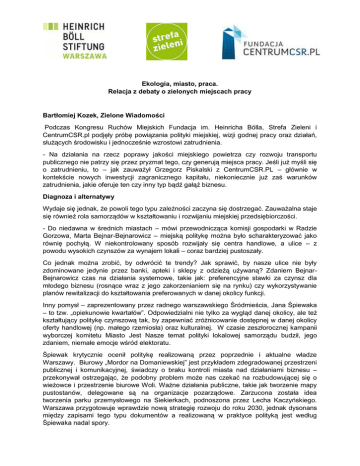 Ekologia, miasto, praca. Relacja z debaty o zielonych miejscach pracy Bartłomiej Kozek, Zielone Wiadomości Podczas Kongresu Ruchów Miejskich Fundacja im. Heinricha Bölla, Strefa Zieleni i CentrumCSR.pl podjęły próbę powiązania polityki miejskiej, wizji godnej pracy oraz działań, służących środowisku i jednocześnie wzrostowi zatrudnienia. - Na działania na rzecz poprawy jakości miejskiego powietrza czy rozwoju transportu publicznego nie patrzy się przez pryzmat tego, czy generują miejsca pracy. Jeśli już myśli się o zatrudnieniu, to – jak zauważył Grzegorz Piskalski z CentrumCSR.PL – głównie w kontekście nowych inwestycji zagranicznego kapitału, niekoniecznie już zaś warunków zatrudnienia, jakie oferuje ten czy inny typ bądź gałąź biznesu. Diagnoza i alternatywy Wydaje się jednak, że powoli tego typu zależności zaczyna się dostrzegać. Zauważalna staje się również rola samorządów w kształtowaniu i rozwijaniu miejskiej przedsiębiorczości. - Do niedawna w średnich miastach – mówi przewodnicząca komisji gospodarki w Radzie Gorzowa, Marta Bejnar-Bejnarowicz – miejską politykę można było scharakteryzować jako równię pochyłą. W niekontrolowany sposób rozwijały się centra handlowe, a ulice – z powodu wysokich czynszów za wynajem lokali – coraz bardziej pustoszały. Co jednak można zrobić, by odwrócić te trendy? Jak sprawić, by nasze ulice nie były zdominowane jedynie przez banki, apteki i sklepy z odzieżą używaną? Zdaniem BejnarBejnarowicz czas na działania systemowe, takie jak: preferencyjne stawki za czynsz dla młodego biznesu (rosnące wraz z jego zakorzenianiem się na rynku) czy wykorzystywanie planów rewitalizacji do kształtowania preferowanych w danej okolicy funkcji. Inny pomysł – zaprezentowany przez radnego warszawskiego Śródmieścia, Jana Śpiewaka – to tzw. „opiekunowie kwartałów”. Odpowiedzialni nie tylko za wygląd danej okolicy, ale też kształtujący politykę czynszową tak, by zapewniać zróżnicowanie dostępnej w danej okolicy oferty handlowej (np. małego rzemiosła) oraz kulturalnej. W czasie zeszłorocznej kampanii wyborczej komitetu Miasto Jest Nasze temat polityki lokalowej samorządu budził, jego zdaniem, niemałe emocje wśród elektoratu. Śpiewak krytycznie ocenił politykę realizowaną przez poprzednie i aktualne władze Warszawy. Biurowy „Mordor na Domaniewskiej” jest przykładem zdegradowanej przestrzeni publicznej i komunikacyjnej, świadczy o braku kontroli miasta nad działaniami biznesu – przekonywał ostrzegając, że podobny problem może nas czekać na rozbudowującej się o wieżowce i przestrzenie biurowe Woli. Ważne działania publiczne, takie jak tworzenie mapy pustostanów, delegowane są na organizacje pozarządowe. Zarzucona została idea tworzenia parku przemysłowego na Siekierkach, podnoszona przez Lecha Kaczyńskiego. Warszawa przygotowuje wprawdzie nową strategię rozwoju do roku 2030, jednak dysonans między zapisami tego typu dokumentów a realizowaną w praktyce polityką jest według Śpiewaka nadal spory. Gracze w grze o miasto Na jakość życia w naszych społecznościach lokalnych wpływ ma jednak nie tylko samorząd. Grzegorz Piskalski wskazywał na istotną rolę biznesu, który powinien być mocniej włączony w dialog na temat przyszłości naszych miast. Dialog ten wymaga jednak również większej transparentności w jego działaniach. Innym ważnym elementem, umożliwiającym przyszłe rozmowy, staje się świadomość roli biznesu w kształtowaniu warunków na lokalnych rynkach pracy. Oferta dla dostawców przekazywanych firmom zewnętrznym usług (takich jak sprzątanie czy ochrona) ma ogromny wpływ na sytuację zatrudnionych w nich osób. Świadomość tego typu zależności umożliwić może, według Piskalskiego, monitorowanie oraz wpływanie na działania biznesu. Społeczny monitoring biznesu, prowadzony przez CentrumCSR.PL wykazał tymczasem, że jedynie kilka spośród ponad 200 przedsiębiorstw objętych badaniem używa takich narzędzi jak raportowanie społeczne czy reguły postępowania wobec dostawców. Na szanse związane z kierowaniem się zasadami zrównoważonego rozwoju przez biznes i samorządy zwracał z kolei uwagę dyrektor Greenpeace Polska, Robert Cyglicki. Podkreślał transformacyjny charakter odnawialnej energetyki obywatelskiej oraz efektywności energetycznej. – Dzięki zielonej energii więcej pieniędzy zostaje w naszych kieszeniach oraz w budżetach samorządowych – przekonywał. To inwestycja, która z czasem się spłaca i zaczyna generować zysk – dodawał. Działania takie jak termorenowacja czy instalowanie paneli fotowoltaicznych tworzy lokalnie wiele miejsc pracy. Cyglicki podawał nawet liczby – 120 tysięcy miejsc pracy dzięki OZE i kolejne 60 tys. dzięki inteligentnym rozwiązaniom miejskim w duchu smart city. Mają one również być okazją do innowacji społecznych i ekonomicznych, takich jak spółdzielnie energetyczne, rozwój przestrzeni co-workingowych (z wolnych biurek skorzystać dziś można nawet w… niektórych biurach Greenpeace) czy wirtualne elektrownie. Marzenia do spełnienia Jak jednak doprowadzić do sytuacji, w której ambitne wizje lepszej przyszłości spotkają się z rzeczywistością? Bejnar-Bejnarowicz zauważyła ciekawy paradoks – przygotowując się do absorpcji różnego rodzaju środków unijnych okazuje się, że przepisy spółek komunalnych w kwestiach ekologicznych są całkiem progresywne – tyle że martwe. Początki zawsze są trudne – stwierdziła. Dla zmiany sytuacji kluczowe staje się edukowanie w zakresie opłacalności i stóp zwrotu różnego rodzaju „zielonych” inwestycji. Dla Śpiewaka z kolei najistotniejsze jest odzyskanie kontroli nad procesami inwestycyjnymi. Prognozowano, że w roku 2015 Warszawa w 80% pokryta będzie planami zagospodarowania przestrzennego – realny wskaźnik dziś to 30%. – Nie 