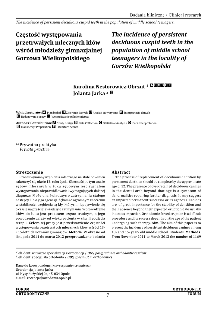Badania kliniczne / Clinical research The incidence of persistent deciduous cuspid teeth in the population of middle school teenagers... The incidence of persistent deciduous cuspid teeth in the population of middle school teenagers in the locality of Gorzów Wielkopolski Częstość występowania przetrwałych mlecznych kłów wśród młodzieży gimnazjalnej Gorzowa Wielkopolskiego Karolina Nestorowicz-Obrzut 1 Jolanta Jarka 2 E A B C DE F Wkład autorów: A Plan badań B Zbieranie danych C Analiza statystyczna D Interpretacja danych E Redagowanie pracy F Wyszukiwanie piśmiennictwa Authors’ Contribution: A Study design B Data Collection C Statistical Analysis D Data Interpretation E Manuscript Preparation F Literature Search 1,2 Prywatna praktyka Private practice Streszczenie Abstract Proces wymiany uzębienia mlecznego na stałe powinien zakończyć się około 12. roku życia. Obecność po tym czasie zębów mlecznych w łuku zębowym jest sygnałem występowania nieprawidłowości wymagających dalszej diagnozy. Może ona świadczyć o zatrzymaniu stałego następcy lub o jego agenezji. Zębami o ogromnym znaczeniu w stabilności uzębienia są kły, których niepojawienie się o czasie najczęściej świadczy o zatrzymaniu. Wprowadzenie kłów do łuku jest procesem często trudnym, a jego powodzenie zależy od wieku pacjenta w chwili podjęcia terapii. Celem tej pracy jest przedstawienie częstości występowania przetrwałych mlecznych kłów wśród 13i 15-letnich uczniów gimnazjów. Metoda. W okresie od listopada 2011 do marca 2012 przeprowadzono badania 1 3 The process of replacement of deciduous dentition by permanent dentition should be complete by the approximate age of 12. The presence of over-retained deciduous canines in the dental arch beyond that age is a symptom of abnormalities requiring further diagnosis. It may suggest an impacted permanent successor or its agenesis. Canines are of great importance for the stability of dentition and their absence beyond their expected eruption date usually indicates impaction. Orthodontic forced eruption is a difficult procedure and its success depends on the age of the patient undergoing such therapy. Aim. The aim of this paper is to present the incidence of persistent deciduous canines among 13- and 15- year- old middle school students. Methods. From November 2011 to March 2012 the number of 1169 lek. dent. w trakcie specjalizacji z ortodoncji / DDS, postgraduate orthodontic resident lek. dent. specjalista ortodonta / DDS, specialist in orthodontics Dane do korespondencji/correspondence address: Ortodoncja Jolanta Jarka ul. Nysy Łużyckiej 9a, 45-034 Opole e-mail: [email protected] ForumOrthodontic Ortodontyczneforum 7 Badania kliniczne / Clinical research K. Nestorowicz-Obrzut, J. Jarka wśród 1169 uczniów pierwszych i trzecich klas gimnazjum wśród losowo wybranych siedmiu szkół Gorzowa Wielkopolskiego. Z badania wyłączono osoby będące w trakcie aktywnego leczenia stałymi aparatami ortodontycznymi. Oprócz oceny statusu zębowego zebrano informacje na temat leczenia ortodontycznego. Wyniki. Wśród przebadanych 1169 osób stwierdzono obecność przetrwałych mlecznych kłów u 42 badanych (3,59%). Częstość wynosiła 4,83% w grupie młodszej i 2,38% – w grupie starszej. Istotnie częściej zaobserwowano przetrwanie górnych kłów aniżeli dolnych. Nigdy nie były leczone ortodontycznie 34 osoby z przetrwałymi mlecznymi kłami (80,96%). Na 42 osoby tylko jedna była świadoma obecności mlecznego kła, mimo regularnych kontroli stomatologicznych. Wnioski. Wyniki pokazują naglącą potrzebę kontroli ortodontycznych u nastolatków. Nieświadomość młodzieży w tej sprawie zadaje pytanie o stan wiedzy stomatologów ogólnych, którzy problem przetrwałych zębów mlecznych powinni zauważyć i kierować pacjentów do specjalistów ortodontów. (NestorowiczObrzut K, Jarka J. Częstość występowania przetrwałych mlecznych kłów wśród młodzieży gimnazjalnej Gorzowa Wielkopolskiego. Forum Ortod 2014; 10: 7-23). Nadesłano 10.10.2013 Przyjęto do druku 17.02.2014 students from a random sample of seven schools in Gorzów Wielkopolski underwent examination. Subjects with fixed braces were excluded from the research. Apart from assessment of their dentition, information about any past or current orthodontic treatment was collected. Results. Among 1169 examined students, 42 presented persistent deciduous canines (3.59%). The incidence was 4.87% in the younger group and 2.38% in the older one. Persistence of the maxillary canines was significantly more frequent than that of the mandibular ones. Thirty-four students with persistent deciduous canines (80.96%) had never been orthodontically treated. Decpite regular dentist examinations, only 1 out of 42 subjects was aware of the presence of an over-retained deciduous canine. Conclusion. The results show an urgent need for orthodontic check-ups among teenagers. Teenagers’ ignorance of the presence of over-retained deciduous teeth gives rise to a question about the level of knowledge among general dentists since they are the ones who are supposed to notice the problem of such over-retained deciduous teeth and refer patients to orthodontic specialists. (Nestorowicz-Obrzut K, Jarka J. The incidence of persistent deciduous cuspid teeth in the population of middle school teenagers in the locality of Gorzów Wielkopolski. Orthod Forum 2014; 10: 7-23). Received 10.10.2013 Accepted 17.02.2014 Wstęp Introduction Słowa kluczowe: przetrwałe kły mleczne, zatrzymane kły stałe, epidemiologia, młodzież Key words: persistent deciduous canines, impacted canines, epidemiology, teenagers Kieł stały jest uznawany za najstabilniejszy ząb w ludzkim uzębieniu (1). Pełni on ważną rolę w okluzji i estetyce. Zakończenie rozwoju jego korony przypada na 6.–7. rok życia, natomiast wyrzynanie rozpoczyna się średnio w wieku 11,5 lat. Proces rozwoju korzenia kończy si