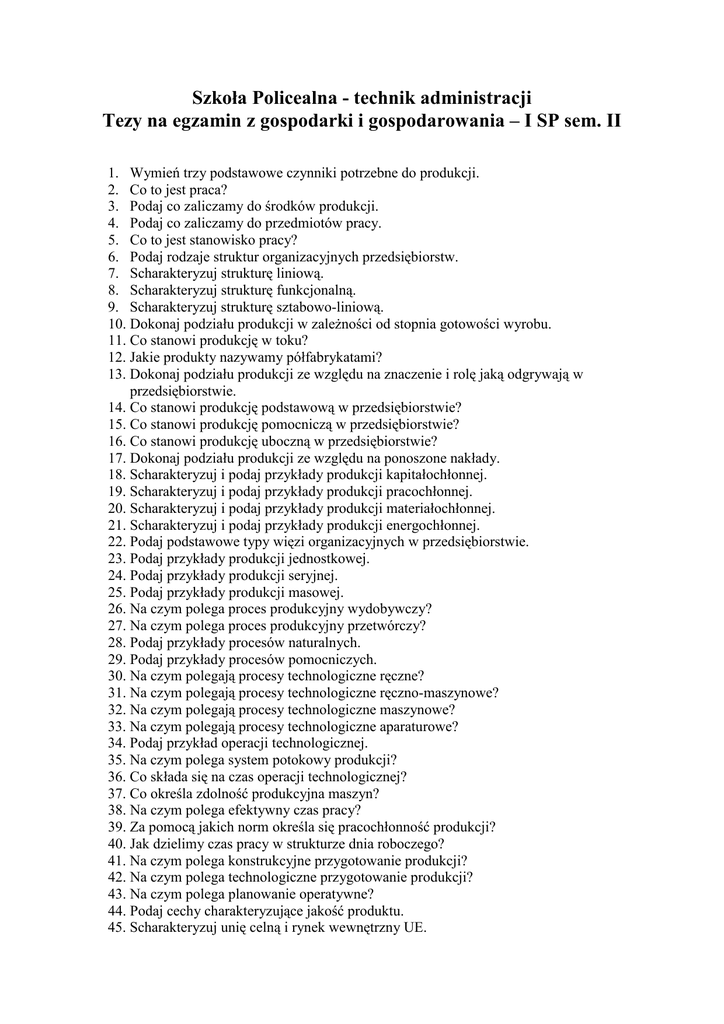 Szkoła Policealna - technik administracji Tezy na egzamin z gospodarki i gospodarowania – I SP sem. II 1. Wymień trzy podstawowe czynniki potrzebne do produkcji. 2. Co to jest praca? 3. Podaj co zaliczamy do środków produkcji. 4. Podaj co zaliczamy do przedmiotów pracy. 5. Co to jest stanowisko pracy? 6. Podaj rodzaje struktur organizacyjnych przedsiębiorstw. 7. Scharakteryzuj strukturę liniową. 8. Scharakteryzuj strukturę funkcjonalną. 9. Scharakteryzuj strukturę sztabowo-liniową. 10. Dokonaj podziału produkcji w zaleŜności od stopnia gotowości wyrobu. 11. Co stanowi produkcję w toku? 12. Jakie produkty nazywamy półfabrykatami? 13. Dokonaj podziału produkcji ze względu na znaczenie i rolę jaką odgrywają w przedsiębiorstwie. 14. Co stanowi produkcję podstawową w przedsiębiorstwie? 15. Co stanowi produkcję pomocniczą w przedsiębiorstwie? 16. Co stanowi produkcję uboczną w przedsiębiorstwie? 17. Dokonaj podziału produkcji ze względu na ponoszone nakłady. 18. Scharakteryzuj i podaj przykłady produkcji kapitałochłonnej. 19. Scharakteryzuj i podaj przykłady produkcji pracochłonnej. 20. Scharakteryzuj i podaj przykłady produkcji materiałochłonnej. 21. Scharakteryzuj i podaj przykłady produkcji energochłonnej. 22. Podaj podstawowe typy więzi organizacyjnych w przedsiębiorstwie. 23. Podaj przykłady produkcji jednostkowej. 24. Podaj przykłady produkcji seryjnej. 25. Podaj przykłady produkcji masowej. 26. Na czym polega proces produkcyjny wydobywczy? 27. Na czym polega proces produkcyjny przetwórczy? 28. Podaj przykłady procesów naturalnych. 29. Podaj przykłady procesów pomocniczych. 30. Na czym polegają procesy technologiczne ręczne? 31. Na czym polegają procesy technologiczne ręczno-maszynowe? 32. Na czym polegają procesy technologiczne maszynowe? 33. Na czym polegają procesy technologiczne aparaturowe? 34. Podaj przykład operacji technologicznej. 35. Na czym polega system potokowy produkcji? 36. Co składa się na czas operacji technologicznej? 37. Co określa zdolność produkcyjna maszyn? 38. Na czym polega efektywny czas pracy? 39. Za pomocą jakich norm określa się pracochłonność produkcji? 40. Jak dzielimy czas pracy w strukturze dnia roboczego? 41. Na czym polega konstrukcyjne przygotowanie produkcji? 42. Na czym polega technologiczne przygotowanie produkcji? 43. Na czym polega planowanie operatywne? 44. Podaj cechy charakteryzujące jakość produktu. 45. Scharakteryzuj unię celną i rynek wewnętrzny UE. 46. Scharakteryzuj politykę rolną UE. 47. Scharakteryzuj politykę strukturalną UE. 48. Scharakteryzuj politykę handlową UE. 49. Scharakteryzuj politykę zagraniczną UE. 50. Czego dotyczy norma HACCP? 50. Scharakteryzuj politykę migracyjną UE. 51. Scharakteryzuj politykę wewnętrzną i wymiar sprawiedliwości. 52. Scharakteryzuj pojęcie: swobodny przepływ osób. 53. Podaj przykłady makrootoczenia przedsiębiorcy. 54. Podaj przykłady mikrootoczenia przedsiębiorcy. 55. W jakim celu wprowadzono klasyfikację NUTS? 56. Do analizy jakich problemów wykorzystuje się NUTS1? 57. Do analizy jakich problemów wykorzystuje się NUTS2? 58. Do analizy jakich problemów wykorzystuje się NUTS3? 59. Podaj nomenklaturę jednostek terytorialnych do celów statystycznych w Polsce (NTS). 60. Jak rozumieć pojęcie: jakość właściwa? 61. Jakie znasz normy jakości? 62. Normy jakości ISO serii 2000. 63. Podaj czynniki wpływające na zmienność otoczenia rynkowego przedsiębiorstwa. 64. Wymień style kierowania. 65. Cechy charakterystyczne autokraty. 66. Cechy charakterystyczne demokraty. 67. Cechy charakterystyczne liberała. 68. Na czym polega styl kierowania zorientowany na zadania? 69. Na czym polega styl kierowania zorientowany na pracowników? 70. Na czym polega funkcja organizacyjna? 71. Na czym polega funkcja planowania? 72. Na czym polega funkcja motywowania? 73. Na czym polega funkcja kontroli? 74. Podaj podstawowe źródła władzy potrzebne do skutecznego kierowania.