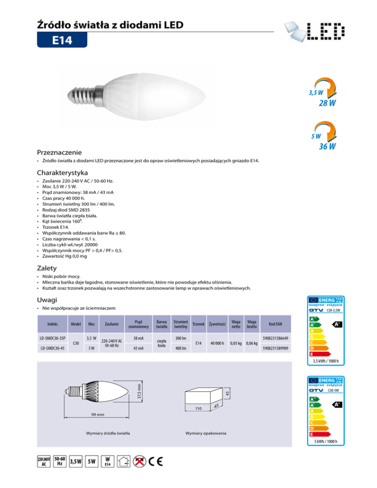 Źródło światła z diodami LED E14 3,5 W 28 W 5W 36 W Przeznaczenie • Źródło światła z diodami LED przeznaczone jest do opraw oświetleniowych posiadających gniazdo E14. Charakterystyka • • • • • • • • • • • • • • Zasilanie 220-240 V AC / 50-60 Hz. Moc 3,5 W / 5 W. Prąd znamionowy: 38 mA / 43 mA Czas pracy 40 000 h. Strumień świetlny 300 lm / 400 lm. Rodzaj diod SMD 2835 Barwa światła ciepła biała. Kąt świecenia 160⁰. Trzonek E14. Współczynnik oddawania barw Ra ≥ 80. Czas nagrzewania < 0,1 s. Liczba cykli wł./wył. 20000 Współczynnik mocy PF > 0,4 / PF> 0,5. Zawartość Hg 0,0 mg Zalety • Niski pobór mocy. • Mleczna bańka daje łagodne, stonowane oświetlenie, które nie powoduje efektu olśnienia. • Kształt oraz trzonek pozwalają na wszechstronne zastosowanie lamp w oprawach oświetleniowych. Uwagi • Nie współpracuje ze ściemniaczem Indeks LD-SMDC30-35P LD-SMDC30-45 Model C30 Moc 3,5 W 5W Zasilanie C30-3,5W Prąd znamionowy 220-240 V AC 50-60 Hz 38 mA 43 mA Barwa światła ciepła biała Strumień Trzonek Żywotność świetlny 300 lm 400 lm E14 40 000 h Waga netto Waga brutto 0,05 kg 0,06 kg Kod EAN 5908231386649 5908231389909 45 37,5 mm 3,5 kWh / 1000 h 110 C30-5W 45 99 mm Wymiary źródła światła Wymiary opakowania 5 kWh / 1000 h 50-60 Hz 3,5 W 5 W E14