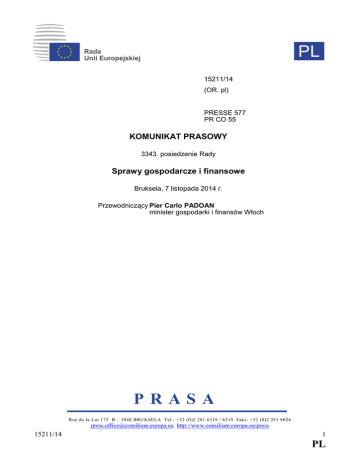 PL Rada Unii Europejskiej 15211/14 (OR. pl) PRESSE 577 PR CO 55 KOMUNIKAT PRASOWY 3343. posiedzenie Rady Sprawy gospodarcze i finansowe Bruksela, 7 listopada 2014 r. Przewodniczący Pier Carlo PADOAN minister gospodarki i finansów Włoch PRASA Rue de la Loi 175 B – 1048 BRUKSELA Tel.: +32 (0)2 281 6319 / 6319 Faks: +32 (0)2 281 8026 [email protected] http://www.consilium.europa.eu/press 15211/14 1 PL 7 listopada 2014 r. Główne wyniki posiedzenia Rady Rada uznała bezprecedensową skalę tegorocznej rewizji dochodów do budżetu UE oraz wpływ tej rewizji na krajowe finanse niektórych państw członkowskich. Wezwała Komisję, by przedstawiła wniosek dotyczący zmiany rozporządzenia w sprawie zasobów własnych, tak by umożliwić zainteresowanym państwom członkowskim odroczenie dokonania wymaganych płatności w okresie do 1 września 2015 r. Rada uznała również, że trzeba zająć się kwestią wysokiego poziomu niezapłaconych wniosków o płatność oraz konstruktywnie działać w kwestii terminowego przyjęcia stanowiska w sprawie projektów budżetów korygujących na 2014 r. Rada przyjęła konkluzje w sprawie statystyk UE i w sprawie aspektów związanych z finansowaniem polityki dotyczącej klimatu, w kontekście przygotowań do konferencji stron Ramowej konwencji O.Z w sprawie zmian klimatu. 15211/14 2 PL 7 listopada 2014 r. SPIS TREŚCI1 UCZEST ICY ................................................................................................................................... 5 OMAWIA E PU KTY STAN NEGOCJACJI BUDŻETOWYCH........................................................................................... 7 PODATKI: DYREKTYWA DOTYCZĄCA SPÓŁEK DOMINUJĄCYCH I ZALEŻNYCH – KLAUZULA ZAPOBIEGAJĄCA NADUŻYCIOM.......................................................................... 8 PODATEK OD TRANSAKCJI FINANSOWYCH ............................................................................ 9 STATYSTYKI UE............................................................................................................................. 10 RAMOWA KONWENCJA ORGANIZACJI NARODÓW ZJEDNOCZONYCH W SPRAWIE ZMIAN KLIMATU.................................................................................................... 11 SPRAWY RÓŻNE............................................................................................................................. 15 – Bieżące prace nad dossier ustawodawczymi ......................................................................................................... 15 – Standardowa deklaracja VAT................................................................................................................................ 15 SPOTKANIA PRZY OKAZJI POSIEDZENIA RADY ................................................................... 16 I E ZATWIERDZO E PU KTY SPRAWY GOSPODARCZE I FI.A.SOWE – Jednolita Rada ds. Restrukturyzacji i Uporządkowanej Likwidacji: wkłady na poczet kosztów administracyjnych ................................................................................................................................................. 17 – Przegląd Europejskiego Systemu Nadzoru Finansowego...................................................................................... 17 – Dyrektywa w sprawie wymogów kapitałowych: Standardy techniczne................................................................ 17 – Statystyka – wydatki na badania i rozwój ............................................................................................................. 18 – Zarządzanie gospodarcze – państwa członkowskie strefy euro (tzw. dwupak) ..................................................... 18 – Odstępstwo dotyczące VAT – Łotwa, Litwa – małe przedsiębiorstwa ................................................................. 18 – Odstępstwo dotyczące VAT – Estonia – samochody osobowe ............................................................................. 19 – Saint-Barthélemy – opodatkowanie dochodów z oszczędności i współpraca administracyjna ............................. 19 1 Ÿ Jeżeli deklaracje, konkluzje lub rezolucje zostały przez Radę formalnie przyjęte, jest to zaznaczone w tytule danego punktu, a tekst jest umieszczony w cudzysłowie. Ÿ Dokumenty, do których odesłano w tekście, są dostępne na internetowej stronie Rady (http://www.consilium.europa.eu). Ÿ Gwiazdką oznaczono akty przyjęte wraz z oświadczeniami do protokołu Rady przeznaczonymi do wiadomości publicznej; oświadczenia te można znaleźć na wyżej wspomnianej internetowej stronie Rady lub uzyskać z biura prasowego. 15211/14 3 PL 7 listopada 2014 r. SPRAWY ZAGRA.ICZ.E – Iran – środki ograniczające.................................................................................................................................... 19 – Republika Środkowoafrykańska – operacja wojskowa UE ................................................................................... 19 EUROPEJSKI OBSZAR GOSPODARCZY – Zmiany do protokołu do Porozumienia EOG ........................................................................................................ 19 RY.EK WEW.ĘTRZ.Y – Homologacja typu pojazdów silnikowych............................................................................................................. 21 PRAWO SPÓŁEK – Wymogi dotyczące rachunkowości dla przedsiębiorstw – Chorwacja.................................................................. 21 ROL.ICTWO – Napoje spirytusowe – zmiana wykazu oznaczeń geograficznych ......................................................................... 21 TRA.SPORT – Interoperacyjność kolei − aplikacje telematyczne dla przewozów towarowych ................................................... 22 – Bezpieczeństwo lotnicze – urządzenia podające tlen ............................................