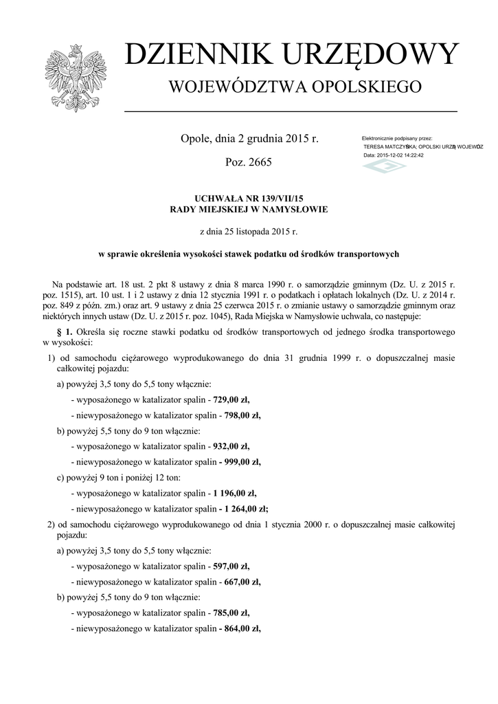 DZIENNIK URZĘDOWY WOJEWÓDZTWA OPOLSKIEGO Opole, dnia 2 grudnia 2015 r. Elektronicznie podpisany przez: TERESA MATCZYŃSKA; OPOLSKI URZĄD WOJEWÓDZKI Poz. 2665 Data: 2015-12-02 14:22:42 UCHWAŁA NR 139/VII/15 RADY MIEJSKIEJ W NAMYSŁOWIE z dnia 25 listopada 2015 r. w sprawie określenia wysokości stawek podatku od środków transportowych Na podstawie art. 18 ust. 2 pkt 8 ustawy z dnia 8 marca 1990 r. o samorządzie gminnym (Dz. U. z 2015 r. poz. 1515), art. 10 ust. 1 i 2 ustawy z dnia 12 stycznia 1991 r. o podatkach i opłatach lokalnych (Dz. U. z 2014 r. poz. 849 z późn. zm.) oraz art. 9 ustawy z dnia 25 czerwca 2015 r. o zmianie ustawy o samorządzie gminnym oraz niektórych innych ustaw (Dz. U. z 2015 r. poz. 1045), Rada Miejska w Namysłowie uchwala, co następuje: § 1. Określa się roczne stawki podatku od środków transportowych od jednego środka transportowego w wysokości: 1) od samochodu ciężarowego wyprodukowanego do dnia 31 grudnia 1999 r. o dopuszczalnej masie całkowitej pojazdu: a) powyżej 3,5 tony do 5,5 tony włącznie: - wyposażonego w katalizator spalin - 729,00 zł, - niewyposażonego w katalizator spalin - 798,00 zł, b) powyżej 5,5 tony do 9 ton włącznie: - wyposażonego w katalizator spalin - 932,00 zł, - niewyposażonego w katalizator spalin - 999,00 zł, c) powyżej 9 ton i poniżej 12 ton: - wyposażonego w katalizator spalin - 1 196,00 zł, - niewyposażonego w katalizator spalin - 1 264,00 zł; 2) od samochodu ciężarowego wyprodukowanego od dnia 1 stycznia 2000 r. o dopuszczalnej masie całkowitej pojazdu: a) powyżej 3,5 tony do 5,5 tony włącznie: - wyposażonego w katalizator spalin - 597,00 zł, - niewyposażonego w katalizator spalin - 667,00 zł, b) powyżej 5,5 tony do 9 ton włącznie: - wyposażonego w katalizator spalin - 785,00 zł, - niewyposażonego w katalizator spalin - 864,00 zł, Dziennik Urzędowy Województwa Opolskiego –2– Poz. 2665 c) powyżej 9 ton i poniżej 12 ton: - wyposażonego w katalizator spalin - 1 062,00 zł, - niewyposażonego w katalizator spalin - 1 132,00 zł; 3) od samochodu ciężarowego o dopuszczalnej masie całkowitej równej lub wyższej niż 12 ton, z tym, że w zależności od liczby osi, dopuszczalnej masy całkowitej pojazdu i rodzaju zawieszenia stawki podatku określa załącznik nr 1 do niniejszej uchwały; 4) od ciągnika siodłowego i balastowego wyprodukowanego do 31 grudnia 1999 r. przystosowanego do używania łącznie z naczepą lub przyczepą o dopuszczalnej masie całkowitej zespołu pojazdów od 3,5 tony i poniżej 12 ton: a) wyposażonego w katalizator spalin - 1 464,00 zł, b) niewyposażonego w katalizator spalin - 1 597,00 zł; 5) od ciągnika siodłowego i balastowego wyprodukowanego od dnia 1 stycznia 2000 r., przystosowanego do używania łącznie z naczepą lub przyczepą o dopuszczalnej masie całkowitej zespołu pojazdów od 3,5 tony i poniżej 12 ton: a) wyposażonego w katalizator spalin - 1 327,00 zł, b) niewyposażonego w katalizator spalin - 1 397,00 zł; 6) od ciągnika siodłowego i balastowego przystosowanego do używania łącznie z naczepą lub przyczepą, o dopuszczalnej masie całkowitej zespołu pojazdów równej lub wyższej niż 12 ton, z tym, że w zależności od liczby osi, dopuszczalnej masy całkowitej pojazdu i rodzaju zawieszenia stawki podatku określa załącznik nr 2 do niniejszej uchwały; 7) od przyczepy i naczepy wyprodukowanych do 31 grudnia 1999 r., które łącznie z pojazdem silnikowym posiadają dopuszczalną masę całkowitą od 7 ton i poniżej 12 ton, z wyjątkiem związanych wyłącznie z działalnością rolniczą prowadzoną przez podatnika podatku rolnego - 801,00 zł; 8) od przyczepy i naczepy wyprodukowanych od dnia 1 stycznia 2000 r., które łącznie z pojazdem silnikowym posiadają dopuszczalną masę całkowitą od 7 ton i poniżej 12 ton, z wyjątkiem związanych wyłącznie z działalnością rolniczą prowadzoną przez podatnika podatku rolnego - 669,00 zł; 9) od przyczepy i naczepy, które łącznie z pojazdem silnikowym posiadają dopuszczalną masę całkowitą równą lub wyższą niż 12 ton, z wyjątkiem związanych wyłącznie z działalnością rolniczą prowadzoną przez podatnika podatku rolnego, z tym, że w zależności od liczby osi, dopuszczalnej masy całkowitej pojazdu i rodzaju zawieszenia, stawki podatku określa załącznik nr 3 do niniejszej uchwały; 10) od autobusu wyprodukowanego do dnia 31 grudnia 1999 r. w zależności od liczby miejsc do siedzenia poza miejscem kierowcy: a) mniejszej niż 22 miejsca: - wyposażonego w katalizator spalin - 932,00 zł, - niewyposażonego w katalizator spalin - 999,00 zł, b) równej lub większej niż 22 miejsca: - wyposażonego w katalizator spalin - 1 994,00 zł, - niewyposażonego w katalizator spalin - 2 062,00 zł; 11) od autobusu wyprodukowanego od dnia 1 stycznia 2000 r. w zależności od liczby miejsc do siedzenia poza miejscem kierowcy: a) mniejszej niż 22 miejsca: - wyposażonego w katalizator spalin - 798,00 zł, - niewyposażonego w katalizator spalin - 864,00 zł, Dziennik Urzędowy Województwa Opolskiego –3– Poz. 2665 b) równej lub większej niż 22 miejsca: - wyposażonego w katalizator spalin - 1 862,00 zł, - niewyposażonego w katalizator spalin - 1 931,00 zł. § 2. Wykonanie uchwały powierza się Burmistrzowi Namysłowa. § 3. Traci moc uchwała nr XXIX/385/14 Rady Miejskiej w Namysłowie z dnia 6 listopada 2014 r. w sprawie określenia wysokości stawek podatku od środków transportowych. § 4. Uchwała podlega ogłoszeniu w Dzienniku Urzędowym Województwa Opolskiego i wchodzi w życie po upływie 14 dni od jej ogłoszenia, z mocą obowiązującą od 1 stycznia2016 r. Przewodniczący Rady Sylwester Zabielny Dziennik Urzędowy Województwa Opolskiego –4– Poz. 2665 Załącznik nr 1 do uchwały nr 139/VII/15 Rady Miejskiej w Namysłowie z dnia 25 listopada 2015 r. Stawki podatku dla pojazdów określonych w § 1 pkt 3 uchwały Lic