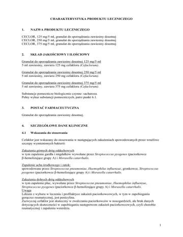 CHARAKTERYSTYKA PRODUKTU LECZNICZEGO 1. NAZWA PRODUKTU LECZNICZEGO CECLOR, 125 mg/5 ml, granulat do sporządzania zawiesiny doustnej CECLOR, 250 mg/5 ml, granulat do sporządzania zawiesiny doustnej CECLOR, 375 mg/5 ml, granulat do sporządzania zawiesiny doustnej 2. SKŁAD JAKOŚCIOWY I ILOŚCIOWY Granulat do sporządzania zawiesiny doustnej 125 mg/5 ml 5 ml zawiesiny, zawiera 125 mg cefakloru (Cefaclorum). Granulat do sporządzania zawiesiny doustnej 250 mg/5 ml 5 ml zawiesiny, zawiera 250 mg cefakloru (Cefaclorum). Granulat do sporządzania zawiesiny doustnej 375 mg/5 ml 5 ml zawiesiny, zawiera 375 mg cefakloru (Cefaclorum). Substancje pomocnicze biologicznie czynne: sacharoza. Pełny wykaz substancji pomocniczych, patrz punkt 6.1. 3. POSTAĆ FARMACEUTYCZNA Granulat do sporządzania zawiesiny doustnej. 4. SZCZEGÓŁOWE DANE KLINICZNE 4.1 Wskazania do stosowania Cefaklor jest wskazany do stosowania w następujących zakażeniach spowodowanych przez wrażliwe szczepy wymienionych bakterii: Zakażenia górnych dróg oddechowych w tym zapalenie gardła i migdałków wywołane przez Streptococcus pyogenes (paciorkowce -hemolizujące grupy A) i Moraxella catarrhalis. Zapalenie ucha środkowego i zatok: spowodowane przez Streptococcus pneumoniae, Haemophilus influenzae, gronkowce, Streptococcus pyogenes (paciorkowce -hemolizujące grupy A) i Moraxella catarrhalis. Zakażenia dolnych dróg oddechowych w tym zapalenie płuc, wywołane przez Streptococcus pneumoniae, Haemophilus influenzae, Streptococcus pyogenes (paciorkowce -hemolizujące grupy A) i Moraxella catarrhalis. Uwaga Lekiem z wyboru w leczeniu i profilaktyce zakażeń paciorkowcowych, w tym w zapobieganiu gorączce reumatycznej, jest penicylina. Zazwyczaj cefaklor jest skuteczny w zwalczaniu paciorkowców w nosogardzieli, ale brak danych dotyczących skuteczności w zapobieganiu następstwom zakażeń paciorkowcowych, czyli chorobie reumatycznej i zapaleniu wsierdzia. 1 Zakażenia dróg moczowych w tym odmiedniczkowe zapalenie nerek i zapalenie pęcherza wywołane przez Escherichia coli, Proteus mirabilis, Klebsiella spp. i gronkowce koagulazo-ujemne. Wykazano, że cefaklor jest skuteczny zarówno w ostrych jak i przewlekłych zakażeniach np. w rzeżączkowym zapaleniu cewki moczowej. Zakażenie skóry i tkanek miękkich wywołane przez Staphylococcus aureus i Streptococcus pyogenes. Przed rozpoczęciem leczenia należy wykonać odpowiednie badania w celu wykazania wrażliwości drobnoustrojów na cefaklor. Należy wziąć pod uwagę oficjalne wytyczne dotyczące właściwego stosowania produktów przeciwbakteryjnych. 4.2 Dawkowanie i sposób podawania Ceclor jest lekiem stosowanym doustnie. Zalecana zwykle stosowana dawka u dzieci wynosi 20 mg/kg mc. na dobę w dawkach podzielonych podawanych co 8 godzin. W przypadku zapalenia oskrzeli i zapalenia płuc należy stosować dawkę 20 mg/kg mc. na dobę w 3 dawkach podzielonych. W przypadku cięższych zakażeń, zapalenia ucha środkowego i zakażeń wywołanych przez mniej wrażliwe bakterie zaleca się stosowanie dawki 40 mg/kg mc. na dobę w dawkach podzielonych. Maksymalna dawka dobowa wynosi 1 g. Masa ciała 20 mg/kg mc./dobę 9 kg 18 kg 40 mg/kg mc./dobę 9 kg 18 kg 125 mg/5 ml 250 mg/5 ml 375 mg/5 ml 3 × 1/2 łyżeczki miarowej 3 × 1 łyżeczka miarowa - - 3 × 1/2 łyżeczki miarowej 2 × 1/2 łyżeczki miarowej 3 × 1 łyżeczka miarowa - 3 × 1/2 łyżeczki miarowej 3 × 1 łyżeczka miarowa 2 × 1/2 łyżeczki miarowej 2 × 1 łyżeczka miarowa W leczeniu zapalenia ucha środkowego i zapalenia gardła dobową dawkę można podawać w 2 dawkach podzielonych co 12 godzin. Nie określono bezpieczeństwa i skuteczności leku u dzieci w wieku poniżej 1. miesiąca życia. Leczenie zakażeń wywoływanych przez paciorkowce -hemolizujące powinno trwać co najmniej 10 dni. Zazwyczaj nie jest konieczna zmiana dawkowania u pacjentów z umiarkowaną i ciężką niewydolnością nerek. 4.3 Przeciwwskazania Nadwrażliwość na substancję czynną (lub inne cefalosporyny) lub którąkolwiek substancję pomocniczą. 4.4 Specjalne ostrzeżenia i środki ostrożności dotyczące stosowania Przed rozpoczęciem stosowania cefakloru należy upewnić się, czy u pacjenta nie występowały w przeszłości objawy nadwrażliwości na cefaklor, cefalosporyny, penicyliny lub inne leki. U pacjentów z nadwrażliwością na penicyliny należy stosować cefaklor ze szczególną ostrożnością, ponieważ została udokumentowana możliwość wystąpienia krzyżowej reakcji alergicznej na antybiotyki -laktamowe, ze wstrząsem anafilaktycznym włącznie. 2 W przypadku wystąpienia reakcji alergicznej na cefaklor należy przerwać stosowanie leku i podjąć odpowiednie środki. Praktycznie wszystkie antybiotyki o szerokim zakresie działania (w tym makrolidy, półsyntetyczne penicyliny i cefalosporyny) mogą być przyczyną rzekomobłoniastego zapalenia jelit. Dlatego ważne jest, aby rozpoznanie to brać pod uwagę, jeśli podczas stosowania antybiotyku u pacjenta wystąpi biegunka. Rzekomobłoniaste zapalenie jelit może mieć różny przebieg, od lekkiego po zagrażający życiu. W przypadku lekkiego przebiegu zwykle wystarczy przerwać stosowanie leku. W przypadku umiarkowanego lub ciężkiego przebiegu konieczne jest podjęcie odpowiedniego leczenia. Przeciwwskazane jest podawanie leków hamujących perystaltykę jelit. Cefaklor należy stosować ostrożnie u pacjentów z niewydolnością nerek. Okres półtrwania cefakloru u pacjentów z bezmoczem wynosi 2,3–2,8 h (u pacjentów z prawidłową czynnością nerek 0,6–0,9 h). Zazwyczaj nie jest konieczna modyfikacja dawki u pacjentów z umiarkowaną, a nawet ciężką niewydolnością nerek. Doświadczenie kliniczne ze stosowaniem cefakloru u tych osób jest niewielkie, dlatego konieczna jest dokładna obserwacja kliniczna pacjenta i wykonywanie kontrolnych badań laboratoryjnych. Należy zachować ostrożność zalecając stosowanie antybioty
