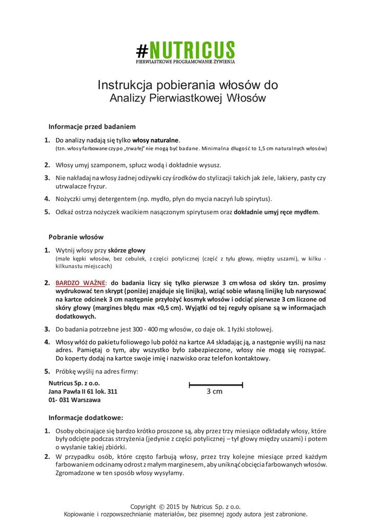 Instrukcja pobierania włosów do Analizy Pierwiastkowej Włosów Informacje przed badaniem 1. Do analizy nadają się tylko włosy naturalne. (tzn. włos y fa rbowane czy po „trwa łej” nie mogą byd ba da ne. Mi ni ma l na długoś d to 1,5 cm na tura l nych włos ów) 2. Włosy umyj szamponem, spłucz wodą i dokładnie wysusz. 3. Nie nakładaj na włosy żadnej odżywki czy środków do stylizacji takich jak żele, lakiery, pasty czy utrwalacze fryzur. 4. Nożyczki umyj detergentem (np. mydło, płyn do mycia naczyo lub spirytus). 5. Odkaź ostrza nożyczek wacikiem nasączonym spirytusem oraz dokładnie umyj ręce mydłem. Pobranie włosów 1. Wytnij włosy przy skórze głowy (małe kępki włosów, bez cebulek, z części potylicznej (częśd z tyłu głowy, między uszami), w kilku kilkunastu miejscach) 2. BARDZO WAŻNE: do badania liczy się tylko pierwsze 3 cm włosa od skóry tzn. prosimy wydrukowad ten skrypt (poniżej znajduje się linijka), wziąd sobie własną linijkę lub narysowad na kartce odcinek 3 cm następnie przyłożyd kosmyk włosów i odciąd pierwsze 3 cm liczone od skóry głowy (margines błędu max +0,5 cm). Wyjątki od tej reguły opisane są w informacjach dodatkowych. 3. Do badania potrzebne jest 300 - 400 mg włosów, co daje ok. 1 łyżki stołowej. 4. Włosy włóż do pakietu foliowego lub połóż na kartce A4 składając ją, a następnie wyślij na nasz adres. Pamiętaj o tym, aby wszystko było zabezpieczone, włosy nie mogą się rozsypad. Do koperty dodaj na kartce swoje imię i nazwisko oraz telefon kontaktowy. 5. Próbkę wyślij na adres firmy: Nutricus Sp. z o.o. Jana Pawła II 61 lok. 311 01- 031 Warszawa Informacje dodatkowe: 1. Osoby obcinające się bardzo krótko proszone są, aby przez trzy miesiące odkładały włosy, które były odcięte podczas strzyżenia (jedynie z części potylicznej – tył głowy między uszami) i potem o wysłanie takiej zbiórki. 2. W przypadku osób, które często farbują włosy, przez trzy kolejne miesiące przed każdym farbowaniem odcinamy odrost z małym marginesem, aby uniknąd obcięcia farbowanych włosów. Zgromadzone w ten sposób włosy wysyłamy. Copyright © 2015 by Nutricus Sp. z o.o. Kopiowanie i rozpowszechnianie materiałów, bez pisemnej zgody autora jest z abronione.