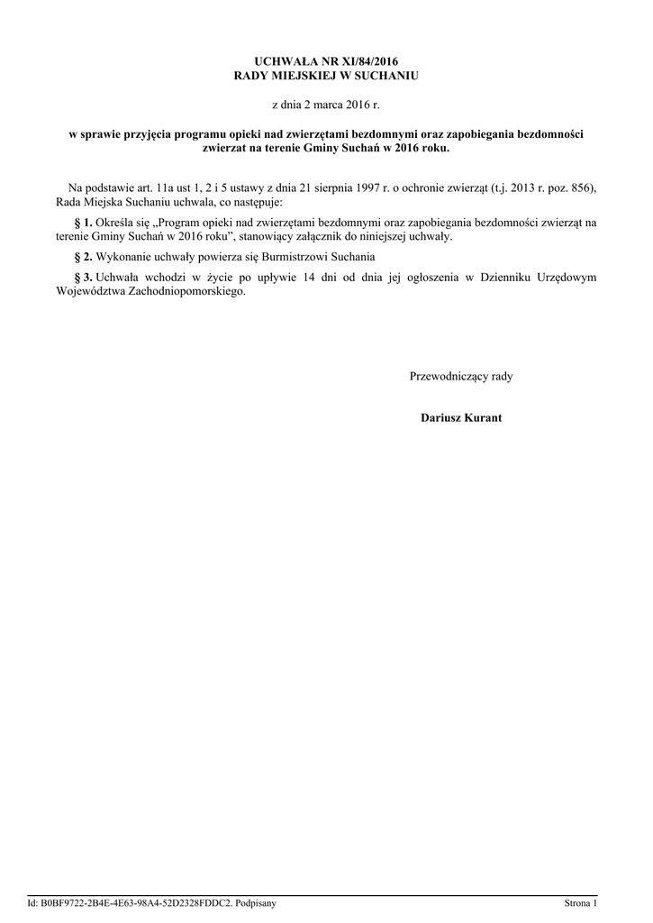 UCHWAŁA NR XI/84/2016 RADY MIEJSKIEJ W SUCHANIU z dnia 2 marca 2016 r. w sprawie przyjęcia programu opieki nad zwierzętami bezdomnymi oraz zapobiegania bezdomności zwierzat na terenie Gminy Suchań w 2016 roku. Na podstawie art. 11a ust 1, 2 i 5 ustawy z dnia 21 sierpnia 1997 r. o ochronie zwierząt (t.j. 2013 r. poz. 856), Rada Miejska Suchaniu uchwala, co następuje: § 1. Określa się „Program opieki nad zwierzętami bezdomnymi oraz zapobiegania bezdomności zwierząt na terenie Gminy Suchań w 2016 roku”, stanowiący załącznik do niniejszej uchwały. § 2. Wykonanie uchwały powierza się Burmistrzowi Suchania § 3. Uchwała wchodzi w życie po upływie 14 dni od dnia jej ogłoszenia w Dzienniku Urzędowym Województwa Zachodniopomorskiego. Przewodniczący rady Dariusz Kurant Id: B0BF9722-2B4E-4E63-98A4-52D2328FDDC2. Podpisany Strona 1 Załącznik do Uchwały Nr XI/84/2016 Rady Miejskiej w Suchaniu z dnia 2 marca 2016 r. Program opieki nad zwierzętami bezdomnymi oraz zapobiegania bezdomności zwierząt na terenie Gminy Suchań w 2016 roku Rozdział 1. POSTANOWIENIA OGÓLNE § 1. Program opieki nad zwierzętami bezdomnymi oraz zapobiegania bezdomności zwierząt na terenie Gminy Suchań w 2016 roku ma zastosowanie do wszystkich zwierząt domowych, w szczególności psów i kotów, w tym kotów wolno żyjących, oraz zwierząt gospodarskich przebywających na terenie Gminy Suchań. § 2. Ilekroć w programie jest mowa o: 1) programie, należy przez to rozumieć Program opieki nad zwierzętami bezdomnymi oraz zapobiegania bezdomności zwierząt na terenie Gminy Suchań w 2016 r. 2) schronisku dla zwierząt, należy przez to rozumieć miejsce przeznaczone do opieki nad zwierzętami domowymi spełniające warunki określone w ustawie z dnia 11 marca 2004 r. o ochronie zwierząt oraz zwalczaniu chorób zakaźnych zwierząt (Dz. U. z 2014 r., poz. 1539) § 3. Celem Programu jest: 1) zapewnienie opieki nad zwierzętami bezdomnymi na terenu Gminy Suchań, w tym ich odławianie oraz poszukiwanie nowych właścicieli, 2) ograniczenie populacji bezdomnych zwierząt przez sterylizację i kastrację zwierząt domowych, w szczególności psów i kotów oraz usypianie ślepych miotów, 3) poprawienie bezpieczeństwa i porządku publicznego. § 4. Wykonawcami Programu są: 1) Burmistrz Suchania, 2) podmiot gospodarczy świadczący usługi polegające na odławianiu i transporcie bezdomnych zwierząt, 3) organizacje pozarządowe, których statutowym celem jest przeciwdziałanie bezdomności zwierząt, w sposób nie stwarzający zagrożenie dla zdrowia i życia zwierząt oraz nie zadający im cierpienia. § 5. Koordynatorem działań podejmowanych w ramach Programu jest pracownik zatrudniany na stanowisku d/s ochrony środowiska u Urzędzie Miejskim w Suchaniu, który współpracuje w tym zakresie również z organami Inspekcji Weterynaryjnej, Policją oraz Strażą Miejską. Rozdział 2. REALIZACJA ZADAŃ ZAPEWNIENIE BEZDOMNYM ZWIERZĘTOM MIEJSCA W SCHRONISKU DLA ZWIERZĄT § 6. Zapewnienie opieki nad bezdomnymi zwierzętami z terenu Gminy Suchań jest realizowane przez: 1) zgłoszenie bezdomnych zwierząt do odławiania i umieszczenia w Schronisku dla bezdomnych zwierząt w Choszcznie, ul. Dąbrowszczaków, 73-200 Choszczno prowadzonym przez firmę VET-ZOO SERWIS lek. wet. Zenon Jażdżewski z siedzibą przy ul. M. Konopnickiej 62 64-980 Trzcianka, 2) poszukiwanie nowych właścicieli dla bezdomnych zwierząt, 3) podanie do publicznej wiadomości adresu i numeru telefonu, pod którym można zgłaszać konieczność odłowienia bezdomnego zwierzęcia. OPIEKA NAD WOLNO ŻYJĄCYMI KOTAMI Id: B0BF9722-2B4E-4E63-98A4-52D2328FDDC2. Podpisany Strona 1 § 7. Opieka nad wolno żyjącymi kotami jest realizowana przez: 1) przyjmowanie zgłoszeń o miejscu pobytu dużej ilości tychże zwierząt, 2) pomoc zainteresowanym opiekunom w dokarmianiu zwierząt, 3) finansowanie sterylizacji bezpańskich kotów, w najbliższych dla miejsca występowania zwierząt gabinetach weterynaryjnych, na podstawie jednorazowych zleceń (lista gabinetów weterynaryjnych jest dostępna na stronie www.suchan.pl). ODŁAWIANIE BEZDOMNYCH ZWIERZĄT § 8. Odławianie bezdomnych zwierząt ma charakter stały i odbywa się na zgłoszeń. W pierwszej kolejności odławiane są zwierzęta agresywne. podstawie otrzymanych § 9. Odławianie i odbiór bezdomnych zwierząt jest prowadzone przez uprawniony podmiot tj. VET-ZOO SERWIS lek. wet. Zenon Jażdżewski z siedzibą przy ul. M. Konopnickiej 62 64-980 Trzcianka, przy użyciu specjalistycznego sprzętu przeznaczonego do wyłapywania zwierząt, który nie stwarza zagrożenia dla życia i zdrowia zwierząt, a także nie zadaję im cierpienia. § 10. Transport bezdomnych zwierząt odbywa się środkiem transportu przystosowanym do bezpiecznego i humanitarnego przewozu zwierząt zgodnie z wymaganiami określonymi w odrębnych przepisach. OBLIGATORYJNA STERYLIZACJA ALBO KASTRACJA ZWIERZĄT W SCHRONISKU DLA ZWIERZĄT § 11. Bezdomne zwierzęta odłowione z terenu Gminy Suchań podlegają obowiązkowej sterylizacji albo kastracji wyłącznie przez lekarzy weterynarii. POSZUKIWANIE WŁAŚCICIELI DLA BEZDOMNYCH ZWIERZĄT § 12. Poszukiwanie właścicieli dla bezdomnych zwierząt odbywa się poprzez: 1) schronisko do którego trafią zwierzęta z terenu Gminy Suchań, 2) aktywne poszukiwanie nowych właścicieli dla bezdomnych zwierząt przez Gminę za pośrednictwem strony internetowej www.suchań.pl. USYPIANIE ŚLEPYCH MIOTÓW § 13. Usypianie ślepych miotów wykonuje wyłącznie uprawniony lekarz weterynarii, najbliższy dla miejsca występowania zwierząt (lista gabinetów weterynaryjnych jest dostępna na stronie www.suchan.pl). Zwłoki uśpionych zwierząt muszą być odebrane przez podmiot posiadający odpowiednie uprawnienia. WSKAZANIE GOSPODARSTWA ROLNEGO W CELU ZAPEWNIENIA MIEJSCA DLA ZWIERZĄT GOSPODARSKICH § 14. Wskazanie gospodarstwa rolnego w celu zapewnienia miejsca dla be