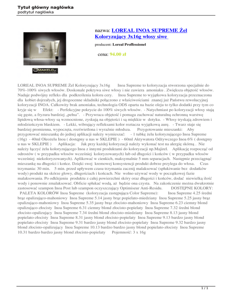 Tytuł główny nagłówka podtytuł nagłówka nazwa: LOREAL INOA SUPREME Żel Koloryzujący 3x16g włosy siwe producent: Loreal Proffessionel cena: 94.00 zł LOREAL INOA SUPREME Żel Koloryzujący 3x16g Inoa Supreme to koloryzacja stworzona specjalnie do 70%-100% siwych włosów. Doskonale pokrywa siwe włosy i nie zawiera amoniaku . Zwiększa objętość włosów. Nadaje podwójny refleks dla podkreślenia koloru cery. Inoa Supreme to wyjątkowa koloryzacja przeznaczona dla kobiet dojrzałych, jej drogocenne składniki połączono z właściwościami znanej już Państwu rewolucyjnej koloryzacji INOA. Całkowity brak amoniaku, technologia ODS oparta na bazie oleju to tylko dodatki przy tym co kryje się w Efekt: - Perfekcyjne pokrycie do 100% siwych włosów. - Natychmiast po koloryzacji włosy stają się gęste, a fryzura bardziej „pełna”. - Przywraca objętość i pomaga zachować naturalną ochronną warstwę lipidową włosa-włosy są wzmocnione, zyskują na objętości i są miękkie w dotyku. - Włosy tryskają zdrowiem i młodzieńczym blaskiem. - Lekki, wibrujący refleksami kolor roztacza wyjątkową aurę. - Twarz staje się bardziej promienna, wypoczęta, rozświetlona i wyraźnie młodsza. Przygotowanie mieszanki: Aby przygotować mieszankę do jednej aplikacji należy wymieszać: - 1 tubkę żelu koloryzującego Inoa Supreme (16g) - 40ml Oleożelu Inoa ( dostępny u nas w SKLEPIE ) - 60ml Aktywatora Odżywczego Inoa 6% ( dostępny u nas w SKLEPIE ) Aplikacja: Jak przy każdej koloryzacji należy wykonać test na alergię skórną . Nie należy łączyć żelu koloryzującego Inoa z innymi produktami do koloryzacji np.Majirel. Aplikację rozpocząć od odrostów ( w przypadku włosów wcześniej koloryzowanych) lub od długości i końców ( w przypadku włosów wcześniej niekoloryzowanych). Aplikować w cienkich, maksymalnie 5 mm separacjach. Następnie przeciągnąć mieszankę na długości i końce. Dzięki swej kremowej konsystencji produkt dobrze przylega do włosa. Czas trzymania: 30 min. 5 min. przed upływem czasu trzymania zacznij malaksować (spłukiwanie bez dodatków wody) produkt na skórze głowy, długościach i końcach. Nie wolno używać wody w początkowej fazie malaksowania. Po odklejeniu produktu z całej powierzchni skóry oraz długości i końców, dodać niewielką ilość wody i ponownie zmalaksować. Obficie spłukać wodą, aż będzie ona czysta. Na zakończenie można dwukrotnie zastosować szampon Inoa Post lub szampon oczyszczający Optimiseur Anti-Residu. DOSTĘPNE KOLORY: PALETA KOLORÓW Inoa Supreme (koloryzacja zastępująca Color Supreme): Inoa Supreme 4.25 średni brąz opalizująco-mahoniowy Inoa Supreme 5.14 jasny brąz popielato-miedziany Inoa Supreme 5.25 jasny brąz opalizująco-mahoniowy Inoa Supreme 5.35 jasny brąz złocisto-mahoniowy Inoa Supreme 6.23 ciemny blond opalizująco-złocisty Inoa Supreme 6.31 ciemny blond złocisto-popielaty Inoa Supreme 7.32 średni blond złocisto-opalizujący Inoa Supreme 7.34 średni blond złocisto-miedziany Inoa Supreme 8.13 jasny blond popielato-złocisty Inoa Supreme 8.31 jasny blond złocisto-popielaty Inoa Supreme 9.13 bardzo jasny blond popielato-złocisty Inoa Supreme 9.31 bardzo jasny blond złocisto-popielaty Inoa Supreme 9.32 bardzo jasny blond złocisto-opalizujący Inoa Supreme 10.13 bardzo bardzo jasny blond popielato-złocisty Inoa Supreme 10.31 bardzo bardzo jasny blond złocisto-popielaty Pojemność: 3 x 16g 1/1