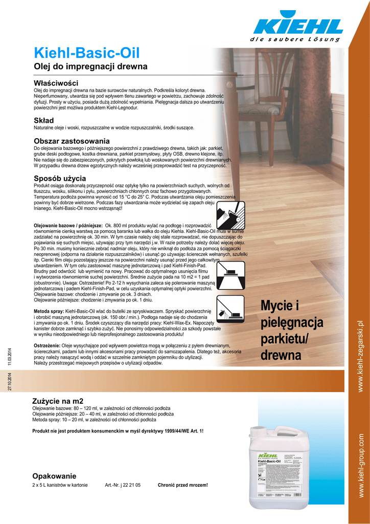 Kiehl-Basic-Oil Olej do impregnacji drewna Właściwości Olej do impregnacji drewna na bazie surowców naturalnych. Podkreśla koloryt drewna. Nieperfumowany, utwardza się pod wpływem tlenu zawartego w powietrzu, zachowuje zdolność dyfuzji. Prosty w użyciu, posiada dużą zdolność wypełniania. Pielęgnacja dalsza po utwardzeniu powierzchni jest możliwa produktem Kiehl-Legnodur. Skład Naturalne oleje i woski, rozpuszczalne w wodzie rozpuszczalniki, środki suszące. Obszar zastosowania Do olejowania bazowego i późniejszego powierzchni z prawdziwego drewna, takich jak: parkiet, grube deski podłogowe, kostka drewniana, parkiet przemysłowy, płyty OSB, drewno klejone, itp. Nie nadaje się do zabezpieczonych, pokrytych powłoką lub woskowanych powierzchni drewnianych. W przypadku drewna drzew egzotycznych należy wcześniej przeprowadzić test na przyczepność. Sposób użycia Olejowanie bazowe / późniejsze: Ok. 800 ml produktu wylać na podłogę i rozprowadzić równomiernie cienką warstwą za pomocą baranka lub wałka do oleju Kiehla. Kiehl-Basic-Oil musi w sumie zadziałać na powierzchnię ok. 30 min. W tym czasie należy olej stale rozprowadzać, nie dopuszczając do pojawiania się suchych miejsc, używając przy tym narzędzi j.w. W razie potrzeby należy dolać więcej oleju. Po 30 min. musimy koniecznie zebrać nadmiar oleju, który nie wniknął do podłoża za pomocą ściągaczki neoprenowej (odporna na działanie rozpuszczalników) i usunąć go używając ściereczek wełnanych, szufelki itp. Cienki film oleju pozostający jeszcze na powierzchni należy usunąć przed jego całkowitym utwardzeniem. W tym celu zastosować maszynę jednotarczową i pad Kiehl-Finish-Pad. Brudny pad odwrócić lub wymienić na nowy. Pracować do optymalnego usunięcia filmu i wytworzenia równomiernie suchej powierzchni. Średnie zużycie pada na 10 m2 = 1 pad (obustronnie). Uwaga: Ostrzeżenie! Po 2-12 h wysychania zaleca się polerowanie maszyną jednotarczową i padem Kiehl-Finish-Pad, w celu uzyskania optymalnej optyki powierzchni. Olejowanie bazowe: chodzenie i zmywanie po ok. 3 dniach. Olejowanie późniejsze: chodzenie i zmywania po ok. 1 dniu. Ostrzeżenie: Oleje wysychające pod wpływem powietrza mogą w połączeniu z pyłem drewnianym, ściereczkami, padami lub innymi akcesoriami pracy prowadzić do samozapalenia. Dlatego też, akcesoria pracy należy nasączyć wodą i oddać w szczelnie zamkniętym pojemniku do utylizacji. Należy przestrzegać miejsowych przepisów o utylizacji odpadów. 27.10.2014 Mycie i pielęgnacja parkietu/ drewna Zużycie na m2 Olejowanie bazowe: 80 – 120 ml, w zależności od chłonności podłoża Olejowanie późniejsze: 20 – 40 ml, w zależności od chłonności podłoża Metoda spray: 10 – 20 ml, w zależności od chłonności podłoża Produkt nie jest produktem konsumenckim w myśl dyrektywy 1999/44/WE Art. 1! Opakowanie 2 x 5 L kanistrów w kartonie Art.-Nr. j 22 21 05 Chronić przed mrozem! www.kiehl-group.com 11.03.2014 Metoda spray: Kiehl-Basic-Oil wlać do butelki ze spryskiwaczem. Spryskać powierzchnię i obrobić maszyną jednotarczową (ok. 150 obr./ min.). Podłoga nadaje się do chodzenia i zmywania po ok. 1 dniu. Środek czyszczący dla narzędzi pracy: Kiehl-Wax-Ex. Napoczęty kanister dobrze zamknąć i szybko zużyć. Nie ponosimy odpowiedzialności za szkody powstałe w wyniku nieodpowiedniego lub nieprofesjonalnego zastosowania produktu! www.kiehl-zegarski.pl Produkt osiąga doskonałą przyczepność oraz optykę tylko na powierzchniach suchych, wolnych od tłuszczu, wosku, silikonu i pyłu, powierzchniach chłonnych oraz fachowo przygotowanych. Temperatura podłoża powinna wynosić od 15 °C do 25° C. Podczas utwardzania oleju pomieszczenia powinny być dobrze wietrzone. Podczas fazy utwardzania może wydzielać się zapach oleju lnianego. Kiehl-Basic-Oil mocno wstrząsnąć!