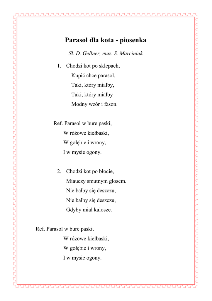Parasol dla kota - piosenka Sł. D. Gellner, muz. S. Marciniak 1. Chodzi kot po sklepach, Kupić chce parasol, Taki, który miałby, Taki, który miałby Modny wzór i fason. Ref. Parasol w bure paski, W różowe kiełbaski, W gołębie i wrony, I w mysie ogony. 2. Chodzi kot po błocie, Miauczy smutnym głosem. Nie bałby się deszczu, Nie bałby się deszczu, Gdyby miał kalosze. Ref. Parasol w bure paski, W różowe kiełbaski, W gołębie i wrony, I w mysie ogony. 3. Nagle wyszła z nory, Myszka z czarnym nosem. Pożyczyła kotu, Pożyczyła kotu, Wszystko o co prosił. Ref. Kalosze i parasol, Co modny ma fason I wzorek złocony w gołębie i wrony. Kalosze i parasol, Co modny ma fason. Prześliczny i nowy, Komplecik deszczowy.