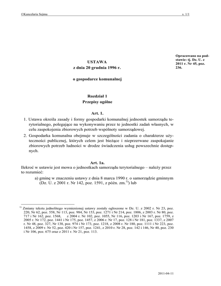 ©Kancelaria Sejmu s. 1/1 Opracowano na podstawie: tj. Dz. U. z 2011 r. Nr 45, poz. 236. USTAWA z dnia 20 grudnia 1996 r. o gospodarce komunalnej Rozdział 1 Przepisy ogólne Art. 1. 1. Ustawa określa zasady i formy gospodarki komunalnej jednostek samorządu terytorialnego, polegające na wykonywaniu przez te jednostki zadań własnych, w celu zaspokojenia zbiorowych potrzeb wspólnoty samorządowej. 2. Gospodarka komunalna obejmuje w szczególności zadania o charakterze użyteczności publicznej, których celem jest bieżące i nieprzerwane zaspokajanie zbiorowych potrzeb ludności w drodze świadczenia usług powszechnie dostępnych. Art. 1a. Ilekroć w ustawie jest mowa o jednostkach samorządu terytorialnego – należy przez to rozumieć: a) gminę w znaczeniu ustawy z dnia 8 marca 1990 r. o samorządzie gminnym (Dz. U. z 2001 r. Nr 142, poz. 1591, z późn. zm.1)) lub 1) Zmiany tekstu jednolitego wymienionej ustawy zostały ogłoszone w Dz. U. z 2002 r. Nr 23, poz. 220, Nr 62, poz. 558, Nr 113, poz. 984, Nr 153, poz. 1271 i Nr 214, poz. 1806, z 2003 r. Nr 80, poz. 717 i Nr 162, poz. 1568, z 2004 r. Nr 102, poz. 1055, Nr 116, poz. 1203 i Nr 167, poz. 1759, z 2005 r. Nr 172, poz. 1441 i Nr 175, poz. 1457, z 2006 r. Nr 17, poz. 128 i Nr 181, poz. 1337, z 2007 r. Nr 48, poz. 327, Nr 138, poz. 974 i Nr 173, poz. 1218, z 2008 r. Nr 180, poz. 1111 i Nr 223, poz. 1458, z 2009 r. Nr 52, poz. 420 i Nr 157, poz. 1241, z 2010 r. Nr 28, poz. 142 i 146, Nr 40, poz. 230 i Nr 106, poz. 675 oraz z 2011 r. Nr 21, poz. 113. 2011-04-11 ©Kancelaria Sejmu s. 2/2 b) powiat w znaczeniu ustawy z dnia 5 czerwca 1998 r. o samorządzie powiatowym (Dz. U. z 2001 r. Nr 142, poz. 1592, z późn. zm.2)) lub c) województwo w znaczeniu ustawy z dnia 5 czerwca 1998 r. o samorządzie województwa (Dz. U. z 2001 r. Nr 142, poz. 1590, z późn. zm.3)). Art. 2. Gospodarka komunalna może być prowadzona przez jednostki samorządu terytorialnego w szczególności w formach samorządowego zakładu budżetowego lub spółek prawa handlowego. Art. 3. 1. Jednostki samorządu terytorialnego w drodze umowy mogą powierzać wykonywanie zadań z zakresu gospodarki komunalnej osobom fizycznym, osobom prawnym lub jednostkom organizacyjnym nieposiadającym osobowości prawnej, z uwzględnieniem przepisów ustawy z dnia 27 sierpnia 2009 r. ustawy o finansach publicznych (Dz. U. Nr 157, poz. 1240, z późn. zm.4)), w trybie przepisów z dnia 19 grudnia 2008 r. o partnerstwie publiczno-prywatnym (Dz. U. z 2009 r. Nr 19, poz. 100 oraz z 2010 r. Nr 106, poz. 675), przepisów ustawy z dnia 9 stycznia 2009 r. o koncesji na roboty budowlane lub usługi (Dz. U. Nr 19, poz. 101, z późn. zm.5)), przepisów ustawy z dnia 29 stycznia 2004 r. – Prawo zamówień publicznych (Dz. U. z 2010 r. Nr 113, poz. 759, z późn. zm.6)), przepisów ustawy z dnia 24 kwietnia 2003 r. o działalności pożytku publicznego i o wolontariacie (Dz. U. z 2010 r. Nr 234, poz. 1536) i ustawy z dnia 16 grudnia 2010 r. o publicznym transporcie zbiorowym (Dz. U. z 2011 r. Nr 5, poz. 13) albo na zasadach ogólnych. 2. Jeżeli do prowadzenia danego rodzaju działalności na podstawie innych ustaw jest wymagane uzyskanie zezwolenia, jednostki samorządu terytorialnego mogą powierzyć wykonywanie zadań wyłącznie podmiotowi posiadającemu wymagane zezwolenie. 2) Zmiany tekstu jednolitego wymienionej ustawy zostały ogłoszone w Dz. U. z 2002 r. Nr 23, poz. 220, Nr 62, poz. 558, Nr 113, poz. 984, Nr 153, poz. 1271, Nr 200, poz. 1688 i Nr 214, poz. 1806, z 2003 r. Nr 162, poz. 1568, z 2004 r. Nr 102, poz. 1055 i Nr 167, poz. 1759, z 2007 r. Nr 173, poz. 1218, z 2008 r. Nr 180, poz. 1111 i Nr 223, poz. 1458, z 2009 r. Nr 92, poz. 753 i Nr 157, poz. 1241, z 2010 r. Nr 28, poz. 142 i 146, Nr 40, poz. 230 i Nr 106, poz. 675 oraz z 2011 r. Nr 21, poz. 113. 3) Zmiany tekstu jednolitego wymienionej ustawy zostały ogłoszone w Dz. U. z 2002 r. Nr 23, poz. 220, Nr 62, poz. 558, Nr 153, poz. 1271 i Nr 214, poz. 1806, z 2003 r. Nr 162, poz. 1568, z 2004 r. Nr 102, poz. 1055, Nr 116, poz. 1206 i Nr 167, poz. 1759, z 2006 r. Nr 126, poz. 875 i Nr 227, poz. 1658, z 2007 r. Nr 173, poz. 1218, z 2008 r. Nr 180, poz. 1111, Nr 216, poz. 1370 i Nr 223, poz. 1458, z 2009 r. Nr 157, poz. 1241, z 2010 r. Nr 28, poz. 142 i 146, Nr 40, poz. 230 i Nr 106, poz. 675 oraz z 2011 r. Nr 21, poz. 113. 4) Zmiany wymienionej ustawy zostały ogłoszone w Dz. U. z 2010 r. Nr 28, poz. 146, Nr 96, poz. 620, Nr 123, poz. 835, Nr 152, poz. 1020, Nr 238, poz. 1578 i Nr 257, poz. 1726. 5) Zmiany wymienionej ustawy zostały ogłoszone w Dz. U. z 2009 r. Nr 157, poz. 1241 i Nr 223, poz. 1778 oraz z 2010 r. Nr 106, poz. 675 i Nr 182, poz. 1228. 6) Zmiany tekstu jednolitego wymienionej ustawy zostały ogłoszone w Dz. U. z 2010 r. Nr 161, poz. 1078 i Nr 182, poz. 1228 oraz z 2011 r. Nr 5, poz. 13. I Nr 28, poz. 143. 2011-04-11 ©Kancelaria Sejmu s. 3/3 Art. 4. 1. Jeżeli przepisy szczególne nie stanowią inaczej, organy stanowiące jednostek samorządu terytorialnego postanawiają o: 1) wyborze sposobu prowadzenia i form gospodarki komunalnej; 2) wysokości cen i opłat albo o sposobie ustalania cen i opłat za usługi komunalne o charakterze użyteczności publicznej oraz za korzystanie z obiektów i urządzeń użyteczności publicznej jednostek samorządu terytorialnego. 2. Uprawnienia, o których mowa w ust. 1 pkt 2, organy stanowiące jednostek samorządu terytorialnego mogą powierzyć organom wykonawczym tych jednostek. Art. 5. Przepisy ustawy stosuje się odpowiednio do wykonywania zadań, o których mowa w art. 1, przez związki międzygminne (związki komunalne), przez miasto stołeczne Warszawa oraz w ramach porozumień komunalnych. Rozdział 2 Samorządowe zakłady budżetowe Art. 6. 1. Organy stanowiące jednostek samorządu terytorialnego mogą tworzyć, łączyć, przekształcać w inną formę organizacyjno-prawną i likwidować samorządowe zakłady budżetowe zgodnie z przepisami ustawy or