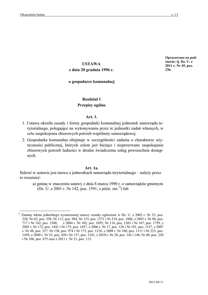USTAWA z dnia 20 grudnia 1996 r. o gospodarce komunalnej