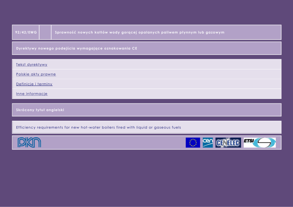 9 2 / 4 2/ EW G Spr a w noś ć n o wy ch k otł ó w w od y g or ą cej opa lan y ch pa li w em pł yn ny m lu b ga zo w y m Dyr e kt y wy n o w eg o p od ej ś c ia wy ma gają c e o zna k o wan ia C E Tek st d yre kt yw y P ol ski e akt y pr aw n e Defi nicj e i t e rmi n y I n n e inf or mac je Skr ó co ny t yt uł ang ie ls ki E ffi ci enc y r eq ui r em e n t s f o r n ew h ot - w at er b oile r s fi re d w it h liq uid or ga se o u s f uel s