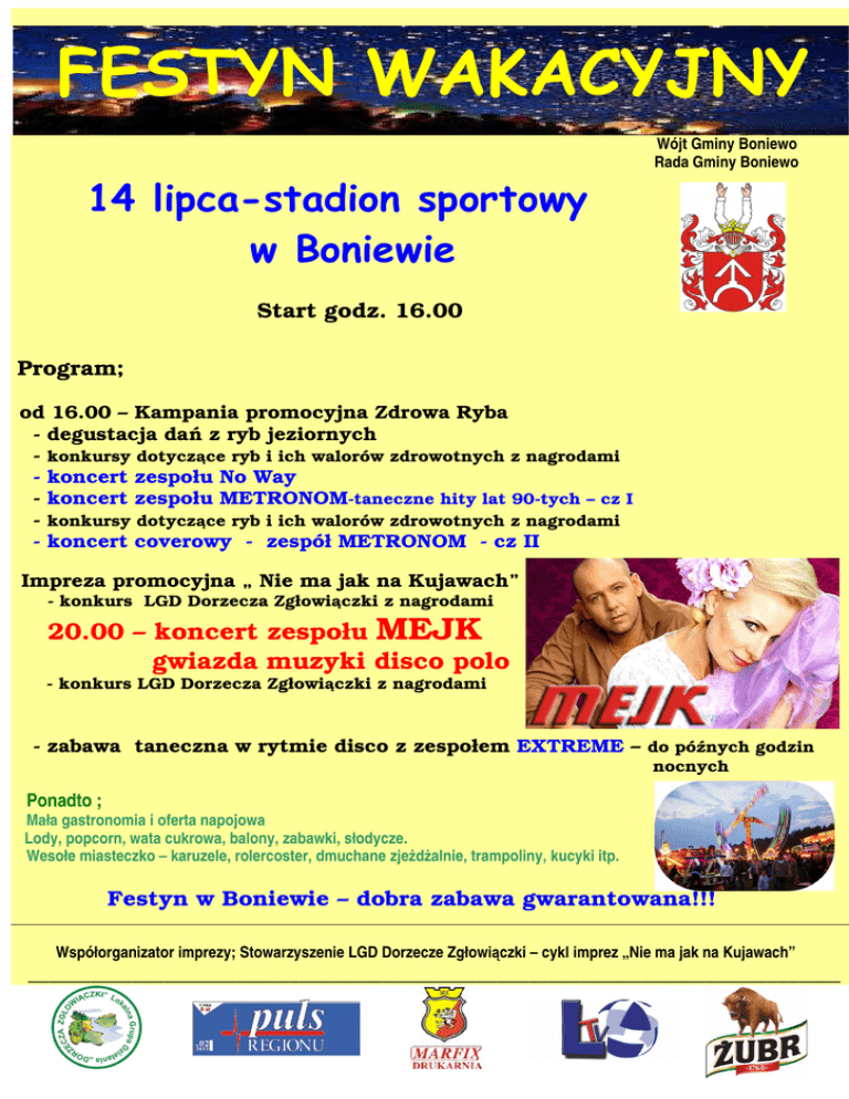 FESTYN WAKACYJNY Wójt Gminy Boniewo Rada Gminy Boniewo 14 lipca-stadion sportowy w Boniewie Start godz. 16.00 Program; od 16.00 – Kampania promocyjna Zdrowa Ryba - degustacja dań z ryb jeziornych - konkursy dotyczące ryb i ich walorów zdrowotnych z nagrodami - koncert zespołu No Way - koncert zespołu METRONOM-taneczne hity lat 90-tych – cz I - konkursy dotyczące ryb i ich walorów zdrowotnych z nagrodami - koncert coverowy - zespół METRONOM - cz II Impreza promocyjna „ Nie ma jak na Kujawach” - konkurs LGD Dorzecza Zgłowiączki z nagrodami 20.00 – koncert zespołu MEJK gwiazda muzyki disco polo - konkurs LGD Dorzecza Zgłowiączki z nagrodami - zabawa taneczna w rytmie disco z zespołem EXTREME – do późnych godzin nocnych Ponadto ; Mała gastronomia i oferta napojowa Lody, popcorn, wata cukrowa, balony, zabawki, słodycze. Wesołe miasteczko – karuzele, rolercoster, dmuchane zjeŜdŜalnie, trampoliny, kucyki itp. Festyn w Boniewie – dobra zabawa gwarantowana!!! Współorganizator imprezy; Stowarzyszenie LGD Dorzecze Zgłowiączki – cykl imprez „Nie ma jak na Kujawach” ______________________________________________________________________________