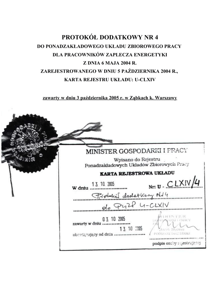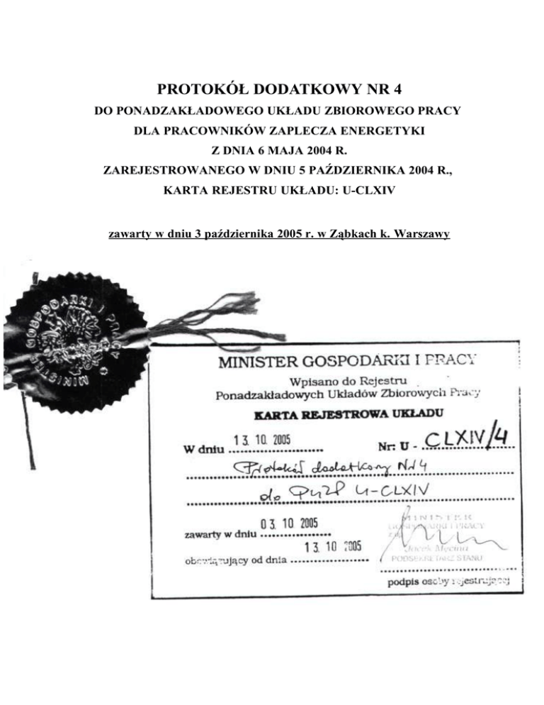 PROTOKÓŁ DODATKOWY NR 4 DO PONADZAKŁADOWEGO UKŁADU ZBIOROWEGO PRACY DLA PRACOWNIKÓW ZAPLECZA ENERGETYKI Z DNIA 6 MAJA 2004 R. ZAREJESTROWANEGO W DNIU 5 PAŹDZIERNIKA 2004 R., KARTA REJESTRU UKŁADU: U-CLXIV zawarty w dniu 3 października 2005 r. w Ząbkach k. Warszawy 2 PROTOKÓŁ DODATKOWY NR 4 DO PONADZAKŁADOWEGO UKŁADU ZBIOROWEGO PRACY DLA PRACOWNIKÓW ZAPLECZA ENERGETYKI Z DNIA 6 MAJA 2004 R. ZAREJESTROWANEGO W DNIU 5 PAŹDZIERNIKA 2004 R., KARTA REJESTRU UKŁADU: U-CLXIV zawarty w dniu 3 października w Ząbkach k. Warszawy: − ze strony pracodawców – przez właściwy statutowo organ organizacji pracodawców, tj.: 1. Zarząd ZWIĄZKU PRACODAWCÓW ZAPLECZA ENERGETYKI z siedzibą w Krakowie, 30-415 Kraków, ul. Wadowicka 14, reprezentowany przez przewodniczącego Zarządu, pana Jana Stopkę, − ze strony pracowników – przez właściwe statutowo organy wszystkich ponadzakładowych organizacji związkowych, będących stroną Układu, tj.: 1. ZARZĄD GŁÓWNY ZRZESZENIA ZWIĄZKÓW ZAWODOWYCH ENERGETYKÓW z siedzibą w Warszawie, 00-628 Warszawa, ul. Marszałkowska 21/25 m.76, reprezentowany przez przewodniczącego Zrzeszenia Związków Zawodowych Energetyków, pana Włodzimierza Kraskę, 2. KOMISJĘ KRAJOWĄ NIEZALEŻNEGO SAMORZĄDNEGO ZWIĄZKU ZAWODOWEGO „SOLIDARNOŚĆ” z siedzibą w Gdańsku, 80-855 Gdańsk, ul. Wały Piastowskie 24, reprezentowaną przez wiceprzewodniczącego Sekretariatu Górnictwa i Energetyki NSZZ „Solidarność”, pana Eugeniusza Jaroszewskiego, 3. PRZEWODNICZĄCEGO OGÓLNOKRAJOWEGO ZRZESZENIA ZWIĄZKÓW ZAWODOWYCH PRACOWNIKÓW RUCHU CIĄGŁEGO, pana Kazimierza Drabika, z siedzibą w Warszawie, 01-402 Warszawa, ul. E. Ciołka12, 4. ZARZĄD KRAJOWY ZWIĄZKU ZAWODOWEGO INŻYNIERÓW I TECHNIKÓW z siedzibą w Warszawie, 00-050 Warszawa, ul. Świętokrzyska 14 A, reprezentowany przez przewodniczącego Krajowej Sekcji Przemysłu Energetycznego Związku Zawodowego Inżynierów i Techników, pana Marka Soleckiego. §1 W Ponadzakładowym Układzie Zbiorowym Pracy dla Pracowników Zaplecza Energetyki, 3 zawartym w dniu 6 maja 2004 r., Załącznik Nr 1 do Układu otrzymuje brzmienie, określone w załączniku nr 1 do protokołu. §2 Protokół dodatkowy zawiera się na czas nieokreślony. §3 Protokół dodatkowy wchodzi w życie z dniem zarejestrowania. PROTOKÓŁ PODPISALI: 4 Załącznik Nr 1 do Protokołu Dodatkowego Nr 4 „Załącznik Nr 1 do Ponadzakładowego Układu Zbiorowego Pracy dla Pracowników Zaplecza Energetyki z dnia 06.05.2004 r. Karta Rejestru Układu: U-CLXIV WY KAZ jednostek - członków Związku Pracodawców Zaplecza Energetyki objętych Ponadzakładowym Układem Zbiorowym Pracy dla Pracowników Zaplecza Energetyki 1. Przedsiębiorstwo Budownictwa Elektroenergetycznego ,,ELBUD" w Lublinie ul. Olszewskiego 18, 20-471 LUBLIN, 2. Przedsiębiorstwo Techniczno-Usługowe ,,ELBUD" Sp. z o.o. ul. Wadowicka 12, 30-415 KRAKÓW, 3. Zakład Wykonawstwa Sieci Elektrycznych Kraków SA ul. Pachońskiego 9, 31-223 KRAKÓW, 4. Zakłady Remontowe Energetyki Lublin SA ul. Garbarska 20, 20-340 LUBLIN, 5. Zakłady Remontowe Energetyki Kraków Sp. z o.o. ul. Wadowicka 14, 30-415 KRAKÓW, 6. Zakłady Remontowe Energetyki Katowice SA ul. Gen. Z.W. Jankego 13, 40-615 KATOWICE, 7. Zakład Wykonawstwa Sieci Elektrycznych Rzeszów Sp. z o.o. ul. Przemysłowa 1, 35-105 RZESZÓW, 8. Przedsiębiorstwo Techniczno-Usługowe Energetyki ,,ZUTEN" Sp. z o.o. ul. Nyska 48, 50-505 WROCŁAW, 9. Biuro Studiów i Projektów Energetycznych ENERGOPROJEKT Poznań SA ul. Piekary 19, 60-967 POZNAŃ, 10. ENERGOPROJEKT - Zakład Doświadczalny Sp. z o.o. ul. Z. Nałkowskiej 41, 60-573 POZNAŃ, 11. Biuro Studiów i Projektów Energetycznych ENERGOPROJEKT Kraków SA ul. Mazowiecka 21, 30-019 KRAKÓW, 12. ELCON ELBUD SA ul. Płk. St. Dąbka 8, 30-732 KRAKÓW, 13. Przedsiębiorstwo Budownictwa Elektroenergetycznego ELBUD Poznań SA ul. Wołczyńska 37, 60-003 POZNAŃ, 14. Przedsiębiorstwo Produkcyjno-Remontowe Energetyki ,,ENERGOSERWIS" SA ul. Powstańców Śląskich 85, 42-701 LUBLINIEC, 15. Przedsiębiorstwo Stalowych Konstrukcji Elektroenergetycznych ELBUD w Krakowie ul. Wadowicka 12, 30-415 KRAKÓW, 16. Zakład Usług Technicznych Energetyki P.P. ul. Żeromskiego 75, 26-600 RADOM, 17. Zakład Produkcyjno-Remontowy Energetyki ,,JEDLICZE" Sp. z o.o. ul. Kurkowskiego 86, 38-460 JEDLICZE, 18. Zakłady Produkcyjno-Remontowe Energetyki ,,ENERGOPREM" we Wrocławiu Sp. z o.o. ul. Nyska 48, 50-505 WROCŁAW, 19. Zakład Wykonawstwa Sieci Elektrycznych Białystok P.P. ul. I Armii Wojska Polskiego 8, 15-103 BIAŁYSTOK, 20. Zakłady Produkcyjno-Remontowe Energetyki Poznań „ENERGETYKA-CZERWONAK" SA ul. Gdyńska 83, 62-004 CZERWONAK, 21. Przedsiębiorstwo Budownictwa Elektroenergetycznego ELBUD w Katowicach Sp. z o.o. ul. Ks. Bpa Herberta Bednorza 19, 40-384 KATOWICE, 5 22. ELBUD GDAŃSK HOLDING SA ul. Marynarki Polskiej 87, 80-557 GDAŃSK, 23. Zakład Transportu Energetyki ZTiSZE Sp. z o.o. ul. Chełmżyńska 180A, 04-464 WARSZAWA, 24. Instytut Automatyki Systemów Energetycznych ul. Wystawowa 1, 51-618 WROCŁAW, 25. Centrum Naukowo-Produkcyjne Automatyki Energetycznej SA ul. Bacciarellego 54, 51-649 WROCŁAW, 26. Przedsiębiorstwo Zaopatrzeniowo-Handlowe Zespołu Elektrociepłowni Wrocław Sp. z o.o. ul. Łowiecka 24, 50-220 WROCŁAW, 27. Przedsiębiorstwo Serwisowe Zespołu Elektrociepłowni Wrocław Sp. z o.o. ul. Łowiecka 24, 50-220 WROCŁAW, 28. Instytut Energetyki ul. Mory 8, 01-330 WARSZAWA, 29. ENGOREM Sp. z o.o. ul. Puszkina 78, 92-516 ŁÓDŹ, 30. Ośrodek Badawczo-Rozwojowy Gospodarki Remontowej Energetyki ul. Nyska 64, 50-505 WROCŁAW, 31. ZTE RADOM Sp. z o.o. ul. Toruńska 7, 26-600 RADOM, 32. Zakłady Pomiarowo-Badawcze Energetyki ENERGOPOMIAR Sp. z o.o. ul. Gen. J. Sowińskiego 3, 44-101 GLIWICE, 33. ZIAD Bielsko-Biała SA Al. Armii Krajowej 220, 43-316 BIELSKO-BIAŁA, 34. Biuro Studiów i Projektów Energetycznych ENERGOPROJEKT - GLIWICE SA ul. Zygmunta Starego 11, 44-101