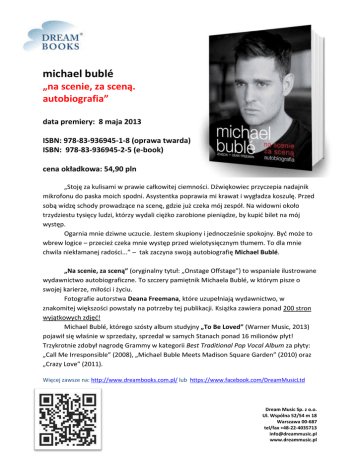 michael bublé „na scenie, za sceną. autobiografia” data premiery: 8 maja 2013 ISBN: 978-83-936945-1-8 (oprawa twarda) ISBN: 978-83-936945-2-5 (e-book) cena okładkowa: 54,90 pln „Stoję za kulisami w prawie całkowitej ciemności. Dźwiękowiec przyczepia nadajnik mikrofonu do paska moich spodni. Asystentka poprawia mi krawat i wygładza koszulę. Przed sobą widzę schody prowadzące na scenę, gdzie już czeka mój zespół. Na widowni około trzydziestu tysięcy ludzi, którzy wydali ciężko zarobione pieniądze, by kupić bilet na mój występ. Ogarnia mnie dziwne uczucie. Jestem skupiony i jednocześnie spokojny. Być może to wbrew logice – przecież czeka mnie występ przed wielotysięcznym tłumem. To dla mnie chwila niekłamanej radości...” – tak zaczyna swoją autobiografię Michael Bublé. „Na scenie, za sceną” (oryginalny tytuł: „Onstage Offstage”) to wspaniale ilustrowane wydawnictwo autobiograficzne. To szczery pamiętnik Michaela Bublé, w którym pisze o swojej karierze, miłości i życiu. Fotografie autorstwa Deana Freemana, które uzupełniają wydawnictwo, w znakomitej większości powstały na potrzeby tej publikacji. Książka zawiera ponad 200 stron wyjątkowych zdjęć! Michael Bublé, którego szósty album studyjny „To Be Loved” (Warner Music, 2013) pojawił się właśnie w sprzedaży, sprzedał w samych Stanach ponad 16 milionów płyt! Trzykrotnie zdobył nagrodę Grammy w kategorii Best Traditional Pop Vocal Album za płyty: „Call Me Irresponsible” (2008), „Michael Buble Meets Madison Square Garden” (2010) oraz „Crazy Love” (2011). Więcej zawsze na: http://www.dreambooks.com.pl/ lub https://www.facebook.com/DreamMusicLtd Dream Music Sp. z o.o. Ul. Wspólna 52/54 m 18 Warszawa 00-687 tel/fax +48-22-4035713 [email protected] www.dreammusic.pl
