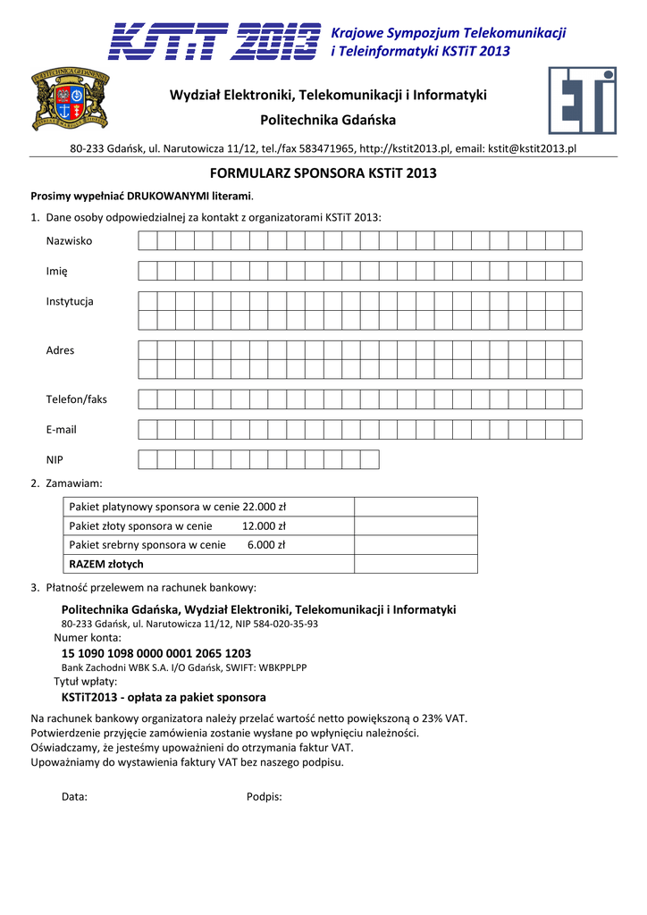 Krajowe Sympozjum Telekomunikacji i Teleinformatyki KSTiT 2013 Wydział Elektroniki, Telekomunikacji i Informatyki Politechnika Gdańska 80-233 Gdańsk, ul. Narutowicza 11/12, tel./fax 583471965, http://kstit2013.pl, email: [email protected] FORMULARZ SPONSORA KSTiT 2013 Prosimy wypełniać DRUKOWANYMI literami. 1. Dane osoby odpowiedzialnej za kontakt z organizatorami KSTiT 2013: Nazwisko Imię Instytucja Adres Telefon/faks E-mail NIP 2. Zamawiam: Pakiet platynowy sponsora w cenie 22.000 zł Pakiet złoty sponsora w cenie Pakiet srebrny sponsora w cenie 12.000 zł 6.000 zł RAZEM złotych 3. Płatność przelewem na rachunek bankowy: Politechnika Gdańska, Wydział Elektroniki, Telekomunikacji i Informatyki 80-233 Gdańsk, ul. Narutowicza 11/12, NIP 584-020-35-93 Numer konta: 15 1090 1098 0000 0001 2065 1203 Bank Zachodni WBK S.A. I/O Gdańsk, SWIFT: WBKPPLPP Tytuł wpłaty: KSTiT2013 - opłata za pakiet sponsora Na rachunek bankowy organizatora należy przelać wartość netto powiększoną o 23% VAT. Potwierdzenie przyjęcie zamówienia zostanie wysłane po wpłynięciu należności. Oświadczamy, że jesteśmy upoważnieni do otrzymania faktur VAT. Upoważniamy do wystawienia faktury VAT bez naszego podpisu. Data: Podpis: