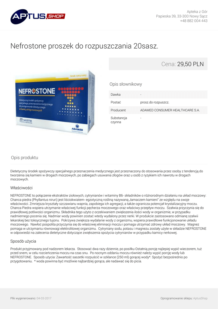 Apteka z Gór Papieska 39, 33-300 Nowy Sącz +48 882 004 443 Nefrostone proszek do rozpuszczania 20sasz. Cena: 29,50 PLN Opis słownikowy Dawka - Postać prosz.do rozpuszcz. Producent ADAMED CONSUMER HEALTHCARE S.A. Substancja czynna - Opis produktu Dietetyczny środek spożywczy specjalnego przeznaczenia medycznego jest przeznaczony do stosowania przez osoby z tendencją do tworzenia się kamieni w drogach moczowych, po zabiegach usuwania złogów oraz u osób z ryzykiem ich nawrotu w drogach moczowych. Właściwości NEFROSTONE to połączenie ekstraktów ziołowych, cytrynianów i witaminy B6- składników o różnorodnym działaniu na układ moczowy: Chanca piedra (Phyllantus niruri) jest liściokwiatem- egzotyczną rośliną nazywaną „łamaczem kamieni” ze względu na swoje właściwości. Zmniejsza kryształy szczawianu wapnia, zapobiega ich agregacji, a także ogranicza potencjał krystalizacyjny moczu. Chanca Piedra wspiera utrzymanie właściwej funkcji pęcherza moczowego oraz właściwy przepływ moczu. Szałwia przyczynia się do prawidłowej potliwości organizmu. Składnika tego użyto z oczekiwaniem zwiększenia ilości wody w organizmie, w przypadku nadmiernego pocenia się. Nadmiar wody powinien zostać wtedy wydalony przez nerki. W produkcie zastosowano odmianę szałwii lekarskiej bez toksycznego tujonu. Pokrzywa zwiększa wydalanie wody z organizmu, wspiera prawidłowe funkcjonowanie układu moczowego. Nawłoć pospolita przyczynia się do właściwej eliminacji moczu i pomaga utrzymać zdrowy układ moczowy. Magnez pomaga w utrzymaniu równowagi elektrolitowej organizmu. Cytryniany sodu, potasu i magnezu zostały użyte w składzie NEFROSTONE w odpowiedzi na zalecenia dietetyczne dotyczące zwiększenia spożycia cytrynianów w przypadku kamicy nerkowej. Sposób użycia Produkt przyjmowany pod nadzorem lekarza. Stosować dwa razy dziennie, po posiłku Ostatnią porcję najlepiej wypić wieczorem, tuż przed snem, w celu rozcieńczenia moczu na czas snu. Po nocnym oddaniu moczu również należy wypić porcję wody lub NEFROSTONE. Sposób użycia: Zawartość saszetki rozpuścić w szklance (250 ml) gorącej wody*. Spożyć bezpośrednio po przygotowaniu. * woda powinna być możliwie najbardziej gorąca, ale nadawać się do picia. Plik wygenerowano: 04-03-2017 Powered by TCPDF (www.tcpdf.org) Oprogramowanie sklepu: AptusShop