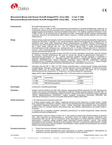 Monoclonal Mouse Anti-Human HLA-DR Antigen/FITC, Clone AB3, Monoclonal Mouse Anti-Human HLA-DR Antigen/RPE, Clone AB3, Przeznaczenie nr kat. F 7266 nr kat. R 7267 Do badań diagnostycznych in vitro. Produkty o nr kat. C 7266 i R 7267 są przeznaczone do stosowania w cytometrii przepływowej. Uważa się, że przeciwciała przeciw HLA-DR stosowane wraz z panelem innych przeciwciał (1-3) pełnią zasadniczą rolę we wstępnej ocenie ostrej białaczki, chronicznej białaczki limfocytów T i B i białaczki szpikowej. Produkty o nr kat. F7266 i R7267 nie są przeznaczone do typowania komórek. Interpretację wyników powinien przeprowadzić pracownik uprawniony do wykonywania takich badań w oparciu o historię choroby pacjenta oraz inne testy diagnostyczne. Wstęp Główna funkcja cząsteczek antygenu ludzkich leukocytów (HLA) polega na prezentacji peptydów antygenowych receptorowi limfocytów T regulując w ten sposób wywołanie reakcji immunologicznej (4). Cząsteczki HLA są kodowane przez grupę ściśle sprzężonych genów zlokalizowanych na krótkim ramieniu chromosomu 6. Oznaczono trzy klasy cząsteczek HLA (I, II i III). Ludzkie geny klasy II znajdują się w regionie HLA-D i składają się z trzech typów zwanych DQ, DP i DR (4). Produkty genów klasy II tworzą heteronabłonkowe transmembranowe białko składające się z ciężkiego łańcucha (~34 kDa) i lekkiego łańcucha (~28 kDa) (4). Łańcuch DR z ekspresją jednego genu niepolimorficznego, natomiast łańcuch DR z ekspresją dziewięciu wysoce polimorficznych genów (4). Występuje konstytucyjna ekspresja antygenu HLA-DR na komórki zawierające przeciwciała, takie jak limfocyty B, monocyty i komórki dendrytyczne, ale może on również być wykryty na aktywowanych limfocytach T i aktywowanych granulocytach (4, 5). Czasami ekspresja antygenu HLA-DR występuje w komórkach o naturalnej cytotoksyczności (1). Ekspresję antygenu stwierdzono w przypadkach różnych typów ostrych białaczek limfoblastycznych, ostrych białaczek szpikowych oprócz AML-M3, przewlekłych białaczek limfoblastycznych, przewlekłych białaczek szpikowych oraz NHL limfocytów B i T (1-3, 6, 7). Jednak antygen normalnie nie występuje na guzach komórek niekrwiotwórczych i szpiczakach rozsianych (6). Odczynnik dostarczony Koniugaty anty-HLA-DR, F 7266 i R 7267 zostały wyprodukowane z oczyszczonego mysiego przeciwciała monoklonalnego. Koniugaty są dostarczane w postaci płynnej w buforze zawierającym 1% albuminę surowicy bydlęcej (BSA) oraz 15 mmol/L NaN3 o pH 7,2. Każda fiolka zawiera 100 testów (10 µL koniugatu przeznaczone jest dla maksymalnie 106 leukocytów z normalnej ludzkiej krwi obwodowej). Izotyp: IgG2a, kappa. Stężenie koniugatu mg/L: Patrz: informacja podana na etykiecie fiolki. Przeciwciało nr kat. Fluorochrom Negative Control nr kat. F 7266 FITC (Fluorescein Isothiocyanate Isomer 1) X 0933 R 7267 RPE (R-Phycoerythrin) X 0950 Immunogen: Limfocyty B z chłoniaka grudkowego. Swoistość Antygen przeciw ludzkiemu HLA-DR, AB3, reaguje z determinantą DRw52 cząsteczki HLA-DR. Specyficzność badano przy pomocy transfektantów z ekspresją HLA-DRw52. Antygen przeciw ludzkiemu HLA-DR, AB3, nie reaguje z transfektantami z ekspresją antygenu HLA-DP i antygenu HLA-DQ. Przeciwciało zostało przekazane Ósmym Międzynarodowym Warsztatom: Ludzkie antygeny różnicowania leukocytów 2000-2004 (8th International Workshop on Human Leucocytes Differentation Antigens 2000-2004). Środki ostrożności 1. Do stosowania przez wyszkolony personel. 2. Produkt zawiera azydek sodu (NaN3), substancję chemiczną silnie toksyczną w czystej postaci. Azydek sodu, zastosowany w produkcie w stężeniu, które nie jest sklasyfikowane jako niebezpieczne, może reagować z elementami kanalizacji wykonanymi z ołowiu i miedzi, powodując nagromadzenie silnie wybuchowych azydków metali. Po usunięciu spłukać dużą ilością wody, aby zapobiec nagromadzeniu się azydku metalu w kanalizacji. 3. Podobnie jak w przypadku wszelkich materiałów pochodzących ze źródeł biologicznych należy stosować prawidłowe procedury postępowania. Przechowywanie Przechowywać w ciemnym miejscu w temp. 2-8 C. Nie używać po upływie daty ważności podanej na etykiecie fiolki. Jeśli odczynniki są przechowywane w warunkach innych niż podane powyżej, użytkownik musi zweryfikować takie warunki. Nie ma oczywistych oznak wskazujących na utratę stabilności produktu. Dlatego jednocześnie z badaniem próbek pacjenta należy wykonywać kontrole dodatnie i ujemne. Jeśli wystąpi nieoczekiwany wzór barwienia, którego nie można wyjaśnić różnicami w procedurach laboratoryjnych i istnieje podejrzenie, że przyczyną może być problem z przeciwciałem, należy niezwłocznie skontaktować się z Działem Pomocy Technicznej naszej firmy. Procedura barwienia 1. Pobrać krew żylną do probówki z antykoagulantem. 2. Wyizolować komórki jednojądrzaste przez odwirowanie na podłożu rozdzielającym. Alternatywnie po wykonaniu czynności opisanych w punkcie 6 zhemolizować krwinki czerwone. (107146-002) F7266/ R7267/PL/TJA/27.11.03 p.1/2 Dako Denmark A/S · Produktionsvej 42 · DK-2600 Glostrup · Denmark · Tel. +45 44 85 95 00 · Fax +45 44 85 95 95 · CVR No. 33 21 13 17 3. Dwukrotnie przepłukać komórki jednojądrzaste roztworem RPMI 1640 lub PBS o pH 7,2-7,4. 4. Wymieszać 100 L zawiesiny komórek z 10 L antygenu przeciw-HLA-DR skoniugowanego z fluorochromem. 5. Jako kontrolę ujemną zastosować niereaktywne przeciwciało monoklonalne tego samego izotopu, skoniugowane z tym samym fluorochromem (patrz: tabela). 6. Inkubować w ciemności w temp. 4 ºC przez 30 minut. 7. Dwukrotnie przepłukać roztworem PBS zawierającym 2% BSA. Ponownie przygotować zawiesinę komórek w płynie odpowiednim dla analizy cytometrycznej, np. w 0,3 mL 1% paraformaldehydu (utrwalacz) w 0,01 mol/L PBS o pH 7,4. 8. Analizować na cytometrze przepływowym. Dla zapewnienia k