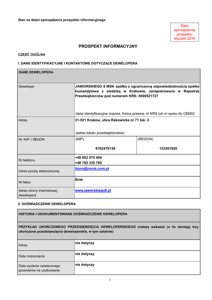Stan na dzień sporządzenia prospektu informacyjnego Data sporządzenia prospektu styczeń 2016 PROSPEKT INFORMACYJNY CZĘŚĆ OGÓLNA I. DANE IDENTYFIKACYJNE I KONTAKTOWE DOTYCZĄCE DEWELOPERA DANE DEWELOPERA Deweloper JAWORSKIEGO 8 MSK spółka z ograniczoną odpowiedzialnością spółka komandytowa z siedzibą w Krakowie, zarejestrowana w Rejestrze Przedsiębiorców pod numerem KRS: 0000521727 dane identyfikacyjne (nazwa, forma prawna, nr KRS lub nr wpisu do CEiDG) Adres 31-521 Kraków, ulica Rakowicka nr 71 lok. 2 (adres lokalu przedsiębiorstwa) Nr NIP i REGON (NIP) (REGON) 6762479139 Nr telefonu Adres poczty elektronicznej Nr faksu Adres strony internetowej dewelopera 123201826 +48 602 575 404 +48 785 335 785 [email protected] Brak www.jaworskiego8.pl II. DOŚWIADCZENIE DEWELOPERA HISTORIA I UDOKUMENTOWANE DOŚWIADCZENIE DEWELOPERA PRZYKŁAD UKOŃCZONEGO PRZEDSIĘWZIĘCIA DEWELOPERSKIEGO (należy wskazać (o ile istnieją) trzy ukończone przedsięwzięcia deweloperskie, w tym ostatnie) Adres nie dotyczy Data rozpoczęcia nie dotyczy Data wydania ostatecznego pozwolenia na użytkowanie nie dotyczy 1 PRZYKŁAD INNEGO UKOŃCZONEGO PRZEDSIĘWZIĘCIA DEWELOPERSKIEGO Adres nie dotyczy Data rozpoczęcia nie dotyczy Data wydania ostatecznego pozwolenia na użytkowanie nie dotyczy OSTATNIE UKOŃCZONE PRZEDSIĘWZIĘCIE DEWELOPERSKIE Adres nie dotyczy Data rozpoczęcia nie dotyczy Data wydania ostatecznego pozwolenia na użytkowanie nie dotyczy Czy przeciwko deweloperowi prowadzono (lub prowadzi się) postępowania egzekucyjne na kwotę powyżej 100 000 zł Nie III. INFORMACJE DOTYCZĄCE NIERUCHOMOŚCI I PRZEDSIĘWZIĘCIA DEWELOPERSKIEGO INFORMACJE DOTYCZĄCE GRUNTU Adres i nr działki ewidencyjnej 1 Kraków, jednostka ewidencyjna Śródmieście, obręb nr 6: działka nr 179/1 2 o powierzchni 436 m , zabudowana budynkiem nr 8, położonym przy ulicy Jaworskiego w Krakowie oraz działka nr 180/1 o powierzchni 2 428 m , zabudowana budynkiem nr 6, położonym przy ulicy Jaworskiego w Krakowie (budynki przeznaczone do rozbiórki) Nr księgi wieczystej kw nr KR1P/00222482/9 prowadzona dla działki nr 179/1 oraz kw nr KR1P/00175750/4 prowadzona dla działki nr 180/1 (docelowo jedna kw nr KR1P/00222482/9) Istniejące obciążenia hipoteczne DZ.KW./KR1P/ … - wniosek o wpisanie na rzecz Powszechnej Kasy nieruchomości lub wnioski o wpis Oszczędności Banku Polskiego Spółki Akcyjnej z siedzibą w Warszawie w dziale czwartym księgi wieczystej hipoteki umownej do kwoty 5.968.080,00 zł, zabezpieczającej wierzytelności wynikające z zawartej w dniu 29 grudnia 2015 roku Umowy kredytu inwestorskiego NOWY DOM sprzedaż nr 35 1020 2892 0000 5196 0149 0424 W przypadku braku księgi wieczy- Nieruchomość ma założoną księgę wieczystą stej informacja o powierzchni działki i stanie prawnym nieruchomości 2 1 2 Jeżeli działka nie posiada adresu, należy opisowo określić jej położenie. W szczególności imię i nazwisko albo nazwa (firma) właściciela lub użytkownika wieczystego oraz istniejące obciążenia na nieruchomości. 2 Plan zagospodarowania przestrze- przeznaczenie w planie nnego dla sąsiadujących działek 3 tereny zabudowy MN(N).4 (teren zabudowy mieszkaniowej) dopuszczalna wysokość zabudowy 12 m dopuszczalny procent zabudowy 50% działki Informacje zawarte w publicznie Brak dostępnych dokumentach dotyczących przewidzianych inwestycji w promieniu 1 km od przedmiotowej nieruchomości, w szczególności o budowie lub rozbudowie dróg, budowie linii szynowych oraz przewidzianych korytarzach powietrznych, a także znanych innych inwestycjach komunalnych, w szczególności oczyszczalniach ścieków, spalarniach śmieci, wysypiskach, cmentarzach INFORMACJE DOTYCZĄCE BUDYNKU Czy jest pozwolenie na budowę tak* nie* Czy pozwolenie na budowę jest ostateczne tak* nie* Czy pozwolenie na budowę jest zaskarżone tak* nie* Nr pozwolenia na budowę oraz nazwa organu, który je wydał Wydane przez Prezydenta Miasta Krakowa: decyzja Nr 1413/2015 z dnia 12 czerwca 2015 roku, znak: AU-01-3.6740.1.1551.2014.EKO (udzielająca pozwolenia na rozbiórkę, zatwierdzająca projekt budowlany i udzielająca pozwolenia na budowę) oraz decyzja Nr 316/5/2015 z dnia 23 września 2015 roku, znak: AU-01-3.6740.5.348.2015.EKO (przenosząca na Dewelopera powyższą decyzję Nr 1413/2015) Planowany termin rozpoczęcia rozpoczęcie prac budowlanych nastąpi do końca czwartego kwartału i zakończenia prac budowlanych 2015 roku a ich zakończenie do końca czwartego kwartału 2016 roku Termin, do którego nastąpi przenie- 30 czerwca 2017 roku sienie prawa własności nieruchomości Opis przedsięwzięcia skiego jeden budynek mieszkalny sześciokondygnacyjny obejmujący cztery kondygnacje naziemne z dwudziestoma lokalami mieszkalnymi oraz dwie kondygnacje podziemne z parkingiem na 30 miejsc postojowych oraz z komórkami lokatorskimi, przy czym: deweloper- liczba budynków 3 W przypadku braku planu zagospodarowania przestrzennego umieszcza się jedynie informację „Brak planu”. * Niepotrzebne skreślić (kliknąć dwukrotnie na tekst). 3 - wskazane przez Dewelopera komórki lokatorskie przeznaczone zostaną do wyłącznego korzystania przez właścicieli wskazanych lokali znajdujących się w budynku (na zasadzie podziału nieruchomości wspólnej do korzystania) lub też stanowić będą przynależności do wskazanych lokali albo odrębne nieruchomości lokalowe, - parking podziemny może zostać wyodrębniony jako samodzielny lokal o przeznaczeniu innym niż mieszkalne i wtedy Deweloper nabywcom wskazanych przez niego miejsc parkingowych i komórek lokatorskich zbywać będzie udziały we współwłasności tego lokalu (odpowiadające ułamkowi, którego licznik będzie liczą 1 a mianownik będzie liczbą stanowiącą sumę miejsc parkingowych i komórek lokatorskich znajdujących się w garażu) wraz z prawem do wyłącznego korzystania ze wskazanego przez Dewelopera miejsca parkingowego lub komórk