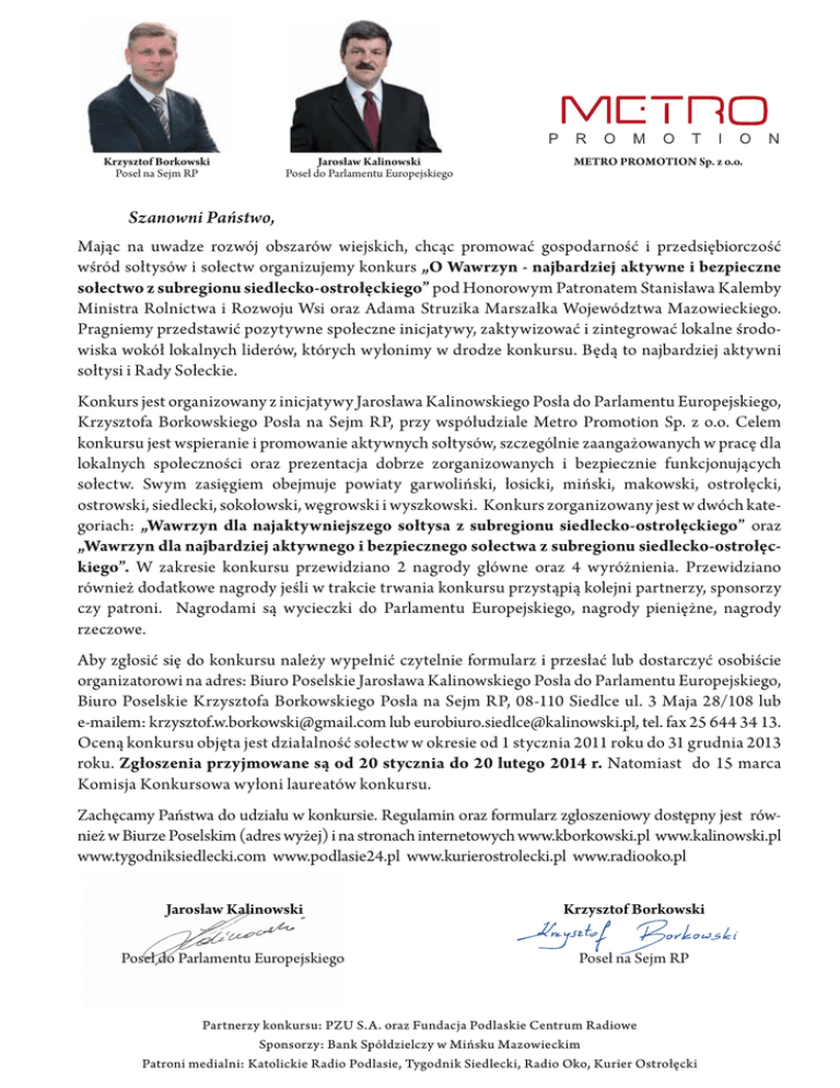 Krzysztof Borkowski Poseł na Sejm RP Jarosław Kalinowski Poseł do Parlamentu Europejskiego METRO PROMOTION Sp. z o.o. Szanowni Państwo, Mając na uwadze rozwój obszarów wiejskich, chcąc promować gospodarność i przedsiębiorczość wśród sołtysów i sołectw organizujemy konkurs „O Wawrzyn - najbardziej aktywne i bezpieczne sołectwo z subregionu siedlecko-ostrołęckiego” pod Honorowym Patronatem Stanisława Kalemby Ministra Rolnictwa i Rozwoju Wsi oraz Adama Struzika Marszałka Województwa Mazowieckiego. Pragniemy przedstawić pozytywne społeczne inicjatywy, zaktywizować i zintegrować lokalne środowiska wokół lokalnych liderów, których wyłonimy w drodze konkursu. Będą to najbardziej aktywni sołtysi i Rady Sołeckie. Konkurs jest organizowany z inicjatywy Jarosława Kalinowskiego Posła do Parlamentu Europejskiego, Krzysztofa Borkowskiego Posła na Sejm RP, przy współudziale Metro Promotion Sp. z o.o. Celem konkursu jest wspieranie i promowanie aktywnych sołtysów, szczególnie zaangażowanych w pracę dla lokalnych społeczności oraz prezentacja dobrze zorganizowanych i bezpiecznie funkcjonujących sołectw. Swym zasięgiem obejmuje powiaty garwoliński, łosicki, miński, makowski, ostrołęcki, ostrowski, siedlecki, sokołowski, węgrowski i wyszkowski. Konkurs zorganizowany jest w dwóch kategoriach: „Wawrzyn dla najaktywniejszego sołtysa z subregionu siedlecko-ostrołęckiego” oraz „Wawrzyn dla najbardziej aktywnego i bezpiecznego sołectwa z subregionu siedlecko-ostrołęckiego”. W zakresie konkursu przewidziano 2 nagrody główne oraz 4 wyróżnienia. Przewidziano również dodatkowe nagrody jeśli w trakcie trwania konkursu przystąpią kolejni partnerzy, sponsorzy czy patroni. Nagrodami są wycieczki do Parlamentu Europejskiego, nagrody pieniężne, nagrody rzeczowe. Aby zgłosić się do konkursu należy wypełnić czytelnie formularz i przesłać lub dostarczyć osobiście organizatorowi na adres: Biuro Poselskie Jarosława Kalinowskiego Posła do Parlamentu Europejskiego, Biuro Poselskie Krzysztofa Borkowskiego Posła na Sejm RP, 08-110 Siedlce ul. 3 Maja 28/108 lub e-mailem: [email protected] lub [email protected], tel. fax 25 644 34 13. Oceną konkursu objęta jest działalność sołectw w okresie od 1 stycznia 2011 roku do 31 grudnia 2013 roku. Zgłoszenia przyjmowane są od 20 stycznia do 20 lutego 2014 r. Natomiast do 15 marca Komisja Konkursowa wyłoni laureatów konkursu. Zachęcamy Państwa do udziału w konkursie. Regulamin oraz formularz zgłoszeniowy dostępny jest również w Biurze Poselskim (adres wyżej) i na stronach internetowych www.kborkowski.pl www.kalinowski.pl www.tygodniksiedlecki.com www.podlasie24.pl www.kurierostrolecki.pl www.radiooko.pl Jarosław Kalinowski Krzysztof Borkowski Poseł do Parlamentu Europejskiego Poseł na Sejm RP Partnerzy konkursu: PZU S.A. oraz Fundacja Podlaskie Centrum Radiowe Sponsorzy: Bank Spółdzielczy w Mińsku Mazowieckim Patroni medialni: Katolickie Radio Podlasie, Tygodnik Siedlecki, Radio Oko, Kurier Ostrołęcki