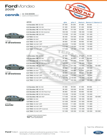 FordMondeo 70 00 2009 cennik wersja 4-drzwiowa 5-drzwiowa wersja kombi A wa˝ny od 3 lipca 2009 r. silniki wersja T nr 04/2009 NI PL EJ N ghia ghia X titanium titanium X titanium S 1.6 Duratec HE 125 KM 87 000 95 200 87 000 95 200 – 2.0 Duratec HE 145 KM 91 400 99 600 91 400 99 600 – 2.0 Duratec HE 145 KM Flexi-Fuel 92 800 101 000 92 800 101 000 – 2.3 Duratec HE 161 KM Automat 106 400 114 600 106 400 114 600 – 2.5 Duratec HE 220 KM* 113 000 121 200 113 000 121 200 – 1.8 TDCi 125 KM 96 400 104 600 96 400 104 600 – 1.8 TDCi 125 KM* 97 600 105 800 97 600 105 800 – 2.0 TDCi 115 KM* DPF 99 600 107 800 99 600 107 800 – 2.0 TDCi 140 KM* DPF 104 600 112 800 104 600 112 800 – 2.0 TDCi 140 KM DPF Automat 110 400 118 600 110 400 118 600 – 2.2 TDCi 175 KM* DPF 117 000 125 200 117 000 125 200 – 1.6 Duratec HE 125 KM 87 000 95 200 87 000 95 200 – 2.0 Duratec HE 145 KM 91 400 99 600 91 400 99 600 – 2.0 Duratec HE 145 KM Flexi-Fuel 92 800 101 000 92 800 101 000 – 2.3 Duratec HE 161 KM Automat 106 400 114 600 106 400 114 600 – 2.5 Duratec HE 220 KM* 113 000 121 200 113 000 121 200 125 000 1.8 TDCi 125 KM 96 400 104 600 96 400 104 600 – 1.8 TDCi 125 KM* 97 600 105 800 97 600 105 800 – 2.0 TDCi 115 KM* DPF 99 600 107 800 99 600 107 800 – 2.0 TDCi 140 KM* DPF 104 600 112 800 104 600 112 800 – 2.0 TDCi 140 KM DPF Automat 110 400 118 600 110 400 118 600 – 2.2 TDCi 175 KM* DPF 117 000 125 200 117 000 125 200 129 000 1.6 Duratec HE 125 KM 91 000 99 200 91 000 99 200 – 2.0 Duratec HE 145 KM 95 400 103 600 95 400 103 600 – 2.0 Duratec HE 145 KM Flexi-Fuel 96 800 105 000 96 800 105 000 – 2.3 Duratec HE 161 KM Automat 110 400 118 600 110 400 118 600 – 2.5 Duratec HE 220 KM* 117 000 125 200 117 000 125 200 129 000 1.8 TDCi 125 KM 100 400 108 600 100 400 108 600 – 1.8 TDCi 125 KM* 101 600 109 800 101 600 109 800 – 2.0 TDCi 115 KM* DPF 103 600 111 800 103 600 111 800 – 2.0 TDCi 140 KM* DPF 108 600 116 800 108 600 116 800 – 2.0 TDCi 140 KM DPF Automat 114 400 122 600 114 400 122 600 – 2.2 TDCi 175 KM* DPF 121 000 129 200 121 000 129 200 133 000 * 6-cio stopniowa skrzynia biegów Duratec - silnik benzynowy TDCi - silnik wysokopr´˝ny FordProtect – opcjonalny program przed∏u˝enia gwarancji 3 lata – 1 700 z∏ z VAT Szczegó∏y u Autoryzowanych Dealerów Forda FordMondeo wyposa˝enie 2009 bezpieczeƒstwo Uk∏ad ABS z elektronicznym uk∏adem podzia∏u si∏y hamowania (EBD) IVD (ESP + TCS) – elektroniczny uk∏ad stabilizacji toru jazdy (ESP) z uk∏adem kontroli trakcji (TCS) oraz uk∏adem wspomagania awaryjnego hamowania (EBA) Uk∏ad IVDC (ESP + TCS+EBA+CDC+HLA) i sportowe zawieszenie (niedost´pne z samopoziomujàcym zawieszeniem i silnikiem benzynowym Duratec 1.6) Âwiat∏a awaryjnego hamowania Bezw∏adnoÊciowy wy∏àcznik odcinajàcy dop∏yw paliwa (tylko wersje z silnikiem benzynowym) System tankowania bez tradycyjnego korka paliwa; z zabezpieczeniem przed zatankowaniem z niew∏aÊciwego dystrybutora Hydrauliczny uk∏ad wspomagania kierownicy (HPAS) Inteligentny System Bezpieczeƒstwa (IPS) Poduszki powietrzne – poduszki czo∏owe kierowcy i pasa˝era z przoduu Poduszki powietrzne – poduszki boczne dla kierowcy i pasa˝era z przodu Poduszki powietrzne – boczne kurtyny powietrzne chroniàce osoby na przednich i tylnych fotelach, umieszczone w podsufitce Poduszki powietrzne – poduszka chroniàca kolana kierowcy Bezpieczna (cofajàca si´) kolumna kierownicys Reflektory halogenowe ze szk∏ami z poliw´glanu o zwi´kszonej wytrzyma∏oÊci na drobne uderzenia i zarysowania, boczne Êwiat∏a pozycyjne, tylne Êwiat∏a przeciwmgielne, Êwiat∏a biegu wstecznego oraz dodatkowe Êwiat∏o STOP z ty∏u Przednie Êwiat∏a przeciwmgielne System halogenowych reflektorów adaptacyjnych ze statycznymi Êwiat∏ami doÊwietlajàcymi zakr´ty Spryskiwacze reflektorów Wy∏àcznik reflektorów z opóêniaczem System statycznych ksenonowych reflektorów adaptacyjnych ze spryskiwaczami i automatycznà regulacjà kàta ustawienia Zaawansowany uk∏ad ESP (zawiera uk∏ad u∏atwiajàcy ruszanie z miejsca na wzniesieniach HLA) Uk∏ad monitorowania ciÊnienia w ogumieniu Fotele – mocowana fotelików dzieci´cych typu ISOFIX (tylko skrajne tylne fotele) komfort Kolumna kierownicy z regulacjà odleg∏oÊci i pochylenia Klimatyzacja – dwustrefowa, z automatycznà regulacjà temperatury (DEATC), bezfreonowy czynnik ch∏odniczy Lusterko wsteczne samoczynnie Êciemniajace si´ (zawiera przednie lampy przeciwmgielne) Elektrycznie sterowane szyby przednich drzwi – opuszczane jednym naciÊni´ciem przycisku, z czujnikiem przeszkody przy zamykaniu, z funkcjà ca∏kowitego otwierania/zamykania wszystkich szyb Fotel pasa˝era z przodu – regulacja podparcia odcinka l´dêwiowego Fotel pasa˝era z przodu – r´czna regulacja wysokoÊci Fotel pasa˝era z przodu – pe∏na elektryczna regulacja po∏o˝enia Przednie fotele – o profilu sportowym Przednie fotele – wentylowane i podgrzewane Fotel kierowcy – pe∏na elektryczna regulacja po∏o˝enia z funkcjà pami´ci po∏o˝enia i elektrycznie sk∏adanymi lusterkami z pami´cià ustawienia Podgrzewana tylna kanapa Tapicerka foteli – Alcantara (tylko z przednimi zag∏ówkami z regulacjà w 4 kierunkach) Tapicerka foteli skórzana Tapicerka cz´Êciowo wykoƒczona skórà Interfejs kierowcy – zestaw prze∏àczników na kierownicy Standardowy wyÊwietlacz interfejsu kierowcy Rozbudowany wyÊwietlacz interfejsu kierowcy FordConvers+ z kolorowym wyÊwietlaczem Komputer pok∏adowy – z wyÊwietlaczem temperatury zewn´trznej Przycisk rozrusznika FordPower Tempomat Inteligentny tempomat Inteligentny tempomat z uk∏adem IVDC Kierownica pokryta skórà Kierownica drewniana cz´Êciowo pokryta skórà Kierownica – z ramionami wykoƒczonymi metalem, z przyciskiem sygna∏u dêwi´kowego Lusterka boczne – sterowane i podgrzewane elektrycznie, obudowy w kolorze czarnym, zwieƒczone pokryci
