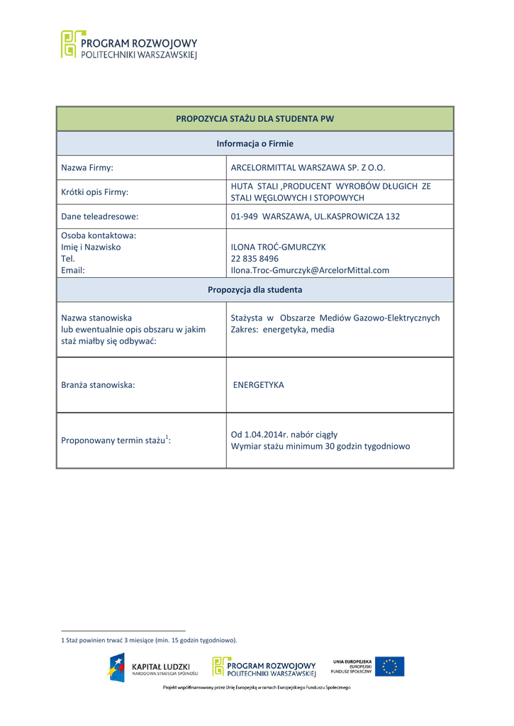 PROPOZYCJA STAŻU DLA STUDENTA PW Informacja o Firmie Nazwa Firmy: ARCELORMITTAL WARSZAWA SP. Z O.O. Krótki opis Firmy: HUTA STALI ,PRODUCENT WYROBÓW DŁUGICH ZE STALI WĘGLOWYCH I STOPOWYCH Dane teleadresowe: 01-949 WARSZAWA, UL.KASPROWICZA 132 Osoba kontaktowa: Imię i Nazwisko Tel. Email: ILONA TROĆ-GMURCZYK 22 835 8496 [email protected] Propozycja dla studenta Nazwa stanowiska lub ewentualnie opis obszaru w jakim staż miałby się odbywać: Stażysta w Obszarze Mediów Gazowo-Elektrycznych Zakres: energetyka, media Branża stanowiska: ENERGETYKA Proponowany termin stażu1: Od 1.04.2014r. nabór ciągły Wymiar stażu minimum 30 godzin tygodniowo 1 Staż powinien trwać 3 miesiące (min. 15 godzin tygodniowo).