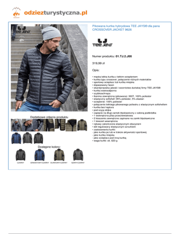 Pikowana kurtka hybrydowa TEE JAYS® dla pana CROSSOVER JACKET 9626 Numer produktu: 01.TJ.2.J66 319,99 zł Opis: • męska lekka kurtka z lekkim ociepleniem • kurtka typu crossover, połączenie różnych materiałów • sportowy ocieplacz lub kurtka miejska • dopasowany fason • skandynawska jakość i wzornictwo duńskiej firmy TEE JAYS® • kurtka wiatroodporna • szybkoschnąca • tkanina zewnętrzna (pikowana): 300T, 100% poliester • elastyczny softshell: 95% poliester, 5% elastan • ocieplenie: 100% poliester • połączenie lekkiego pikowanego poliestru z elastycznym softshellem • kurtka bez kaptura • pod szyją stójka • zapięcie na długi zamek błyskawiczny z osłoną podbródka • 1 wewnętrzna plisa przeciwwiatrowa • 2 kieszenie zewnętrzne zapinane na zamki błyskawiczne • 1 kieszeń wewnętrzna • rękawy zakończone elastycznym obszyciem • dół regulowany elastycznym sznurkiem • zastosowania kurtki: - jako kurtka po lub w trakcie aktywności sportowej - jako kurtka miejska - jako ocieplacz pod inną kurtką • waga kurtki: ok. 620 g Dodatkowe zdjęcia produktu Dostępne kolory: CZARNY Powered by TCPDF (www.tcpdf.org) GRANATOWY/CZARNY OLIWKOWY/CZARNY SZARY/CZARNY