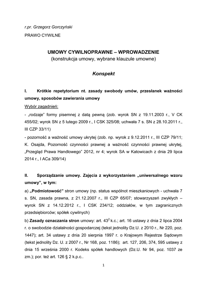 r.pr. Grzegorz Gorczyński PRAWO CYWILNE UMOWY CYWILNOPRAWNE – WPROWADZENIE (konstrukcja umowy, wybrane klauzule umowne) Konspekt I. Krótkie repetytorium nt. zasady swobody umów, przesłanek ważności umowy, sposobów zawierania umowy Wybór zagadnień: - „rodzaje” formy pisemnej z datą pewną (zob. wyrok SN z 19.11.2003 r., V CK 455/02; wyrok SN z 5 lutego 2009 r., I CSK 325/08; uchwała 7 s. SN z 28.10.2011 r., III CZP 33/11) - pozorność a ważność umowy ukrytej (zob. np. wyrok z 9.12.2011 r., III CZP 79/11; K. Osajda, Pozorność czynności prawnej a ważność czynności prawnej ukrytej, „Przegląd Prawa Handlowego” 2012, nr 4; wyrok SA w Katowicach z dnia 29 lipca 2014 r., I ACa 309/14) II. Sporządzanie umowy. Zajęcia z wykorzystaniem „uniwersalnego wzoru umowy”, w tym: a) „Podmiotowość” stron umowy (np. status wspólnot mieszkaniowych - uchwała 7 s. SN, zasada prawna, z 21.12.2007 r., III CZP 65/07; stowarzyszeń zwykłych – wyrok SN z 14.12.2012 r., I CSK 234/12; oddziałów, w tym zagranicznych przedsiębiorców; spółek cywilnych) b) Zasady oznaczania stron umowy: art. 432 k.c.; art. 16 ustawy z dnia 2 lipca 2004 r. o swobodzie działalności gospodarczej (tekst jednolity Dz.U. z 2010 r., Nr 220, poz. 1447); art. 34 ustawy z dnia 20 sierpnia 1997 r. o Krajowym Rejestrze Sądowym (tekst jednolity Dz. U. z 2007 r., Nr 168, poz. 1186); art. 127, 206, 374, 595 ustawy z dnia 15 września 2000 r. Kodeks spółek handlowych (Dz.U. Nr 94, poz. 1037 ze zm.); por. też art. 126 § 2 k.p.c.. 1 c) Reprezentacja stron umowy, tj. zasady reprezentacji oraz obowiązek uzyskania zgody innego organu: - spółki, - spółdzielnie - zob. uchwała 7 s. SN z 14.09.2007 r., III CZP 31/07, - kościelne osoby prawne: zob. wyrok SN z 27.07.2000 r., IV CKN 88/00 oraz wyrok SN z 12.01.2011 r., I CSK 182/10, - samorządowe osoby prawne – zob. wyrok SN z 6.12.2012 r., III CZP 76/12 d) konieczność badania zdolności do czynności prawnych oraz „statusu małżeńskiego” osób fizycznych (problem „zarządzania” majątkiem wspólnym – art. 36 i nast. k.r.o. oraz kwestia odpowiedzialności majątkiem wspólnym – art. 41 k.r.o.) e) Pełnomocnictwo i prokura - konieczność badania każdorazowo zakresu umocowania pełnomocnika; wąski zakres pełnomocnictwa ogólnego (art. 98 zd. 1 k.c.); - szeroki zakres prokury (art. 1091 k.c.); - znaczenie dokumentu pełnomocnictwa (ochrona dobrej wiary; art. 105 k.c.) f) szczególny status określonych osób prawnych (ewentualna konieczność stosowania prawa zamówień publicznych; art. 5a-5c, 17,17a,18 ustawy z dnia 8 sierpnia 1996 r. o zasadach wykonywania uprawnień przysługujących Skarbowi Państwa (tekst jedn. Dz.U. z 2012 r. poz. 1224); art. 19 b ustawy o komercjalizacji i prywatyzacji przedsiębiorstw państwowych (tekst jedn. Dz.U. z 2013 r. poz. 216) g) badanie czy nie przysługuje status konsumenta (art. 221 k.c.) czy przedsiębiorcy (art. 431 k.c.) – zob. np. G. Gorczyński, Przedsiębiorcą się jest czy bywa? Uwagi o pojęciu przedsiębiorcy [w:] W.J. Katner, U. Promińska (red.), Prawo handlowe po przystąpieniu Polski do Unii Europejskiej, Wolters Kluwer, Warszawa 2010. III. Redagowanie wybranych klauzul umownych: Źródła prawa: kodeks cywilny. Wybór literatury: komentarze do kodeksu cywilnego; 2 P. Drapała, A. Olejniczak, Rozdział X. Dodatkowe zastrzeżenia umowne [w:] E. Łętowska (red.), System prawa prywatnego, tom 5, Zobowiązania. Część ogólna, C.H. Beck, Warszawa 2013 a) kara umowna wybór orzecznictwa: uchwała 7 s. SN z 6.11.2003 r., III CZP 61/03 wyrok SN z 21.09.2007, V CSK 139/07 wyrok SN z 15.11.2012 r. V CSK 512/11 wyrok SN z 18.07.2012 r., III CZP 39/12 wyrok SA w Gdańsku z 14.05.2013 r., I ACa 174/13 wyrok SN z dnia 29.11.2013 r. I CSK 124/13 wyrok SN dnia 29.11.2013 r., I CSK 124/13 b) zadatek wybór orzecznictwa: wyrok SN z 9.12.2011 r., III CSK 115/11 wyrok SN z 8.02.2008 r., I CSK 328/07 wyrok SN z 15.06.2011 r., V CSK 357/10 wyrok SN z 14.12.2011 r., I CSK 149/11 uchwała SN z 25.06.2009 r., III CZP 39/09 c) klauzule modyfikujące lub wyłączające odpowiedzialność (art. 473 k.c.; art. 558 k.c.), modyfikacja przesłanek wykonania zastępczego (por. art. 479-480 k.c.) d) umowne prawo odstąpienia, odstępne IV. Wybrane klauzule zapożyczone z obcych systemów prawnych: a) representations and warranties (zob. A. Szlęzak, Representations and warranties w umowach poddanych polskiemu prawu, „Przegląd Prawa Handlowego” 2007, nr 10; A. Szlęzak, H. Gardocka, Standardy odpowiedzialności kontraktowej w polskich umowach opartych na wzorcach anglo-amerykańskich, „Przegląd Prawa Handlowego” 2011, nr 12) b) klauzula integracyjna (merger clause) (zob. M. Pecyna, Merger clause jako 3 zastrzeżenie wyłączności dokumentu, klauzula integralności umowy, reguła wykładni umowy, Wolters Kluwer, Warszawa 2013; M. Romanowski, Skutki zastrzeżenia w umowie merger clause, „Przegląd Prawa Handlowego” 2011, nr 12; A. Szlęzak, Polemicznie o skutkach zastrzegania tzw. merger clause, „Przegląd Prawa Handlowego” 2013, nr 2) c) klauzula salwatoryjna (zob. M. Pokrzywniak, Klauzula salwatoryjna, „Monitor Prawniczy” 2004 nr 22; R. Trzaskowski, Znaczenie klauzul renegocjacyjnych w kontekście art. 58 § 3 k.c., Palestra 2008, nr 12; wyrok Sądu Najwyższego z 26.01.2006 r., V CSK 81/05 wraz z krytyczną glosą A. Szlęzaka, Orzecznictwo Sądów Polskich 2007, Nr 2, poz. 17, str. 106) d) klauzule siły wyższej, klauzule renegocjacyjne (zob. G. Gorczyński, 9.4. Force majeure i hardship [w:] W. Popiołek (red.) System prawa handlowego, tom 9, Międzynarodowe prawo handlowe, C.H. Beck, Warszawa 2013; J. Pokrzywniak, Klauzula siły wyższej, „Monitor Prawniczy” 2005, nr 6; R. Strugała, Znaczenie prawne klauzul renegocjacyjnych, Monitor Prawniczy 2012, nr 22; wyrok SN z 11.01.2001 r., IV CKN 150/00). Wybór literatury: Negocjacje w Transferze Technologii. Podręcznik szkolenio