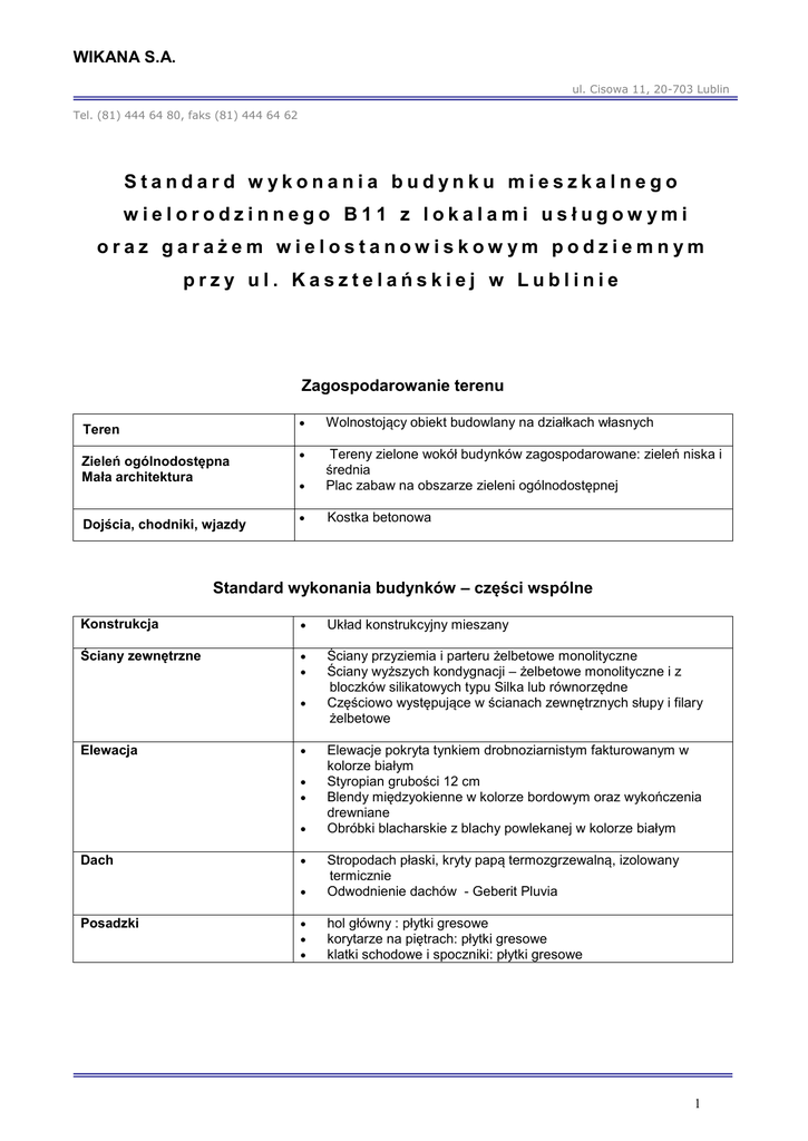 WIKANA S.A. ul. Cisowa 11, 20-703 Lublin Tel. (81) 444 64 80, faks (81) 444 64 62 Standard w ykonania budynku mieszkalnego wielorodzinnego B11 z lokalami usługow ymi oraz garażem wielostanowiskow ym podziemnym przy ul. Kasztelańskiej w Lublinie Zagospodarowanie terenu Teren Zieleń ogólnodostępna Mała architektura Dojścia, chodniki, wjazdy Wolnostojący obiekt budowlany na działkach własnych Tereny zielone wokół budynków zagospodarowane: zieleń niska i średnia Plac zabaw na obszarze zieleni ogólnodostępnej Kostka betonowa Standard wykonania budynków – części wspólne Konstrukcja Układ konstrukcyjny mieszany Ściany zewnętrzne Ściany przyziemia i parteru żelbetowe monolityczne Ściany wyższych kondygnacji – żelbetowe monolityczne i z bloczków silikatowych typu Silka lub równorzędne Częściowo występujące w ścianach zewnętrznych słupy i filary żelbetowe Elewacja Dach Posadzki Elewacje pokryta tynkiem drobnoziarnistym fakturowanym w kolorze białym Styropian grubości 12 cm Blendy międzyokienne w kolorze bordowym oraz wykończenia drewniane Obróbki blacharskie z blachy powlekanej w kolorze białym Stropodach płaski, kryty papą termozgrzewalną, izolowany termicznie Odwodnienie dachów - Geberit Pluvia hol główny : płytki gresowe korytarze na piętrach: płytki gresowe klatki schodowe i spoczniki: płytki gresowe 1 WIKANA S.A. ul. Cisowa 11, 20-703 Lublin Tel. (81) 444 64 80, faks (81) 444 64 62 Okna, drzwi, bramy Hole wejściowe i przedsionki Korytarze piętrowe Klatki schodowe Instalacje Drzwi wejściowe do budynku – stolarka aluminiowa Drzwi przeciwpożarowe klatek schodowych - stalowe lub aluminiowe minimalnie przeszklone z samozamykaczami Fragmenty ścian holi wejściowych – tynk cienkowarstwowy Pozostałe ściany: tynk gipsowy malowany farbami Skrzynki na listy ze stali malowanej proszkowo Wykończenie ścian - tynk gipsowy malowany farbami Balustrady wewnętrzne - o konstrukcji stalowej lub stalowej malowanej proszkowo Kotłownia gazowa, wspomagana instalacją z solarami na dachu Wentylacja mechaniczna – garaż Wentylacja hybrydowa -- mieszkania Centralnego ogrzewania, ciepłej wody użytkowej oraz wodnokanalizacyjne z tworzyw sztucznych Opomiarowanie zużycia energii elektrycznej i gazu w szafkach zabudowanych w strefie komunikacji ogólnej Elektryczna – podtynkowa Videoomofonowa w mieszkaniach windy osobowe dostępne z poziomu garaży – po jednej w każdej klatce schodowej – wykończenie stal nierdzewna, cichobieżne budynek przystosowany dla osób niepełnosprawnych na każdym poziomie wraz z garażami, wejście na parter z poziomu terenu, na wszystkie kondygnacje i garaż wielostanowiskowy za pomocą dźwigu osobowego numeracja budynku Windy Inne Standard mieszkań o podwyższonej odporności na włamanie w okleinie drewnopodobnej typu VITEX , GERDA , BEM lub równorzędne ściany konstrukcyjne - żelbetowe, słupy żelbetowe oraz z bloczków wapienno-piaskowych typu Silka lub równorzędne słupy, filary - żelbetowe bloczki z betonu komórkowego gr. 8 cm jako ścianki działowe pomiędzy pokojami oraz z cegły kratówki – gr. 8cm jako ścianki działowe pomieszczeń mokrych Drzwi wejściowe do lokali Ściany wydzieleń międzylokalowych i korytarzowych Ściany wewnętrzne działowe 2 WIKANA S.A. ul. Cisowa 11, 20-703 Lublin Tel. (81) 444 64 80, faks (81) 444 64 62 Tynki ścian i sufitów Podłoże pod posadzki Okna i drzwi balkonowe tynki gipsowe maszynowe, wykończone z dokładnością 0,8 cm wylewka cementowa stolarka okienna PCV, w kolorze białym profil pięciokomorowy szklony zestawem dwuszybowym nawiewniki w górnej części ram okiennych dla zapewnienia wymaganej infiltracji powietrza typu AERECO ,VENTAIR lub równorzędne konglomerat marmurowy dopasowany do kolorystyki okien w kolorze beżowym np. BOTICCINO otwory przygotowane do montażu ościeżnic i drzwi, nie tynkowane wentylacja higrosterowana mechaniczna firmy Aereco centralnego ogrzewania – instalacja gazowa, grzejniki z zaworami termostatycznymi, ciepłomierz ultradźwiękowy zlokalizowany w szachtach na klatkach schodowych w łazienkach grzejnik rurowy drabinkowy – podejście ze ściany, wody zimnej – rozprowadzane do miejsca usytuowania przyboru w szlichcie w „Peszlu”, wodomierze w szachtach korytarzowych ciepłej wody użytkowej - prowadzone w szlichcie, podejścia do armatury łazienkowej w bruzdach ściennych, kanalizacji –częściowo podejścia w podbudowach posadzek i ścianach elektryczna – podtynkowa, z zabezpieczeniem antyporażeniowym, tablica mieszkaniowa (TM) wbudowana na ścianie przy drzwiach wejściowych; wraz osprzętem; inne słaboprądowe: RTV – okablowanie, gniazdo w pokoju dziennym; telefon/internet - gniazdo w przedpokoju, domofon, dzwonek; posadzki: gres mrozoodporny, antypoślizgowy balustrady zewnętrzne stalowe z wypełnieniem szklanym; ścianki działowe na balkonach z płyt typu Fermacell lub równorzędne na konstrukcji stalowej; Parapety Drzwi wewnętrzne Instalacje Balkony i loggie Standard garażu wielostanowiskowego i komórek lokatorskich Ściany zewnętrzne Konstrukcyjne i słupy żelbetowe monolityczne – beton w naturalnej strukturze; garaże wielostanowiskowe – posadzka betonowa powierzchniowo malowana żywicą, z wyznaczonymi i oznakowanymi (numeracja) miejscami parkingowymi, korytka odwodnień liniowych wzdłuż traktów komunikacyjnych drzwi stalowe zgodne z wymaganiami pożarowymi – do przedsionków p.poż, przedsionków windowych i pomieszczeń technicznych brama garażowa wjazdowa – rolowana, segmentowa, nieocieplana, sterowana za pomocą pilota lub klucza Posadzki Drzwi Bramy 3 WIKANA S.A. ul. Cisowa 11, 20-703 Lublin Tel. (81) 444 64 80, faks (81) 444 64 62 Instalacje Komórki lokatorskie Inne Instalacja wentylacji mechanicznej garażu – nawiew grawitacyjny, wyciąg mechaniczny nad dach budynku instalacja hydrantowa instalacja elektryczna – oprawy komórki zlokalizowane na poziomie 