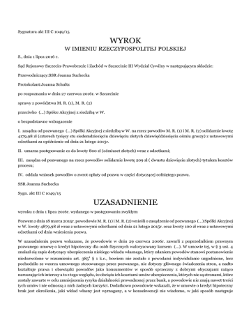 Sygnatura akt III C 1049/15 WYROK W IMIENIU RZECZYPOSPOLITEJ POLSKIEJ S., dnia 1 lipca 2016 r. Sąd Rejonowy Szczecin-Prawobrzeże i Zachód w Szczecinie III Wydział Cywilny w następującym składzie: Przewodniczący:SSR Joanna Suchecka Protokolant:Joanna Schultz po rozpoznaniu w dniu 27 czerwca 2016r. w Szczecinie sprawy z powództwa M. R. (1), M. R. (2) przeciwko (...) Spółce Akcyjnej z siedzibą w W. o bezpodstawne wzbogacenie I. zasądza od pozwanego (...) Spółki Akcyjnej z siedzibą w W. na rzecz powodów M. R. (1) i M. R. (2) solidarnie kwotę 4179,98 zł (czterech tysięcy stu siedemdziesięciu dziewięciu złotych dziewięćdziesięciu ośmiu groszy) z ustawowymi odsetkami za opóźnienie od dnia 21 lutego 2015r. II. umarza postępowanie co do kwoty 800 zł (ośmiuset złotych) wraz z odsetkami; III. zasądza od pozwanego na rzecz powodów solidarnie kwotę 209 zł ( dwustu dziewięciu złotych) tytułem kosztów procesu; IV. oddala wniosek powodów o zwrot opłaty od pozwu w części dotyczącej cofniętego pozwu. SSR Joanna Suchecka Sygn. akt III C 1049/15 UZASADNIENIE wyroku z dnia 1 lipca 2016r. wydanego w postępowaniu zwykłym Pozwem z dnia 18 marca 2015r. powodowie M. R. (1) i M. R. (2) wnieśli o zasądzenie od pozwanego (...) Spółki Akcyjnej w W. kwoty 4879,98 zł wraz z ustawowymi odsetkami od dnia 21 lutego 2015r. oraz kwoty 100 zł wraz z ustawowymi odsetkami od dnia wniesienia pozwu. W uzasadnieniu pozwu wskazano, że powodowie w dniu 29 czerwca 2006r. zawarli z poprzednikiem prawnym pozwanego umowę o kredyt hipoteczny dla osób fizycznych waloryzowany kursem (...). W umowie tej, w § 3 ust. 4 znalazł się zapis dotyczący ubezpieczenia niskiego wkładu własnego, który zdaniem powodów stanowi postanowienie niedozwolone w rozumieniu art. 3851 § 1 k.c., bowiem nie zostało z powodami indywidulanie uzgodnione, lecz pochodziło ze wzorca umownego stosowanego przez pozwanego, nie dotyczy głównego świadczenia stron, a nadto kształtuje prawa i obowiązki powodów jako konsumentów w sposób sprzeczny z dobrymi obyczajami rażąco naruszając ich interesy a to z tego względu, że obciąża ich kosztami umów ubezpieczenia, których nie są stronami, które zostały zawarte w celu zmniejszenia ryzyka działalności prowadzonej przez bank, a powodowie nie znają nawet treści tych umów i nie odnoszą z nich żadnych korzyści. Dodatkowo powodowie wskazali, że w umowie o kredyt hipoteczny brak jest określenia, jaki wkład własny jest wymagany, a w konsekwencji nie wiadomo, w jaki sposób następuje wyliczenie składki ubezpieczeniowej ubezpieczenia niskiego wkładu własnego. W ramach tego ubezpieczenia zostały pobrane od powodów następujące kwoty: w dniu 5 lipca 2006r. 2023 zł, w dniu 5 sierpnia 2009r. 1658,45 zł, w dniu 31 lipca 2012r. 498,53 zł. Do ich zwrotu powodowie wezwali pozwanego pismem z dnia 9 lutego 2015r., powodowie dochodzą zatem łącznie z tytułu nienależnie pobranych składek kwoty 4179,98 zł wraz z odsetkami od dnia następnego po dniu wyznaczonym w tym piśmie do zapłaty. Co do kwoty 700 zł wraz z odsetkami od dnia 21 lutego 2015r. powodowie wskazali, że dochodzą jej tytułem nienależnie pobranych kwot za okres do 22 sierpnia 2012r. wynikających z zastosowania przez pozwanego nienależnego oprocentowania, przewyższającego 2,35% oprocentowanie ustalone w umowie. W tym zakresie wskazali, że już dwa miesiące po zawarciu umowy bank podwyższył wynegocjowane przez nich oprocentowanie z 2,35 % do 2,85 %. Warunki zmiany wysokości oprocentowania zostały określone w § 10 ust. 2 umowy, który nie był objęty indywidualnym uzgodnieniem z powodami a jego treść pozwalała na podwyższanie oprocentowania przez bank w sposób swobodny, zaś powodom nie są znane procedury, w oparciu o które dochodziło do zmiany oprocentowania. Zdaniem powodów również to postanowienie umowy stanowi klauzulę abuzywną. O zapłatę kwoty 100 zł z odsetkami od wniesienia pozwu powodowie wnieśli tytułem nienależnie pobranych kwot za okres od 23 sierpnia 2012r. wynikających z zastosowania przez pozwanego nienależnego oprocentowania wskazując, że pozwany naruszył postanowienia aneksu z dnia 23 sierpnia 2012r. dokonując zmiany wysokości oprocentowania dopiero od 29 sierpnia 2012r., a nie z dniem podpisania aneksu, w wyniku czego wysokość raty wymagalnej na dzień 28 sierpnia 2012r. została ustalona w sposób nieprawidłowy. Nakazem zapłaty w postępowaniu upominawczym z dnia 27 kwietnia 2015r. orzeczono zgodnie z żądaniem pozwu. Pozwany złożył sprzeciw, w którym zaskarżył nakaz zapłaty w całości i wniósł o oddalenie powództwa i zasądzenie solidarnie od powodów kosztów procesu według norm przepisanych. Pozwany zanegował stanowisko powodów, iż postanowienie zawarte w § 3 ust. 4 umowy dotyczące ubezpieczenia niskiego wkładu własnego jest postanowieniem niedozwolonym. Zdaniem skarżącego w danym przypadku nie doszło do istotnej i rażącej dysproporcji praw i obowiązków na niekorzyść powodów jako konsumentów. Zgodnie z § 6 ust. 2 pkt 2 Regulaminu udzielania kredytów i pożyczek hipotecznych dla osób fizycznych wnioskodawca jest zobowiązany do pokrycia kosztów innych opłat związanych z ustanowieniem prawnego zabezpieczenia kredytu. Takim zabezpieczeniem jest ubezpieczenie niskiego wkładu własnego. Powodowie nie mieli wymaganego przez bank wkładu własnego i nie przedstawili żadnego innego zabezpieczenia tej części kredytu, zaś podpisując umowę zdecydowali się na ustanowienie ubezpieczenia niskiego wkładu własnego. Tego rodzaju forma zabezpieczenia była im znana, bowiem wcześniej korzystali z kredytu udzielonego przez Bank (...), a umowa zawarta z tym bankiem również przewidywała ubezpieczenie niskiego wkładu własnego. W odniesieniu do umowy zawartej z pozwanym w sprzeciwie wskazano, że powodowie ubiegali się o kredyt w wysokości 445.000 zł przy wartości nieruchomośc