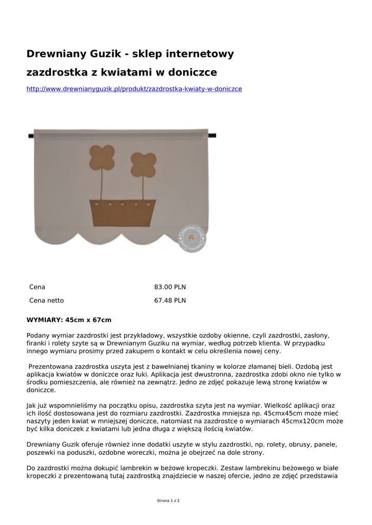 Drewniany Guzik - sklep internetowy zazdrostka z kwiatami w doniczce http://www.drewnianyguzik.pl/produkt/zazdrostka-kwiaty-w-doniczce Cena 83.00 PLN Cena netto 67.48 PLN WYMIARY: 45cm x 67cm Podany wymiar zazdrostki jest przykładowy, wszystkie ozdoby okienne, czyli zazdrostki, zasłony, firanki i rolety szyte są w Drewnianym Guziku na wymiar, według potrzeb klienta. W przypadku innego wymiaru prosimy przed zakupem o kontakt w celu określenia nowej ceny. Prezentowana zazdrostka uszyta jest z bawełnianej tkaniny w kolorze złamanej bieli. Ozdobą jest aplikacja kwiatów w doniczce oraz łuki. Aplikacja jest dwustronna, zazdrostka zdobi okno nie tylko w środku pomieszczenia, ale również na zewnątrz. Jedno ze zdjęć pokazuje lewą stronę kwiatów w doniczce. Jak już wspomnieliśmy na początku opisu, zazdrostka szyta jest na wymiar. Wielkość aplikacji oraz ich ilość dostosowana jest do rozmiaru zazdrostki. Zazdrostka mniejsza np. 45cmx45cm może mieć naszyty jeden kwiat w mniejszej doniczce, natomiast na zazdrostce o wymiarach 45cmx120cm może być kilka doniczek z kwiatami lub jedna długa z większą ilością kwiatów. Drewniany Guzik oferuje również inne dodatki uszyte w stylu zazdrostki, np. rolety, obrusy, panele, poszewki na poduszki, ozdobne woreczki, można je obejrzeć na dole strony. Do zazdrostki można dokupić lambrekin w beżowe kropeczki. Zestaw lambrekinu beżowego w białe kropeczki z prezentowaną tutaj zazdrostką znajdziecie w naszej ofercie, jedno ze zdjęć przedstawia Strona 1 z 2 taki komplet. UWAGI: 1. Przed szyciem tkaniny zostały zdekatyzowane ( zapobiega kurczeniu po praniu). 2. Zazdrostka jest krochmalona. Zalecamy krochmalenie zazdrostki po każdym praniu, zazdrostka będzie ładniej się prezentować. SUROWCE zazdrostka: bawełna ecrue 140G/M2 INSTRUKCJA OBSŁUGI Prać ręcznie Prasować w wysokiej temperaturze (najlepiej jeszcze wilgotne) Zaleca się krochmalenie dla uzyskania ładniejszego efektu Nie prać chemicznie Strona 2 z 2