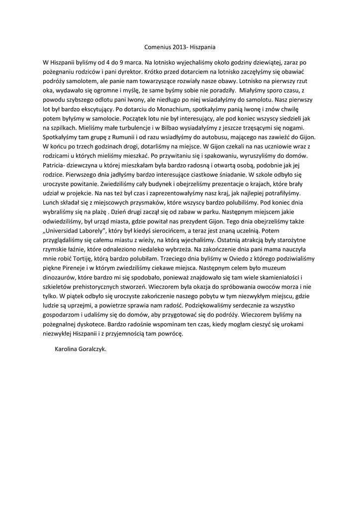 Comenius 2013- Hiszpania W Hiszpanii byliśmy od 4 do 9 marca. Na lotnisko wyjechaliśmy około godziny dziewiątej, zaraz po pożegnaniu rodziców i pani dyrektor. Krótko przed dotarciem na lotnisko zaczęłyśmy się obawiać podróży samolotem, ale panie nam towarzyszące rozwiały nasze obawy. Lotnisko na pierwszy rzut oka, wydawało się ogromne i myślę, że same byśmy sobie nie poradziły. Miałyśmy sporo czasu, z powodu szybszego odlotu pani Iwony, ale niedługo po niej wsiadałyśmy do samolotu. Nasz pierwszy lot był bardzo ekscytujący. Po dotarciu do Monachium, spotkałyśmy panią Iwonę i znów chwilę potem byłyśmy w samolocie. Początek lotu nie był interesujący, ale pod koniec wszyscy siedzieli jak na szpilkach. Mieliśmy małe turbulencje i w Bilbao wysiadałyśmy z jeszcze trzęsącymi się nogami. Spotkałyśmy tam grupę z Rumunii i od razu wsiadłyśmy do autobusu, mającego nas zawieźć do Gijon. W końcu po trzech godzinach drogi, dotarliśmy na miejsce. W Gijon czekali na nas uczniowie wraz z rodzicami u których mieliśmy mieszkać. Po przywitaniu się i spakowaniu, wyruszyliśmy do domów. Patricia- dziewczyna u której mieszkałam była bardzo radosną i otwartą osobą, podobnie jak jej rodzice. Pierwszego dnia jadłyśmy bardzo interesujące ciastkowe śniadanie. W szkole odbyło się uroczyste powitanie. Zwiedziliśmy cały budynek i obejrzeliśmy prezentacje o krajach, które brały udział w projekcie. Na nas też był czas i zaprezentowałyśmy nasz kraj, jak najlepiej potrafiłyśmy. Lunch składał się z miejscowych przysmaków, które wszyscy bardzo polubiliśmy. Pod koniec dnia wybraliśmy się na plażę . Dzień drugi zaczął się od zabaw w parku. Następnym miejscem jakie odwiedziliśmy, był urząd miasta, gdzie powitał nas prezydent Gijon. Tego dnia obejrzeliśmy także „Universidad Laborely”, który był kiedyś sierocińcem, a teraz jest znaną uczelnią. Potem przyglądaliśmy się całemu miastu z wieży, na którą wjechaliśmy. Ostatnią atrakcją były starożytne rzymskie łaźnie, które odnaleziono niedaleko wybrzeża. Na zakończenie dnia pani mama nauczyła mnie robić Tortiję, którą bardzo polubiłam. Trzeciego dnia byliśmy w Oviedo z którego podziwialiśmy piękne Pireneje i w którym zwiedziliśmy ciekawe miejsca. Następnym celem było muzeum dinozaurów, które bardzo mi się spodobało, ponieważ znajdowało się tam wiele skamieniałości i szkieletów prehistorycznych stworzeń. Wieczorem była okazja do spróbowania owoców morza i nie tylko. W piątek odbyło się uroczyste zakończenie naszego pobytu w tym niezwykłym miejscu, gdzie ludzie są uprzejmi, a powietrze sprawia nam radość. Podziękowaliśmy serdecznie za wszystko gospodarzom i udaliśmy się do domów, aby przygotować się do podróży. Wieczorem byliśmy na pożegnalnej dyskotece. Bardzo radośnie wspominam ten czas, kiedy mogłam cieszyć się urokami niezwykłej Hiszpanii i z przyjemnością tam powrócę. Karolina Goralczyk.