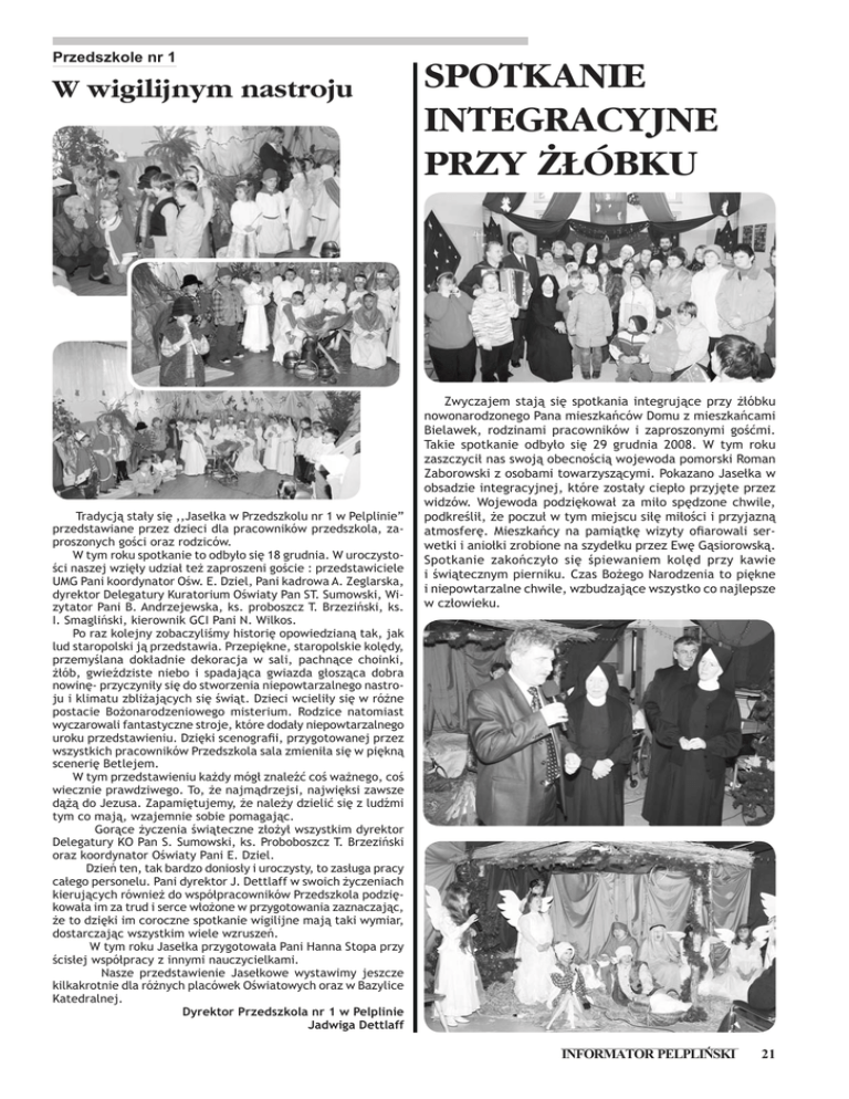 Przedszkole nr 1 W wigilijnym nastroju Tradycją stały się ,,Jasełka w Przedszkolu nr 1 w Pelplinie” przedstawiane przez dzieci dla pracowników przedszkola, zaproszonych gości oraz rodziców. W tym roku spotkanie to odbyło się 18 grudnia. W uroczystości naszej wzięły udział też zaproszeni goście : przedstawiciele UMG Pani koordynator Ośw. E. Dziel, Pani kadrowa A. Zeglarska, dyrektor Delegatury Kuratorium Oświaty Pan ST. Sumowski, Wizytator Pani B. Andrzejewska, ks. proboszcz T. Brzeziński, ks. I. Smagliński, kierownik GCI Pani N. Wilkos. Po raz kolejny zobaczyliśmy historię opowiedzianą tak, jak lud staropolski ją przedstawia. Przepiękne, staropolskie kolędy, przemyślana dokładnie dekoracja w sali, pachnące choinki, żłób, gwieździste niebo i spadająca gwiazda głosząca dobra nowinę- przyczyniły się do stworzenia niepowtarzalnego nastroju i klimatu zbliżających się świąt. Dzieci wcieliły się w różne postacie Bożonarodzeniowego misterium. Rodzice natomiast wyczarowali fantastyczne stroje, które dodały niepowtarzalnego uroku przedstawieniu. Dzięki scenografii, przygotowanej przez wszystkich pracowników Przedszkola sala zmieniła się w piękną scenerię Betlejem. W tym przedstawieniu każdy mógł znaleźć coś ważnego, coś wiecznie prawdziwego. To, że najmądrzejsi, najwięksi zawsze dążą do Jezusa. Zapamiętujemy, że należy dzielić się z ludźmi tym co mają, wzajemnie sobie pomagając. Gorące życzenia świąteczne złożył wszystkim dyrektor Delegatury KO Pan S. Sumowski, ks. Proboboszcz T. Brzeziński oraz koordynator Oświaty Pani E. Dziel. Dzień ten, tak bardzo doniosły i uroczysty, to zasługa pracy całego personelu. Pani dyrektor J. Dettlaff w swoich życzeniach kierujących również do współpracowników Przedszkola podziękowała im za trud i serce włożone w przygotowania zaznaczając, że to dzięki im coroczne spotkanie wigilijne mają taki wymiar, dostarczając wszystkim wiele wzruszeń. W tym roku Jasełka przygotowała Pani Hanna Stopa przy ścisłej współpracy z innymi nauczycielkami. Nasze przedstawienie Jasełkowe wystawimy jeszcze kilkakrotnie dla różnych placówek Oświatowych oraz w Bazylice Katedralnej. Dyrektor Przedszkola nr 1 w Pelplinie Jadwiga Dettlaff SPotkAnie inteGRACyJne PRZy żłóBku Zwyczajem stają się spotkania integrujące przy żłóbku nowonarodzonego Pana mieszkańców Domu z mieszkańcami Bielawek, rodzinami pracowników i zaproszonymi gośćmi. Takie spotkanie odbyło się 29 grudnia 2008. W tym roku zaszczycił nas swoją obecnością wojewoda pomorski Roman Zaborowski z osobami towarzyszącymi. Pokazano Jasełka w obsadzie integracyjnej, które zostały ciepło przyjęte przez widzów. Wojewoda podziękował za miło spędzone chwile, podkreślił, że poczuł w tym miejscu siłę miłości i przyjazną atmosferę. Mieszkańcy na pamiątkę wizyty ofiarowali serwetki i aniołki zrobione na szydełku przez Ewę Gąsiorowską. Spotkanie zakończyło się śpiewaniem kolęd przy kawie i świątecznym pierniku. Czas Bożego Narodzenia to piękne i niepowtarzalne chwile, wzbudzające wszystko co najlepsze w człowieku. INFORMATOR PELPLIŃSKI 21