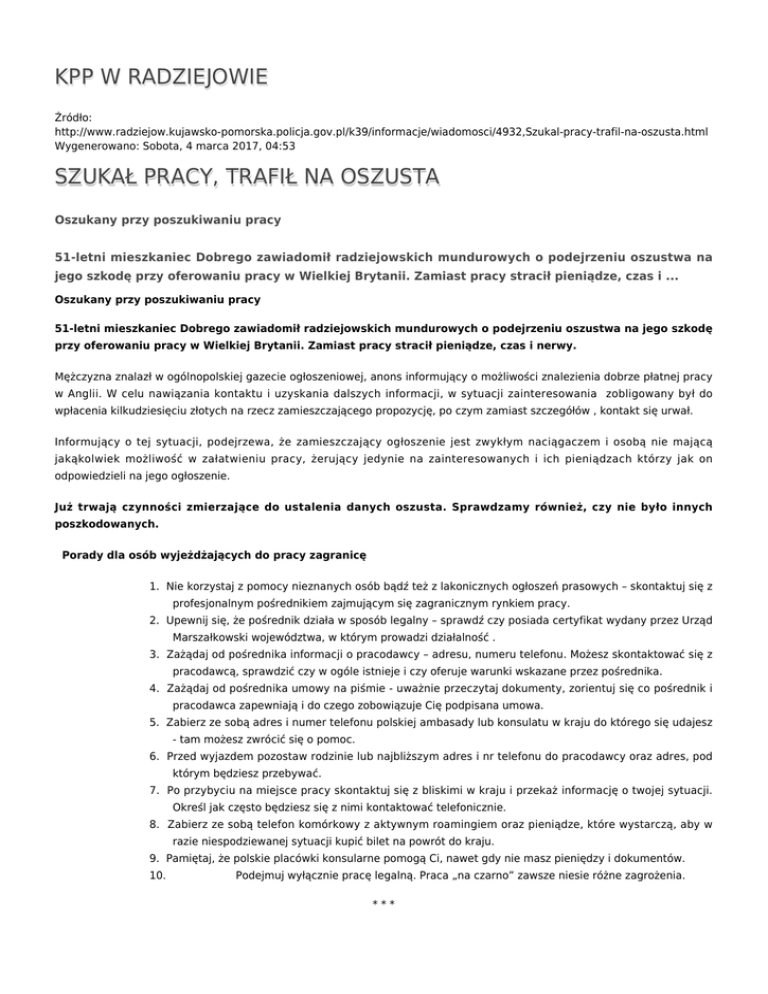 KPP W RADZIEJOWIE Źródło: http://www.radziejow.kujawsko-pomorska.policja.gov.pl/k39/informacje/wiadomosci/4932,Szukal-pracy-trafil-na-oszusta.html Wygenerowano: Sobota, 4 marca 2017, 04:53 SZUKAŁ PRACY, TRAFIŁ NA OSZUSTA Oszukany przy poszukiwaniu pracy 51-letni mieszkaniec Dobrego zawiadomił radziejowskich mundurowych o podejrzeniu oszustwa na jego szkodę przy oferowaniu pracy w Wielkiej Brytanii. Zamiast pracy stracił pieniądze, czas i ... Oszukany przy poszukiwaniu pracy 51-letni mieszkaniec Dobrego zawiadomił radziejowskich mundurowych o podejrzeniu oszustwa na jego szkodę przy oferowaniu pracy w Wielkiej Brytanii. Zamiast pracy stracił pieniądze, czas i nerwy. Mężczyzna znalazł w ogólnopolskiej gazecie ogłoszeniowej, anons informujący o możliwości znalezienia dobrze płatnej pracy w Anglii. W celu nawiązania kontaktu i uzyskania dalszych informacji, w sytuacji zainteresowania zobligowany był do wpłacenia kilkudziesięciu złotych na rzecz zamieszczającego propozycję, po czym zamiast szczegółów , kontakt się urwał. Informujący o tej sytuacji, podejrzewa, że zamieszczający ogłoszenie jest zwykłym naciągaczem i osobą nie mającą jakąkolwiek możliwość w załatwieniu pracy, żerujący jedynie na zainteresowanych i ich pieniądzach którzy jak on odpowiedzieli na jego ogłoszenie. Już trwają czynności zmierzające do ustalenia danych oszusta. Sprawdzamy również, czy nie było innych poszkodowanych. Porady dla osób wyjeżdżających do pracy zagranicę 1. Nie korzystaj z pomocy nieznanych osób bądź też z lakonicznych ogłoszeń prasowych – skontaktuj się z profesjonalnym pośrednikiem zajmującym się zagranicznym rynkiem pracy. 2. Upewnij się, że pośrednik działa w sposób legalny – sprawdź czy posiada certyfikat wydany przez Urząd Marszałkowski województwa, w którym prowadzi działalność . 3. Zażądaj od pośrednika informacji o pracodawcy – adresu, numeru telefonu. Możesz skontaktować się z pracodawcą, sprawdzić czy w ogóle istnieje i czy oferuje warunki wskazane przez pośrednika. 4. Zażądaj od pośrednika umowy na piśmie - uważnie przeczytaj dokumenty, zorientuj się co pośrednik i pracodawca zapewniają i do czego zobowiązuje Cię podpisana umowa. 5. Zabierz ze sobą adres i numer telefonu polskiej ambasady lub konsulatu w kraju do którego się udajesz - tam możesz zwrócić się o pomoc. 6. Przed wyjazdem pozostaw rodzinie lub najbliższym adres i nr telefonu do pracodawcy oraz adres, pod którym będziesz przebywać. 7. Po przybyciu na miejsce pracy skontaktuj się z bliskimi w kraju i przekaż informację o twojej sytuacji. Określ jak często będziesz się z nimi kontaktować telefonicznie. 8. Zabierz ze sobą telefon komórkowy z aktywnym roamingiem oraz pieniądze, które wystarczą, aby w razie niespodziewanej sytuacji kupić bilet na powrót do kraju. 9. Pamiętaj, że polskie placówki konsularne pomogą Ci, nawet gdy nie masz pieniędzy i dokumentów. 10. Podejmuj wyłącznie pracę legalną. Praca „na czarno” zawsze niesie różne zagrożenia. *** Jakie rodzaje agencji zatrudnienia mogą działać ma terenie Polski? Wyróżniamy pięć rodzajów agencji zatrudnienia: - pośrednictwa pracy na terenie Rzeczypospolitej Polskiej, - pośrednictwa obywateli polskich do pracy za granicą u pracodawców zagranicznych, - doradztwa personalnego, - poradnictwa zawodowego, - pracy tymczasowej. Zgodnie z ustawą z dnia 20 kwietnia 2004 r. o promocji zatrudnienia i instytucjach rynku pracy wszystkie licencjonowane agencje zatrudnienia oferujące usługi na terenie Rzeczpospolitej Polskiej muszą posiadać wpis do rejestru agencji zatrudnienia potwierdzony certyfikatem (do dnia 31.10.2005 r. wystawianym przez Ministra Gospodarki i Pracy, natomiast od dnia 1.11.2005 r. przez Marszałka Województwa, właściwego dla siedziby podmiotu). Za co agencje pośrednictwa pracy mogą pobierać opłaty? Zgodnie z art. 85 ust. 2 pkt 7 ustawy z dnia 20 kwietnia 2004 r. o promocji zatrudnienia i instytucjach rynku pracy, ze zmianami, dozwolone jest pobieranie od osób opłat z tytułu faktycznie poniesionych kosztów związanych ze skierowaniem do pracy za granicą, tj. kosztów poniesionych na: dojazd i powrót osoby skierowanej, wydawanie wizy, badania lekarskie i tłumaczenie dokumentów – pod warunkiem wyspecyfikowania tych opłat w umowie zawartej z osoba kierowaną do pracy za granicą. Dozwolone jest również pobieranie opłat z tytułu prowadzonej działalności w zakresie pośrednictwa pracy od racodawców. Za co agencje pośrednictwa pracy nie mogą pobierać opłat? Agencja pośrednictwa do pracy za granicą pracy od osób, dla których poszukuje zatrudnienia lub innej pracy zarobkowej, nie może pobierać opłat innych niż wyszczególnione powyżej, tj. opłat z tytułu: dojazdu i powrotu osoby skierowanej, wydawania wizy, badań lekarskich i tłumaczenia dokumentów. Od osób kierowanych do pracy za granicę zabronione jest pobieranie przedpłat, kaucji oraz opłat z tytułu wyszukiwania i wskazania pracodawcy zagranicznego, w szczególności: opłat eksploatacyjnych, wynagrodzenia pracowników, opłat z tytułu wynajmu lokalu, wyjazdów pracowników agencji, rekrutacji, usług pocztowo-telekomunikacyjnych, druków, reklamy i ogłoszeń prasowych. Gdzie szukać informacji o agencjach zatrudnienia? Ciągle pojawiają się informacje o działalności nielegalnych pośredników pracy za granicą. Dlatego zawsze należy sprawdzać, czy dana agencja pośrednicząca do pracy za granicą posiada certyfikat. Informacje te są umieszczane na stronach internetowych www.kraz.praca.gov.pl., oraz na stronach internetowych urzędów pracy, można je uzyskać telefonicznie lub pisemnie. Komisja Europejska udostępnia portal internetowy EURES znajdujący się na stronie www.eures.praca.gov.plzawierającą bazę ofert pracy krajów EOG. Działalność firm stanowiąca naruszenie przepisów ustawy z dnia 20 kwiet