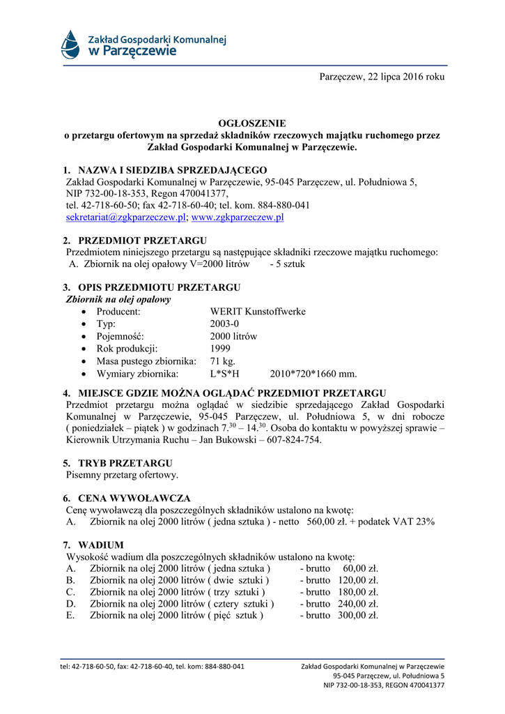Parzęczew, 22 lipca 2016 roku OGŁOSZENIE o przetargu ofertowym na sprzedaż składników rzeczowych majątku ruchomego przez Zakład Gospodarki Komunalnej w Parzęczewie. 1. NAZWA I SIEDZIBA SPRZEDAJĄCEGO Zakład Gospodarki Komunalnej w Parzęczewie, 95-045 Parzęczew, ul. Południowa 5, NIP 732-00-18-353, Regon 470041377, tel. 42-718-60-50; fax 42-718-60-40; tel. kom. 884-880-041 [email protected]; www.zgkparzeczew.pl 2. PRZEDMIOT PRZETARGU Przedmiotem niniejszego przetargu są następujące składniki rzeczowe majątku ruchomego: A. Zbiornik na olej opałowy V=2000 litrów - 5 sztuk 3. OPIS PRZEDMIOTU PRZETARGU Zbiornik na olej opałowy Producent: WERIT Kunstoffwerke Typ: 2003-0 Pojemność: 2000 litrów Rok produkcji: 1999 Masa pustego zbiornika: 71 kg. Wymiary zbiornika: L*S*H 2010*720*1660 mm. 4. MIEJSCE GDZIE MOŻNA OGLĄDAĆ PRZEDMIOT PRZETARGU Przedmiot przetargu można oglądać w siedzibie sprzedającego Zakład Gospodarki Komunalnej w Parzęczewie, 95-045 Parzęczew, ul. Południowa 5, w dni robocze ( poniedziałek – piątek ) w godzinach 7.30 – 14.30. Osoba do kontaktu w powyższej sprawie – Kierownik Utrzymania Ruchu – Jan Bukowski – 607-824-754. 5. TRYB PRZETARGU Pisemny przetarg ofertowy. 6. CENA WYWOŁAWCZA Cenę wywoławczą dla poszczególnych składników ustalono na kwotę: A. Zbiornik na olej 2000 litrów ( jedna sztuka ) - netto 560,00 zł. + podatek VAT 23% 7. WADIUM Wysokość wadium dla poszczególnych składników ustalono na kwotę: A. Zbiornik na olej 2000 litrów ( jedna sztuka ) - brutto 60,00 zł. B. Zbiornik na olej 2000 litrów ( dwie sztuki ) - brutto 120,00 zł. C. Zbiornik na olej 2000 litrów ( trzy sztuki ) - brutto 180,00 zł. D. Zbiornik na olej 2000 litrów ( cztery sztuki ) - brutto 240,00 zł. E. Zbiornik na olej 2000 litrów ( pięć sztuk ) - brutto 300,00 zł. tel: 42-718-60-50, fax: 42-718-60-40, tel. kom: 884-880-041 Zakład Gospodarki Komunalnej w Parzęczewie 95-045 Parzęczew, ul. Południowa 5 NIP 732-00-18-353, REGON 470041377 Wadium wnosi się wyłącznie w formie pieniężnej, w walucie PLN. Wadium złożone przez oferentów, których oferty nie zostały wybrane lub zostały odrzucone zwraca się w terminie 7 dni, odpowiednio od dnia rozstrzygnięcia przetargu lub odrzucenia oferty. Wadium złożone przez kupującego zalicza się w poczet ceny sprzedaży. Wadium nie podlega zwrotowi w przypadku gdy oferent, którego oferta została wybrana, uchyli się od zawarcia umowy. Wadium można wpłacić w kasie Zakładu lub przelewem na rachunek Zakładu Gospodarki Komunalnej w Parzęczewie. Bank Spółdzielczy w Ozorkowie. Numer rachunku 04 8786 0001 0030 0490 2000 0001. 8. CENA OFERTOWA Cena oferowana przez oferenta nie może być niższa od ceny wywoławczej dla danego składnika majątku rzeczowego. Każdy z oferentów może złożyć tylko jedną ofertę cenową na zakup poszczególnego składnika majątku. Termin związania ofertą zakupu wynosi 21 dni licząc od daty wyznaczonej na składanie ofert. 9. WARUNKI UCZESTNICTWA WPRZETARGU Warunkiem uczestnictwa w przetargu jest: a) złożenie oferty, wg. wzoru określonego w załączniku w wymaganym terminie, b) wniesienie wadium w ustalonej wysokości. 10. WYMAGANIA JAKIE WINNA SPEŁNIAĆ OFERTA Oferta pod rygorem nieważności powinna być sporządzona w formie pisemnej i musi zawierać: a) imię i nazwisko lub nazwę firmy oferenta, b) adres siedziby oferenta, c) telefon kontaktowy, d) numer PESEL oferenta a w przypadku firm nr NIP i REGON, e) datę sporządzenia oferty, f) cenę ofertową i warunki jej zapłaty, g) oświadczenie oferenta, że zapoznał się ze stanem technicznym pojazdu lub że ponosi odpowiedzialność za skutki wynikające z rezygnacji z oględzin sprzedawanego sprzętu. 11. TERMIN I MIEJSCE SKŁADANIA OFERT Ofertę wraz z wymaganymi dokumentami ( oświadczenie, potwierdzenie wpłaty wadium ) należy złożyć w dni robocze ( poniedziałek – piątek ) w godzinach 7.30 – 14.30 nie później niż jednak do dnia 17 sierpnia 2016 roku, do godz. 10.00, w sekretariacie Zakładu Gospodarki Komunalnej w Parzęczewie, ul. Południowa 5, sekretariat, w zamkniętej kopercie z napisem: „Oferta na zakup sprzętu ruchomego ZGK – przetarg I – zakup zbiornika na olej” Oferty złożone po wyznaczonym terminie nie będą rozpatrywane. W przypadku złożenia dwóch ofert o jednakowej najwyższej cenie, komisja przetargowa zorganizuje dodatkowy przetarg ustny dla oferentów, którzy podali jednakowe ceny. Kwota postąpienia nie może być niższa od 25,00 zł. netto. Komisja zawiadomi oferentów o dodatkowym terminie. 12. TERMIN I MIEJSCE OTWARCIA OFERT Otwarcie ofert nastąpi w dniu 12 sierpnia 2016 roku, do godz. 10.30 w pokoju dyrektora Zakładu Gospodarki Komunalnej w Parzęczewie, ul. Południowa 5. Zakład Gospodarki Komunalnej w Parzęczewie ul. Południowa, 95-045 Parzęczew NIP 732-00-18-353, REGON 470041377 tel: 42-728-60-50, fax: 42-718-60-40 13. ODRZUCENIE OFERTY Komisja przetargowa odrzuci ofertę jeśli: a) Została złożona po wyznaczonym terminie, w niewłaściwym miejscu lub przez oferenta, który nie wniósł wadium, b) Nie zawiera danych i dokumentów takich jak: dowód wpłaty wadium, informacji o których mowa w pkt. 9. O odrzuceniu oferty komisja przetargowa zawiadamia niezwłocznie oferenta. 14. INFORMACJE POZOSTAŁE 1. Zakład Gospodarki Komunalnej w Parzęczewie zastrzega sobie prawo do zamknięcia przetargu bez wybrania oferty, bez podania przyczyn. 2. Złożenie jednej, ważnej oferty wystarcza do przeprowadzenia przetargu. 3. Komisja przetargowa wybierze ofertę z najwyższą ceną spełniającą warunki przetargu. 4. W terminie do 7 dni od powiadomienia oferenta o wyborze jego oferty, wybrany oferent wpłaci wymaganą należność na rzecz Sprzedającego. Kwota wniesionego wadium zostanie zaliczona na poczet ceny. 5. Data podpisania umowy zostanie określona niezwłocznie po wyborze najkorzystniejszej oferty. 6. Oferent – kupujący