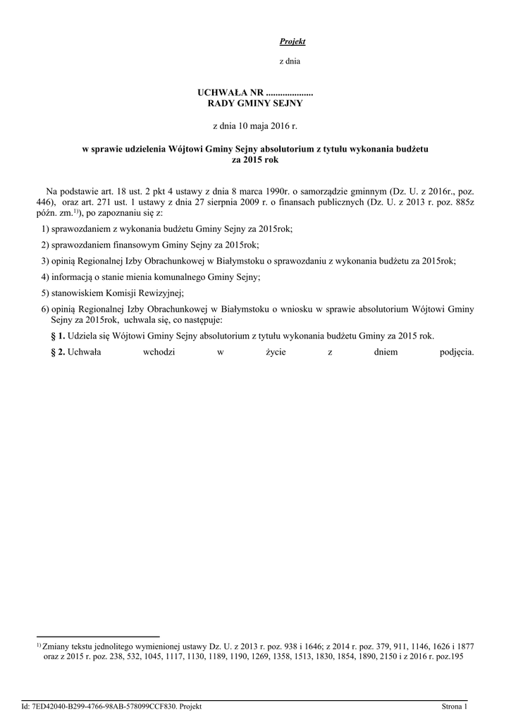 Projekt z dnia UCHWAŁA NR .................... RADY GMINY SEJNY z dnia 10 maja 2016 r. w sprawie udzielenia Wójtowi Gminy Sejny absolutorium z tytułu wykonania budżetu za 2015 rok Na podstawie art. 18 ust. 2 pkt 4 ustawy z dnia 8 marca 1990r. o samorządzie gminnym (Dz. U. z 2016r., poz. 446), oraz art. 271 ust. 1 ustawy z dnia 27 sierpnia 2009 r. o finansach publicznych (Dz. U. z 2013 r. poz. 885z późn. zm.1)), po zapoznaniu się z: 1) sprawozdaniem z wykonania budżetu Gminy Sejny za 2015rok; 2) sprawozdaniem finansowym Gminy Sejny za 2015rok; 3) opinią Regionalnej Izby Obrachunkowej w Białymstoku o sprawozdaniu z wykonania budżetu za 2015rok; 4) informacją o stanie mienia komunalnego Gminy Sejny; 5) stanowiskiem Komisji Rewizyjnej; 6) opinią Regionalnej Izby Obrachunkowej w Białymstoku o wniosku w sprawie absolutorium Wójtowi Gminy Sejny za 2015rok, uchwala się, co następuje: § 1. Udziela się Wójtowi Gminy Sejny absolutorium z tytułu wykonania budżetu Gminy za 2015 rok. § 2. Uchwała wchodzi w życie z dniem podjęcia. 1) Zmiany tekstu jednolitego wymienionej ustawy Dz. U. z 2013 r. poz. 938 i 1646; z 2014 r. poz. 379, 911, 1146, 1626 i 1877 oraz z 2015 r. poz. 238, 532, 1045, 1117, 1130, 1189, 1190, 1269, 1358, 1513, 1830, 1854, 1890, 2150 i z 2016 r. poz.195 Id: 7ED42040-B299-4766-98AB-578099CCF830. Projekt Strona 1 Uzasadnienie Zgodnie z art. 18 ust. 2 pkt 4 ustawy z dnia 8 marca 1990 r. o samorządzie gminnym (Dz. U. z 2016r., poz. 446), do własciwosci Rady Gminy nalezy rozpatrywanie sprawozdania z wykonania budżetu oraz podejmowanie uchwały w sprawie udzielenia lub nie udzielenia absolutorium z tego tytułu. Wykonanie budżetu gminy opiniuje komisja rewizyjna i występuje z wnioskiem do Rady Gminy w sprawie udzielenia lub nie udzielenia absolutorium wójtowi. Wniosek w sprawie absolutorium podlega zaopiniowaniu przez Regionalna Izbę Obrachunkowa (art.18a 3 ww. ustawy) Zgodnie z artykułem art. 271 ust. 1 ustawy z dnia 27 sierpnia 2009 r. o finansach publicznych (Dz. U. z 2013 r. poz. 885z późn. zm.1)), nie później niż do dnia 30 czerwca roku następującego po roku budżetowym, Rada Gminy podejmuje uchwałę w sprawie absolutorium dlaójta. Przed podjęciem uchwały w sprawie udzielenia absolutorium Rada Gminy zapoznaje się z: 1) sprawozdaniem z wykonania budżetu Gminy Sejny za 2015rok; 2) sprawozdaniem finansowym Gminy Sejny za 2015rok; 3) opinią Regionalnej Izby Obrachunkowej w Białymstoku o sprawozdaniu z wykonania budżetu za 2015rok; 4) informacją o stanie mienia komunalnego Gminy Sejny; 5) stanowiskiem Komisji Rewizyjnej; 6) opinią Regionalnej Izby Obrachunkowej w Białymstoku o wniosku w sprawie absolutorium Wójtowi Gminy Sejny za 2015rok, 1) Zmiany tekstu jednolitego wymienionej ustawy Dz. U. z 2013 r. poz. 938 i 1646; z 2014 r. poz. 379, 911, 1146, 1626 i 1877 oraz z 2015 r. poz. 238, 532, 1045, 1117, 1130, 1189, 1190, 1269, 1358, 1513, 1830, 1854, 1890, 2150 i z 2016 r. poz.195 Id: 7ED42040-B299-4766-98AB-578099CCF830. Projekt Strona 1