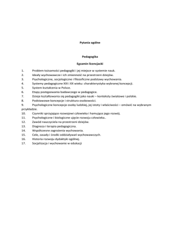 Pytania ogólne Pedagogika Egzamin licencjacki 1. Problem tożsamości pedagogiki i jej miejsce w systemie nauk. 2. Ideały wychowawcze i ich zmienność na przestrzeni dziejów. 3. Psychologiczne, socjologiczne i filozoficzne podstawy wychowania. 4. Systemy pedagogiczne XIX i XX wieku: charakterystyka wybranej koncepcji. 5. System kształcenia w Polsce. 6. Etapy postępowania badawczego w pedagogice. 7. Dzieje kształtowania się pedagogiki jako nauki – konteksty światowe i polskie. 8. Podstawowe koncepcje i struktura osobowości. 9. Psychologiczne koncepcje osoby ludzkiej, jej istoty i właściwości – omówić na wybranym przykładzie. 10. Czynniki sprzyjające rozwojowi człowieka i hamujące jego rozwój. 11. Psychologiczne i biologiczne ujęcie rozwoju człowieka.. 12. Zawód nauczyciela na przestrzeni dziejów. 13. Diagnoza i terapia pedagogiczna. 14. Współczesne zagrożenia wychowania. 15. Cele, zasady i środki oddziaływań wychowawczych. 16. Historia rozwoju dydaktyki ogólnej. 17. Socjalizacja i wychowanie w edukacji 18.Wybrane dziedziny aktywności człowieka: kultura, czas wolny, rekreacja, aktywność społeczna i obywatelska, organizacje pozarządowe, wolontariat. 19.Zasady nauczania 20. Fazy budowy lekcji . Pytania ogólne Pedagogika II stopień 1. j Pole badań pedagogiki jako nauki. 2. Pedagogika społeczna jako humanistyczna nauka o człowieku albojako empiryczna nauka o neopozytywistycznych standardach. 3. Znaczenie metodologii badan pedagogicznych i społecznych dla rozwoju myśli pedagogicznej. 4. Rola problemów i hipotez w badaniu naukowym . 5. Przyczyny niepowodzeń szkolnych metody przeciwdziałania im. 6. Rola mediów w wychowaniu i kształceniu. 7. Proces boloński i jego konsekwencje dla szkolnictwa wyższego w Polsce 8. Współczesne teorie i nurty w wychowaniu ( w oparciu o wybrane przykłady). 9. Procesy rozwoju osoby (socjalizacja, enkulturacja, wychowanie, kształcenie, samokształtowanie) 10. Psychologia i jej udział w rozwijaniu teorii i praktyki pedagogicznej 11. Prawo i jego związki z wychowaniem i kształceniem . 12. Reformy oświatowe, ich istota i aktualne doświadczenia. 13. Współczesne subdyscypliny pedagogii ( w oparciu o wybrane przykłady) . 14. Podstawowe rodzaje struktur społecznych – relacje między nimi. 15. Podstawowe środowiska wychowawcze – charakterystyka. 16. Teorie wychowania i kształcenia – analiza i interpretacja. 17. BHP w instytucjach edukacyjnych i wychowawczych. 18. Zasady i normy etyczne w działalności edukacyjnej i wychowawczej . 19. Mechanizmy komunikacji interpersonalnej. 20. Analiza i ocena różnych zjawisk społecznych wpływających na kształcenie i wychowanie.