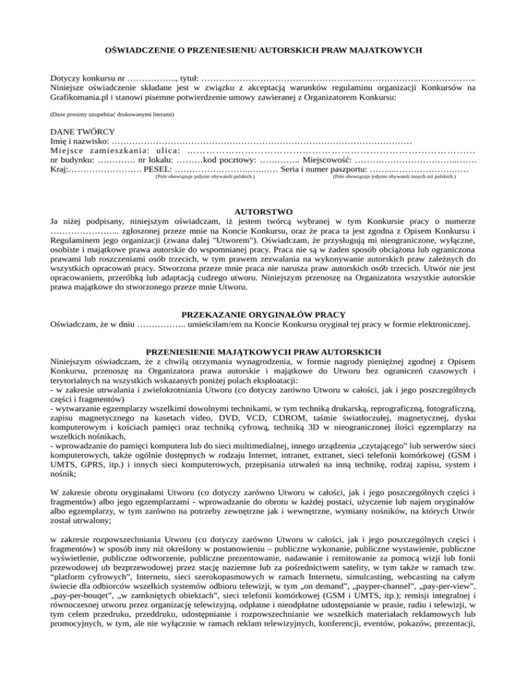 OŚWIADCZENIE O PRZENIESIENIU AUTORSKICH PRAW MAJATKOWYCH Dotyczy konkursu nr …………….., tytuł: ………………………………………………………………..……………….. Niniejsze oświadczenie składane jest w związku z akceptacją warunków regulaminu organizacji Konkursów na Grafikomania.pl i stanowi pisemne potwierdzenie umowy zawieranej z Organizatorem Konkursu: (Dane prosimy uzupełniać drukowanymi literami) DANE TWÓRCY Imię i nazwisko: ………………………………………………………………………………………… Miejsce zamieszkania: ulica: ………………………………………………………………………….….. nr budynku: …………. nr lokalu: ………kod pocztowy: ………….. Miejscowość: ……………………………..……. Kraj:……………………. PESEL: ……………………..….…… Seria i numer paszportu: ……....……………….…… (Pole obowiązuje jedynie obywateli polskich.) (Pole obowiązuje jedynie obywateli innych niż polskich.) AUTORSTWO Ja niżej podpisany, niniejszym oświadczam, iż jestem twórcą wybranej w tym Konkursie pracy o numerze …………………... zgłoszonej przeze mnie na Koncie Konkursu, oraz że praca ta jest zgodna z Opisem Konkursu i Regulaminem jego organizacji (zwana dalej "Utworem"). Oświadczam, że przysługują mi nieograniczone, wyłączne, osobiste i majątkowe prawa autorskie do wspomnianej pracy. Praca nie są w żaden sposób obciążona lub ograniczona prawami lub roszczeniami osób trzecich, w tym prawem zezwalania na wykonywanie autorskich praw zależnych do wszystkich opracowań pracy. Stworzona przeze mnie praca nie narusza praw autorskich osób trzecich. Utwór nie jest opracowaniem, przeróbką lub adaptacją cudzego utworu. Niniejszym przenoszę na Organizatora wszystkie autorskie prawa majątkowe do stworzonego przeze mnie Utworu. PRZEKAZANIE ORYGINAŁÓW PRACY Oświadczam, że w dniu …………….. umieściłam/em na Koncie Konkursu oryginał tej pracy w formie elektronicznej. PRZENIESIENIE MAJĄTKOWYCH PRAW AUTORSKICH Niniejszym oświadczam, że z chwilą otrzymania wynagrodzenia, w formie nagrody pieniężnej zgodnej z Opisem Konkursu, przenoszę na Organizatora prawa autorskie i majątkowe do Utworu bez ograniczeń czasowych i terytorialnych na wszystkich wskazanych poniżej polach eksploatacji: - w zakresie utrwalania i zwielokrotniania Utworu (co dotyczy zarówno Utworu w całości, jak i jego poszczególnych części i fragmentów) - wytwarzanie egzemplarzy wszelkimi dowolnymi technikami, w tym techniką drukarską, reprograficzną, fotograficzną, zapisu magnetycznego na kasetach video, DVD, VCD, CDROM, taśmie światłoczułej, magnetycznej, dysku komputerowym i kościach pamięci oraz techniką cyfrową, techniką 3D w nieograniczonej ilości egzemplarzy na wszelkich nośnikach, - wprowadzanie do pamięci komputera lub do sieci multimedialnej, innego urządzenia „czytającego” lub serwerów sieci komputerowych, także ogólnie dostępnych w rodzaju Internet, intranet, extranet, sieci telefonii komórkowej (GSM i UMTS, GPRS, itp.) i innych sieci komputerowych, przepisania utrwaleń na inną technikę, rodzaj zapisu, system i nośnik; W zakresie obrotu oryginałami Utworu (co dotyczy zarówno Utworu w całości, jak i jego poszczególnych części i fragmentów) albo jego egzemplarzami - wprowadzanie do obrotu w każdej postaci, użyczenie lub najem oryginałów albo egzemplarzy, w tym zarówno na potrzeby zewnętrzne jak i wewnętrzne, wymiany nośników, na których Utwór został utrwalony; w zakresie rozpowszechniania Utworu (co dotyczy zarówno Utworu w całości, jak i jego poszczególnych części i fragmentów) w sposób inny niż określony w postanowieniu – publiczne wykonanie, publiczne wystawienie, publiczne wyświetlenie, publiczne odtworzenie, publiczne prezentowanie, nadawanie i remitowanie za pomocą wizji lub fonii przewodowej ub bezprzewodowej przez stację naziemne lub za pośrednictwem satelity, w tym także w ramach tzw. “platform cyfrowych”, Internetu, sieci szerokopasmowych w ramach Internetu, simulcasting, webcasting na całym świecie dla odbiorców wszelkich systemów odbioru telewizji, w tym „on demand”, „payper-channel”, „pay-per-view”, „pay-per-bouqet”, „w zamkniętych obiektach”, sieci telefonii komórkowej (GSM i UMTS, itp.); remisji integralnej i równoczesnej utworu przez organizację telewizyjną, odpłatne i nieodpłatne udostępnianie w prasie, radiu i telewizji, w tym celem przedruku, przeddruku, udostępnianie i rozpowszechnianie we wszelkich materiałach reklamowych lub promocyjnych, w tym, ale nie wyłącznie w ramach reklam telewizyjnych, konferencji, eventów, pokazów, prezentacji, zamkniętych i otwartych pokazów, TV, Internetu, prasy, billboardów, specjalistycznych pojazdów poruszających się w ruchu ulicznym (mobile), środków komunikacji miejskiej i transportu, BTL, sponsoringu itp., a także publiczne udostępnianie Utworu (co dotyczy zarówno Utworu w całości, jak i jego poszczególnych części i fragmentów) w taki sposób, aby każdy mógł mieć do niego dostęp w miejscu i w czasie przez siebie wybranym, w tym w sieci Internet, w sieciach telekomunikacyjnych lub komputerowych lub w związku ze świadczeniem usług telekomunikacyjnych, w tym w szczególności w sieci Internet, we wszelkich sieciach wewnętrznych – intranet, na stronach internetowych, w sieciach multimedialnych lub teleinformatycznych; Użyczanie Utworu (co dotyczy Utworu w całości, jak i jego poszczególnych części i fragmentów) w obrocie gospodarczym na zasadzie wyłączności w charakterze znaku towarowego celem oznaczenia dowolnych towarów lub usług, w tym w szczególności zgłoszenia do rejestracji jako znaku towarowego dla dowolnych towarów lub usług oraz jego używanie w charakterze znaku towarowego dla towarów lub usług o