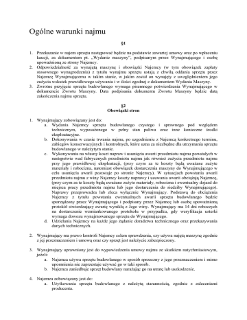 Ogólne warunki najmu §1 1. Przekazanie w najem sprzętu następować będzie na podstawie zawartej umowy oraz po wpłaceniu kaucji, za dokumentem pt. „Wydanie maszyny”, podpisanym przez Wynajmującego i osobę upoważnioną ze strony Najemcy. 2. Odpowiedzialność za wynajętą maszynę i obowiązki Najemcy (w tym obowiązek zapłaty stosownego wynagrodzenia) z tytułu wynajmu sprzętu ustają z chwilą oddania sprzętu przez Najemcę Wynajmującemu w takim stanie, w jakim został on wynajęty z uwzględnieniem jego zużycia wskutek prawidłowego używania i w ilości zgodnej z dokumentem Wydania Maszyny. 3. Zwrotne przyjęcie sprzętu budowlanego wymaga pisemnego potwierdzenia Wynajmującego w dokumencie Zwrotu Maszyny. Data podpisania dokumentu Zwrotu Maszyny będzie datą zakończenia najmu sprzętu. §2 Obowiązki stron 1. Wynajmujący zobowiązany jest do: a. Wydania Najemcy sprzętu budowlanego czystego i sprawnego pod względem technicznym, wyposażonego w pełny stan paliwa oraz inne konieczne środki eksploatacyjne. b. Dokonywania w czasie trwania najmu, po uzgodnieniu z Najemcą konkretnego terminu, zabiegów konserwacyjnych i kontrolnych, które uzna za niezbędne dla utrzymania sprzętu budowlanego w należytym stanie. c. Wykonywania na własny koszt napraw i usunięcia awarii przedmiotu najmu powstałych w następstwie wad fabrycznych przedmiotu najmu jak również zużycia przedmiotu najmu przy jego prawidłowej eksploatacji, (przy czym za te koszty będą uważane zużyte materiały i robocizna, natomiast obowiązek dostarczenia maszyny do Wynajmującego w celu usunięcia awarii pozostaje po stronie Najemcy). W sytuacjach powstania awarii przedmiotu najmu z winy Najemcy koszty naprawy i usuwania awarii obciążają Najemcę, (przy czym za te koszty będą uważane zużyte materiały, robocizna i ewentualny dojazd do miejsca pracy przedmiotu najmu lub jego dostarczenia do siedziby Wynajmującego). Naprawy przeprowadza lub zleca wyłącznie Wynajmujący. Podstawą do obciążenia Najemcy z tytułu powstania ewentualnych awarii sprzętu budowlanego będzie sporządzony przez Wynajmującego i podpisany przez Najemcę lub osobę upoważnioną protokół stwierdzający awarię wynikłą z Jego winy. Wynajmujący ma 14 dni roboczych na dostarczenie wzmiankowanego protokołu w przypadku, gdy weryfikacja usterki wymaga dowozu wynajmowanego sprzętu do Wynajmującego. d. Udzielania Najemcy na każde jego żądanie doradztwa technicznego oraz przekazywania danych technicznych. 2. Wynajmujący ma prawo kontroli Najemcy celem sprawdzenia, czy używa najętą maszynę zgodnie z jej przeznaczeniem i umową oraz czy sprzęt jest należycie zabezpieczony. 3. Wynajmujący uprawniony jest do wypowiedzenia umowy najmu ze skutkiem natychmiastowym, jeżeli: a. Najemca używa sprzętu budowlanego w sposób sprzeczny z jego przeznaczeniem i mimo upomnienia nie zaprzestaje używać go w taki sposób. b. Najemca zaniedbuje sprzęt budowlany narażając go na utratę lub uszkodzenie. 4. Najemca zobowiązany jest do: a. Użytkowania sprzętu budowlanego z należytą starannością, zgodnie z zaleceniami producenta. b. Zapewnienia obsługi przedmiotu najmu przez osoby posiadające odpowiednie, wymagane przez prawo, uprawnienia i kwalifikacje. c. Niezwłocznego - tj. w dniu stwierdzenia usterki, zniszczenia, kradzieży lub innej utraty wynajętego sprzętu - powiadamiania Wynajmującego o zaistnieniu powyższych okoliczności, d. Niezwłocznego, w dniu stwierdzenia kradzieży najętego sprzętu, powiadomienia organów ścigania o jej zaistnieniu, e. Sprawnego rozładunku i załadunku sprzętu budowlanego na budowach. f. Ponoszenia kosztów eksploatacyjnych i bieżącego utrzymania wynajętego sprzętu, w tym kosztów paliwa. g. Użytkowania sprzętu budowlanego w miejscu wskazanym w Wydaniu Maszyny. h. Niezwłocznego zawiadomienia Wynajmującego o każdej zmianie miejsca użytkowania wynajętego sprzętu i uzyskania zgody Wynajmującego na powyższą zmianę, i. Dbałości o wynajęte rzeczy oraz zastosowania prawidłowych środków celem zabezpieczenia sprzętu przed jakimkolwiek uszkodzeniem, zniszczeniem, utratą bądź kradzieżą, j. Nieczynienia żadnych zmian w przedmiocie najmu, w szczególności Najemca nie może montować nowych ani wymienić jakichkolwiek części (zamiennych, zapasowych i innych) w wynajętym sprzęcie ani montować dodatkowego osprzętu - chyba, że wcześniej uzyska zgodę Wynajmującego na powyższe modyfikacje. Najemca ponosi pełną odpowiedzialność odszkodowawczą za wszelkie powstałe na skutek nieuzgodnionych modyfikacji sprzętu szkody, obniżenie wartości rzeczy lub koszty przywrócenia rzeczy do stanu poprzedniego, k. Terminowego zwrotu najętego sprzętu z pełnym stanem paliwa, l. Poniesienia kosztów napraw najętego sprzętu w przypadku awarii, za które odpowiedzialność ponosi Najemca, m. Terminowej zapłaty za najęty sprzęt. 5. Najemca ponosi pełną odpowiedzialność za uszkodzenia lub zmiany rzeczy niezwiązane ze zwykłym jej użytkowaniem (chyba, że są one wynikiem wad fabrycznych sprzętu) oraz za utratę bądź zniszczenie przedmiotu najmu. 6. W przypadku wystąpienia usterki w wynajętym sprzęcie, o którym mowa w pkt. 1, ppk. c do okresu naliczania czynszu nie wlicza się czasu od momentu jej zgłoszenia do chwili wykonania przez Wynajmującego naprawy. 7. Ryzyko utraty lub uszkodzenia najętego sprzętu niezależnie od jego przyczyny przechodzi na Najemcę z chwilą podpisania dokumentu Wydania Maszyny i odbioru przez niego sprzętu. 8. Odpowiedzialność za szkody wobec osób trzecich powstałe na skutek prac prowadzonych przy użyciu wynajętego sprzętu ponosi Najemca. 9. Skutki uszkodzeń, awarii i strat powstałych przez nieprzestrzeganie instrukcji obsługi sprzętu budowlanego oraz zasad BHP będą obciążały Najemcę. 10. W przypadku uszkodzenia sprzętu wynikającego z winy Najemcy, Najemca zobowiązany jest do pokrycia 