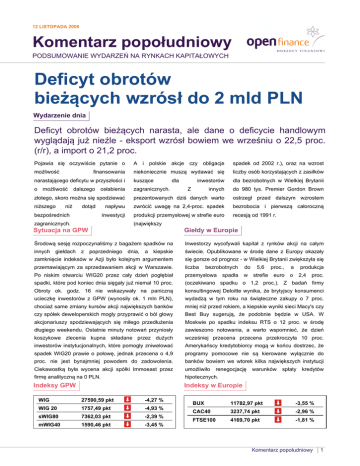 12 LISTOPADA 2008 Komentarz popołudniowy PODSUMOWANIE WYDARZEŃ NA RYNKACH KAPITAŁOWYCH Deficyt obrotów bieżących wzrósł do 2 mld PLN Wydarzenie dnia Deficyt obrotów bieżących narasta, ale dane o deficycie handlowym wyglądają już nieźle - eksport wzrósł bowiem we wrześniu o 22,5 proc. (r/r), a import o 21,2 proc. Pojawia się oczywiście pytanie o A i polskie akcje czy obligacje spadek od 2002 r.), oraz na wzrost możliwość niekoniecznie muszą wydawać się liczby osób korzystających z zasiłków narastającego deficytu w przyszłości i kuszące inwestorów dla bezrobotnych w Wielkiej Brytanii o zagranicznych. innych do 980 tys. Premier Gordon Brown złotego, skoro można się spodziewać prezentowanych dziś danych warto ostrzegł przed dalszym wzrostem niższego napływu zwrócić uwagę na 2,4-proc. spadek bezrobocia i pierwszą całoroczną inwestycji produkcji przemysłowej w strefie euro recesją od 1991 r. finansowania możliwość dalszego niż osłabienia dotąd bezpośrednich zagranicznych. dla Z (największy Sytuacja na GPW Giełdy w Europie Środową sesję rozpoczynaliśmy z bagażem spadków na Inwestorzy wycofywali kapitał z rynków akcji na całym innych kiepskie świecie. Opublikowane w środę dane z Europy okazały zamknięcie indeksów w Azji było kolejnym argumentem giełdach z poprzedniego dnia, a się gorsze od prognoz - w Wielkiej Brytanii zwiększyła się przemawiającym za sprzedawaniem akcji w Warszawie. liczba Po niskim otwarciu WIG20 przez cały dzień pogłębiał przemysłowa spadki, które pod koniec dnia sięgały już niemal 10 proc. (oczekiwano spadku o 1,2 proc.). Z badań firmy Obroty ok. godz. 16 nie wskazywały na paniczną konsultingowej Deloitte wynika, że brytyjscy konsumenci ucieczkę inwestorów z GPW (wynosiły ok. 1 mln PLN), wydadzą w tym roku na świąteczne zakupy o 7 proc. chociaż same zmiany kursów akcji największych banków mniej niż przed rokiem, a kiepskie wyniki sieci Macy's czy czy spółek deweloperskich mogły przyprawić o ból głowy Best Buy sugerują, że podobnie będzie w USA. W akcjonariuszy spodziewających się miłego przedłużenia Moskwie po spadku indeksu RTS o 12 proc. w środę długiego weekendu. Ostatnie minuty notowań przyniosły zawieszono notowania, a warto wspomnieć, że dzień koszykowe zlecenia kupna składane przez dużych wcześniej przecena przecena przekroczyła 10 proc. inwestorów instytucjonalnych, które pomogły zniwelować Amerykańscy kredytobiorcy mogą w końcu dostrzec, że spadek WIG20 prawie o połowę, jednak przecena o 4,9 programy pomocowe nie są kierowane wyłącznie do proc. nie jest bynajmniej powodem do zadowolenia. banków bowiem we wtorek kilka największych instytucji Ciekawostką była wycena akcji spółki Immoeast przez umożliwiło firmę analityczną na 0 PLN. hipotecznych. Indeksy GPW Indeksy w Europie WIG 27590,59 pkt -4,27 % WIG 20 1757,49 pkt -4,93 % sWIG80 7362,03 pkt -2,39 % mWIG40 1590,46 pkt -3,45 % bezrobotnych spadła do 5,6 proc., a produkcja w strefie euro o 2,4 renegocjację warunków spłaty proc. kredytów BUX 11782,97 pkt -3,55 % CAC40 3237,74 pkt -2,96 % FTSE100 4169,70 pkt -1,81 % Komentarz popołudniowy 1 Waluty Fixing NBP Notowania euro pierwszy raz od dwóch tygodni spadły poniżej 1,25 USD, ale do dołka intraday (także sprzed dwóch tygodni) jesze im nieco brakuje (1,233 USD). Nie mniej wobec kolejnych rozczarowujących danych z Europy to dolar uznawany jest wciąż za bezpieczniejszą walutę. EUR 3,7693 +3,48 % CHF 2,5334 +4,81 % USD 3,0065 +6,12 % JPY 0,0309 +8,04 % GBP 4,6215 +3,73 % Jen zyskał dziś 2,5 proc. do dolara i 2,7 proc. wobec euro, zatem proces odwrotny do carry-trade cały czas WIBOR I LIBOR trwa. Dla nas nie są to dobre wiadomości. Dolar powrócił Polska 6,53 % -0,15 % powyżej 3 PLN i dziś wyceniany był na 3,02 złotego. Euro USA 3,93 % +5,65 % staniało do 2,77 PLN, a frank podskoczył do 2,56 PLN. Euroland 5,04 % +0,80 % Wzrost deficytu obrotów bieżących miał minimalny wpływ Szwajcaria 2,80 % +1,08 % na notowania naszej waluty - ważniejsze było zachowanie dolara i - w przypadku franków - jena na arenie międzynarodowej. Surowce Notowania surowców Kryzys kredytowy w połączeniu z niskim cenami energii Ropa 53,21 USD -4,20 % Złoto 719,00 USD -1,96 % Srebro 9,43 USD -3,38 % inwestycyjnych i alarmuje, że niedobór ropy z nowych Platyna 816,00 USD +0,31 % źródeł może być znacznie poważniejszy w skutkach niż Miedź 3620,00 USD -0,55 % czynniki stojące za letnimi wzrostami ceny baryłki Aluminium 1915,00 USD -1,54 % powyżej 147 USD. W środę baryłka kosztowała o 90 Cyna 13660,00 USD -5,47 % dolarów mniej, a prasa ekonomiczna donosi, że najwięksi Cynk 1120,00 USD +1,36 % eksporterzy zabezpieczają się kontraktami terminowymi Nikiel 10700,00 USD -0,93 % przed Ołów 1280,00 USD -0,78 % spycha świat na niebezpieczne tory. Międzynarodowa Agencja Energii twierdzi, że niemal każdego dnia dowiaduje się o wstrzymywaniu kolejnych projektów utrzymaniem niskich cen przez najbliższe miesiące. Inwestorzy z rynku metali przemysłowych realizowali zyski po ostatnim odbiciu - miedź była Notowania surowców z 11 listopada 2008 r. najtańsza od trzech lat, a zapasy czerwonego metalu oczekującego na kupców w magazynach londyńskiej giełdy wzrosły do najwyższych poziomów od marca 2004 r. KOMENTARZ PRZYGOTOWALI: Łukasz Wróbel - giełdy zagraniczne, surowce, GPW; Emil Szweda - wydarzenie dnia, waluty. Open Finance Dane dostarcza Notoria Serwis Sp. z o. o. Komentarz popołudniowy 2