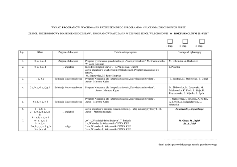 WYKAZ PROGRAMÓW WYCHOWANIA PRZEDSZKOLNEGO I PROGRAMÓW NAUCZANIA ZGŁOSZONYCH PRZEZ ZESPÓŁ PRZEDMIOTOWY DO SZKOLNEGO ZESTAWU PROGRAMÓW NAUCZANIA W ZESPOLE SZKÓŁ W LEGIONOWIE W ROKU SZKOLNYM 2016/2017 I Etap II Etap III Etap Klasa Zajęcia edukacyjne Tytuł i autor programu 1. 0 -a, b, c, d Zajęcia edukacyjne M. Gibzińska, A. Horboeiec 2. 0 -a, b, c, d j. angielski 3. 1 a, b, c Edukacja Wczesnoszkolna Program wychowania przedszkolnego „Nasze przedszkole”. M. Kwaśniewska, W. Żaba-Żabińska Incredible English Starter . - S. Philips wyd. Oxford Język angielski w wychowaniu przedszkolnym. Program nauczania 5 i 6 latków. M. Szpatowicz, M. Szulc-Kurpska Program Nauczania dla I etapu kształcenia „Doświadczanie świata”. Autor- Marzena Kędra 4. 2 a, b, c, d, e, f, g, h Edukacja Wczesnoszkolna Program Nauczania dla I etapu kształcenia „Doświadczanie świata”. Autor- Marzena Kędra M. Żbikowska, M. Dybowska, M. Michrowska, K. Ficek L. Sieja ,D. Frączkowska, E. Kijanka, E. Zych 5. . 3 a, b, c, d, e, f Edukacja Wczesnoszkolna Program Nauczania dla I etapu kształcenia „Doświadczanie świata”. Autor- Marzena Kędra I. Sienkiewicz, I. Sawicka, A. Rodak, A. Litwin, A. Dzięgielewska, D. Głębocka 6. 1 - a, b, c, 2 - a, b, c, d, e, f, g, h, 3 - a, b, c, d, e, f 0- a , b, c, d 1- a, b, c, 2-a ,b ,c ,d, e, f, g, h 3- a ,b ,c ,d, L.p. 7. j. angielski religia Nauczyciel zgłaszający Język angielski w edukacji wczesnoszkolnej. I etap edukacyjny klasy I- III. Autor – Mariola Bogucka „0” – „W radości dzieci Bożych”. T. Śmiech 1 -„W drodze do Wieczernika” KWK KEP 2 – -„W drodze do Wieczernika” KWK KEP 3 – -„W drodze do Wieczernika” KWK KEP J. Pisarska E. Bandzul, M. Stokowska , B. Guzek Nauczyciele j. angielskiego M. Gluza. M. Jaglak Ks. A. Sulej ……………………………………………………… data i podpis przewodniczącego zespołu przedmiotowego WYKAZ PODRĘCZNIKÓW ZGŁOSZONYCH PRZEZ ZESPÓŁ PRZEDMIOTOWY DO SZKOLNEGO ZESTAWU PODRĘCZNIKÓW W ROKU SZKOLNYM 2016/2017. Obowiązkowe oddziały wychowania przedszkolnego I Etap L.p. Klasa zajęcia edukacyjne 1. 0 a, b, c, d Edukacja wczesnoszkolna/religia 2 0 a, b, c, d j. angielski 3 0 a, b, c, d religia Tytuł i autor podręcznika „Mały elementarz . Roczne przygotowanie przedszkolne”. Autor – W. Żaba- Żabińska Wydawnictwo MAC II Etap III Etap Nauczyciel zgłaszający Anita Horbowiec Marta Gibzińska „Kolorowy start.” Wydawnictwo MAC Joanna Pisarska Kocham dobrego Boga”. – E. Osewska, J. Stala Maria Gluza WYKAZ PODRĘCZNIKÓW ZGŁOSZONYCH PRZEZ ZESPÓŁ PRZEDMIOTOWY DO SZKOLNEGO ZESTAWU PODRĘCZNIKÓW W ROKU SZKOLNYM 2016/2017. Klasy I I Etap L.p. Klasa zajęcia edukacyjne 1. 1a,b,c, 2. 1 a, b, c, Podręczniki pomocnicze Pakiet pomocniczy - „Ćwiczenia z pomysłem” kl. I Wydawnictwo WSIP Podręczniki zostaną zakupione przez szkołę 3 1a,b,c j. angielski New English Adventure 1 Autor: V. Lambert, A. Worrall Podręczniki zostaną zakupione przez szkołę 4 1a,b,c, religia Edukacja wczesnoszkolna Nr dopuszczenia na liście MEN Elementarz MEN AZ-11-01/10-WA-1/12 II Etap Tytuł i autor podręcznika „Nasz Elementarz”. Podręcznik do klasy I szkoły podstawowej. Autorzy: M. Lorek, L. Wollman Podręczniki zostaną zakupione przez szkołę „W imię Ojca, i Syna, i Ducha Świętego” – A. Frączak, R. Szewczyk III Etap Nauczyciel zgłaszający E. Bandzul, M. Stokowska , B. Guzek E. Bandzul, M. Stokowska , B. Guzek M. Gluza WYKAZ PODRĘCZNIKÓW ZGŁOSZONYCH PRZEZ ZESPÓŁ PRZEDMIOTOWY DO SZKOLNEGO ZESTAWU PODRĘCZNIKÓW W ROKU SZKOLNYM 2016/2017. Klasy II I Etap L.p. Klasa 1. zajęcia edukacyjne Nr dopuszczenia na liście MEN Edukacja wczesnoszkolna Elementarz MEN 2 a, b, c, d, e, f, g, h Tytuł i autor podręcznika „Nasza szkoła” cz. 1, 2, 3, 4 „Nasza szkoła” - matematyka cz. 1, 2, 3, 4 Autorzy: M. Lorek, M. Zatorska, A. Ludwa Podręczniki zostaną zakupione przez szkołę II Etap III Etap Nauczyciel zgłaszający M. Żbikowska, M. Dybowska, M. Michrowska, K. Ficek, L. Sieja, , K. Ficek, E. Kijanka, E. Zych Pakiet pomocniczy „Nasze ćwiczenia klasa 2” cz. 1, 2, 3, 4, Nasze ćwiczenia . Matematyka. Klasa 2 cz. 1, 2, 3, 4 Wydawnictwo Nowa Era Podręczniki zostaną zakupione przez szkołę M. Żbikowska, M. Dybowska, M. Michrowska, K. Ficek, L. Sieja, K. Ficek, E. Kijanka, E. Zych M. Michrowska K. Lewandowska 3. 2 a, b, c, d, e, f, g, h, J. angielski 680/2/2015 New English Adventure 2 Autor: V. Lambert, A. Worrall Podręczniki zostaną zakupione przez szkołę 4. 2 a, b, c, d, e, f, g, h Religia AZ-12-01/10-WA2/13 „A oto Ja jestem z wami” –Wyd. Katechetyczne Warszawa- . A. Frączak/ R. Szewczyk M. Gluza WYKAZ PODRĘCZNIKÓW ZGŁOSZONYCH PRZEZ ZESPÓŁ PRZEDMIOTOWY DO SZKOLNEGO ZESTAWU PODRĘCZNIKÓW W ROKU SZKOLNYM 2016/2017. Klasy III I Etap L.p. Klasa 1. 3 a, b, c, d, e, f zajęcia edukacyjne Nr dopuszczenia na liście MEN Edukacja wczesnoszkolna Podręcznik rządowy Tytuł i autor podręcznika „Nasza szkoła –klasa 3” . Autor - M. Lorek, M. Zatorska „Nasza Szkoła matematyka” . Autor - A. Ludwa Podręczniki zostaną zakupione przez szkołę „Moje ćwiczenia” . Autor: E. Dulemba, J. Faliszewska,G. Lech Moje ćwiczenia matematyka. Autor: A. Opala, I. Perlicka, A. Ziewiecka Wydawnictwo MAC Podręczniki zostaną zakupione przez szkołę 3. 3 a, b, c, d, e, f J. angielski 680/3/2015 New English Adventure 3 Autor: V. Lambert, A. Worrall Podręczniki zostaną zakupione przez szkołę 4. 3 a, b, c, d Religia „Kto spożywa moje Ciało, ma życie” II Etap III Etap Nauczyciel zgłaszający Iwona Sienkiewicz, Iwona Sawicka, Anita Rodak Aneta Litwin Anna Dzięgielewska Dorota Głębocka Iwona Sienkiewicz, Iwona Sawicka, Anita Rodak Aneta Litwin Anna Dzięgielewska Dorota Głębocka Iwona Sienkiewicz Katarzyna Lewandowska M. Jaglak Małgorzata Jaglak